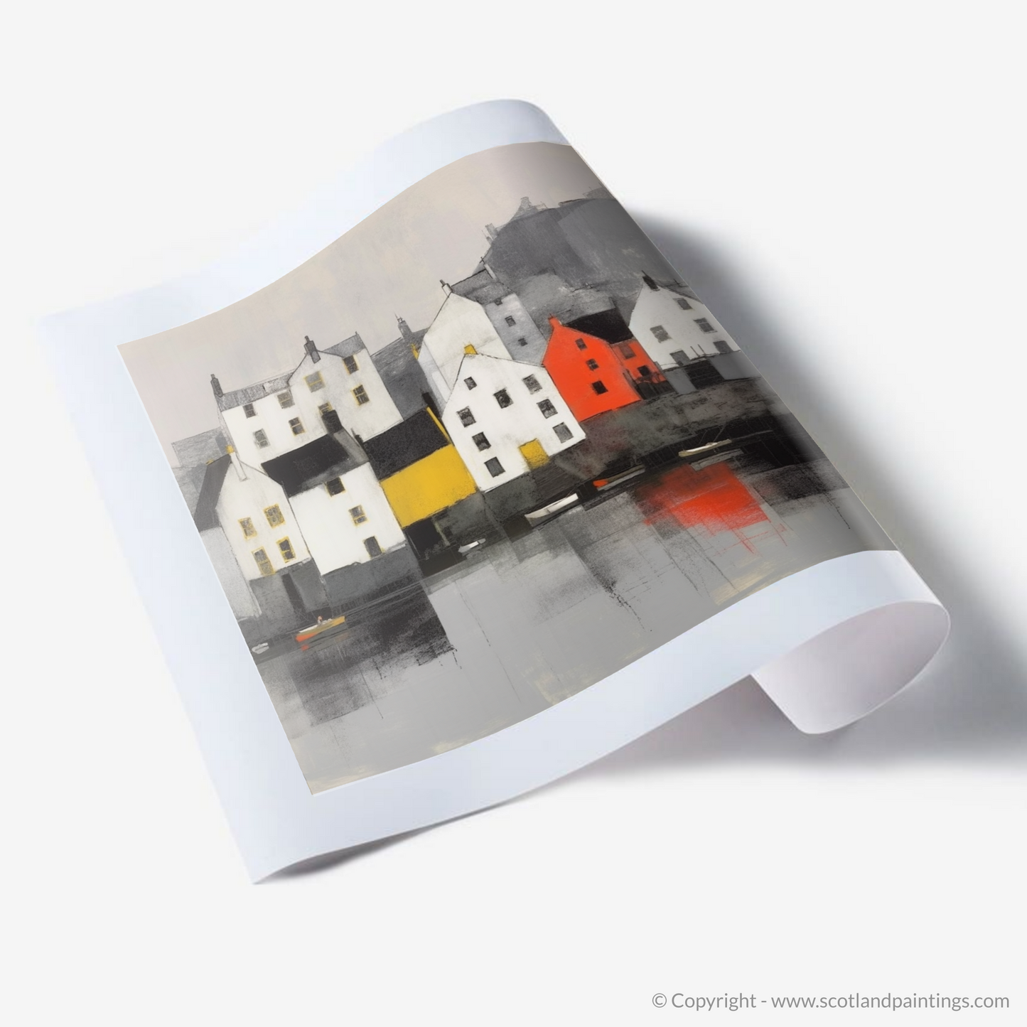 Immerse yourself in the serene beauty of one of Scotland's most picturesque harbours with this exquisite minimalist print. This piece encapsulates the tranquil essence of Portree Harbour on the Isle of Skye, distilling the quintessential charm of its waterfront into a harmony of pared-down forms and soothing colour contrasts.