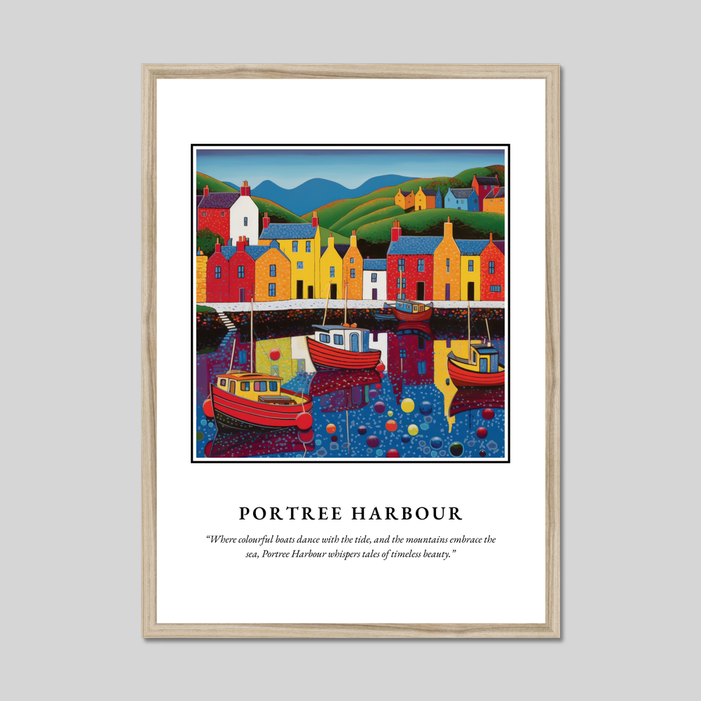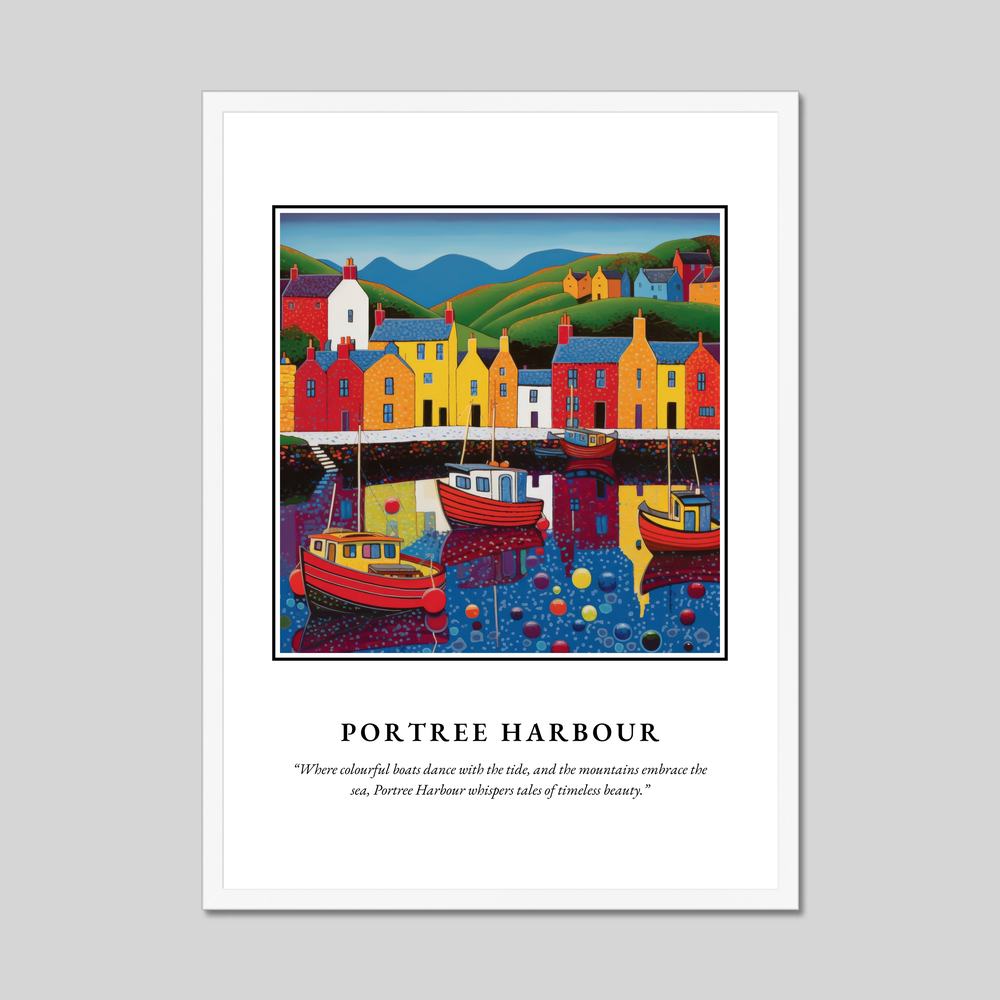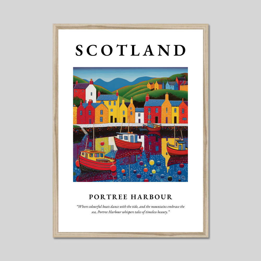 At the heart of the poster lies a vibrant Pop Art depiction of Portree Harbour. The word “SCOTLAND” dominates the top in bold lettering, while beneath, the painting bursts with dynamic colour and energy. The scene captures the lively essence of the harbour, where colourful boats seem to dance on the water's surface, and the towering mountains offer a gentle embrace to the serene sea. Below the painting, you’ll find the poetic line: “Where colourful boats dance with the tide, and the mountains embrace the sea, Portree Harbour whispers tales of timeless beauty.”