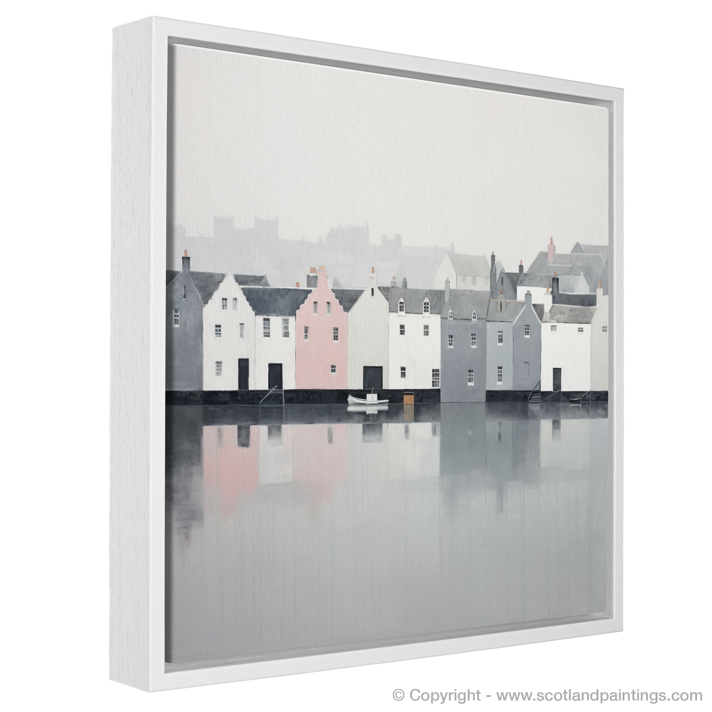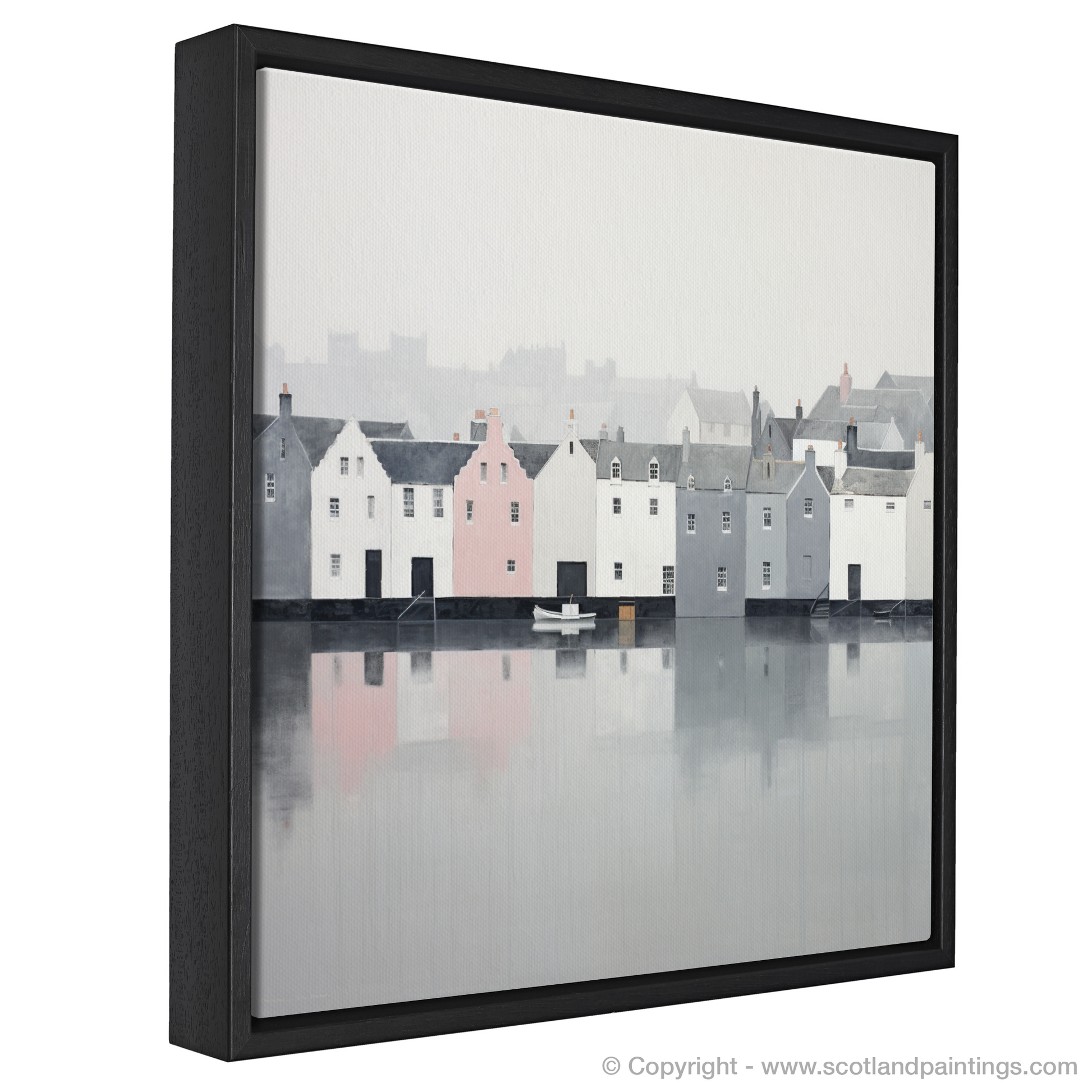 A mist gently shrouds the scene, lending an ethereal atmosphere to the waterfront. Echoes of pale greys, soft whites, and the faintest hints of colours suggest a quiet, early morning when the world is at peace. A singular blush of pastel pink on one of the houses softly punctuates the restrained colour palette, adding a whisper of warmth to the coolness of dawn.