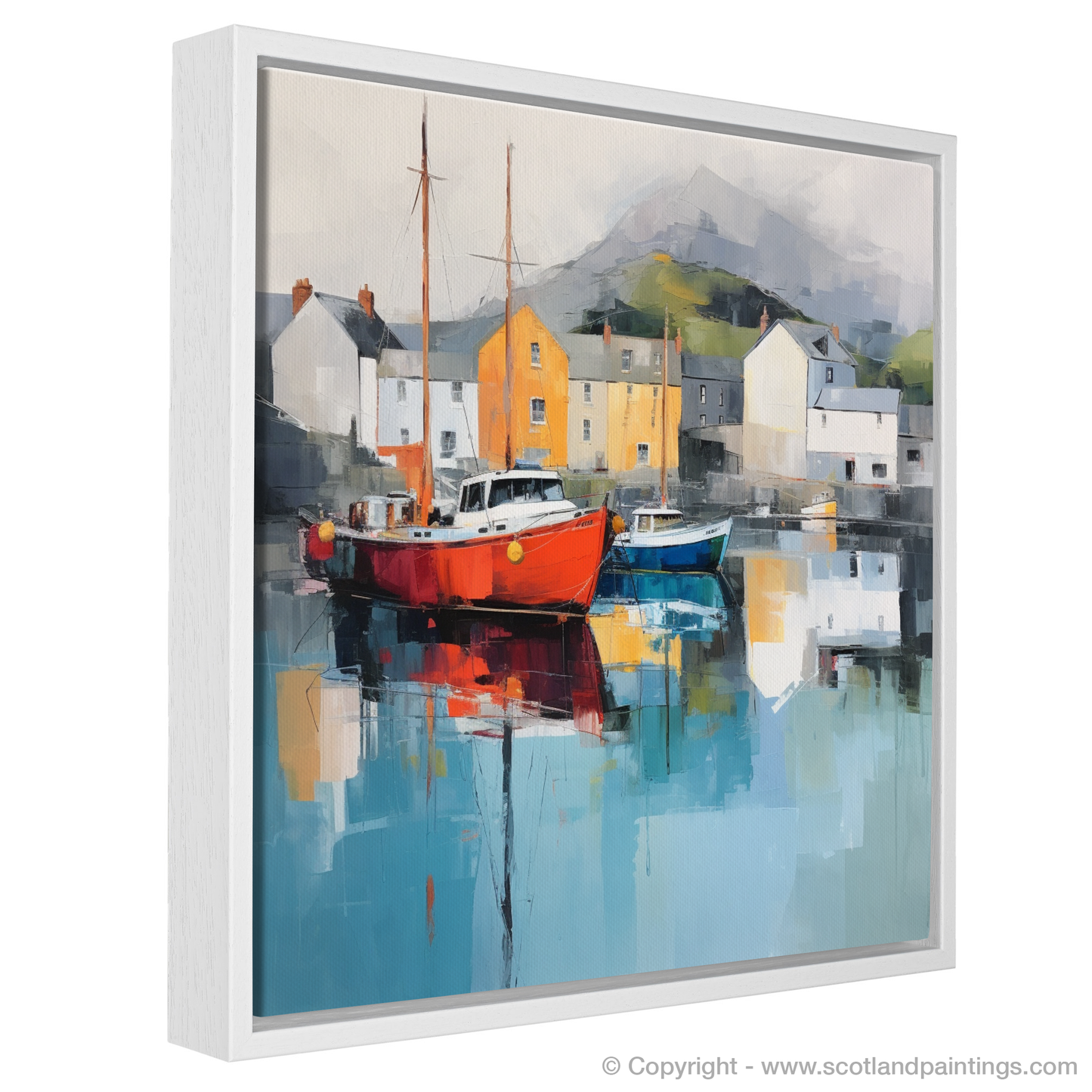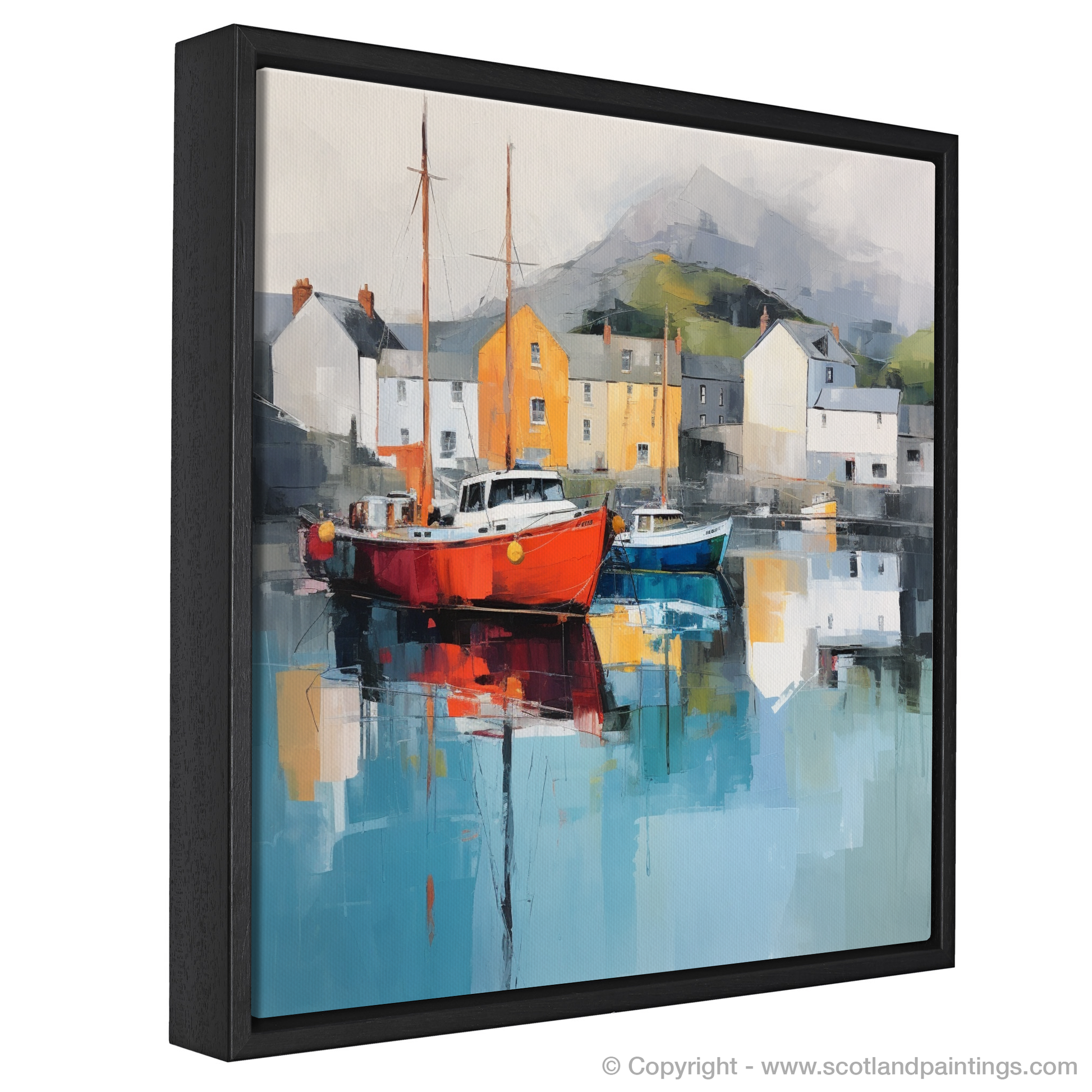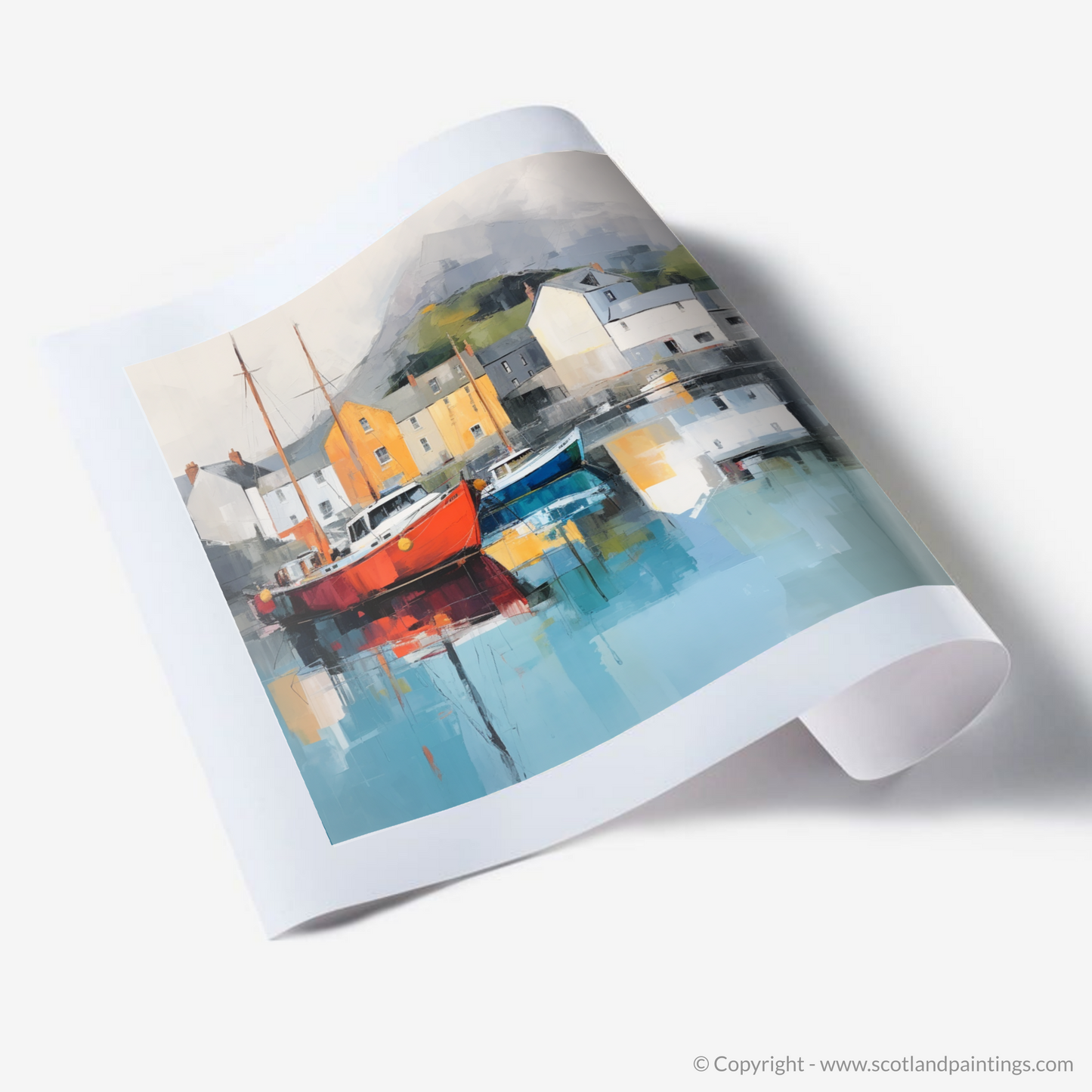 The artwork is an homage to the Color Field movement, characterized by large swathes of colour spread across the canvas, enveloping the senses. The dominating blues and greys reflect the resilient Scottish seascape, interrupted by a bold display of vivid oranges and yellows—colours that have come to symbolize the charming, picturesque houses that line the harbour. These colours splash vibrantly against the harbour's calm waters, creating an abstract reflection that invites contemplation.