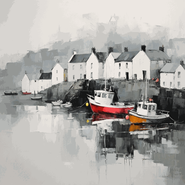 Clean lines and simplified forms are the hallmarks of the piece, capturing the charm of Portree without the clutter of intricate detail. Structured white houses with simple roofs line the quayside, their uniformity heralding a silent testament to the traditional Scottish building style. The muted backdrop of a mist-covered landscape suggests the mercurial Skye weather, lending depth and mystique to the scene.