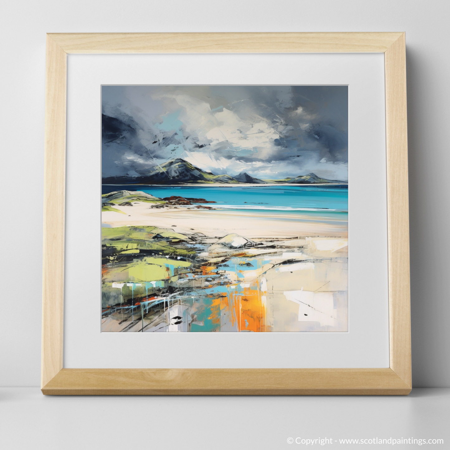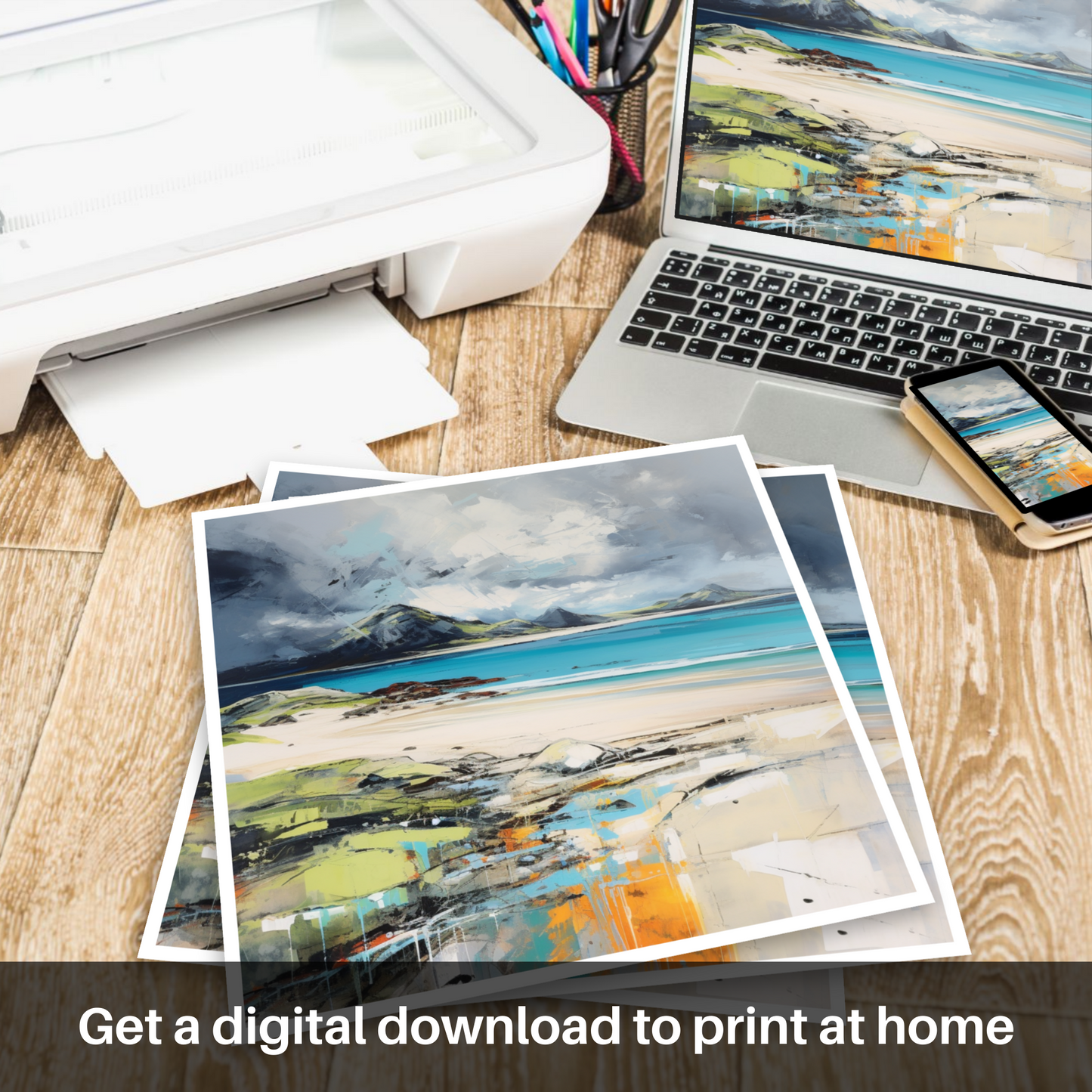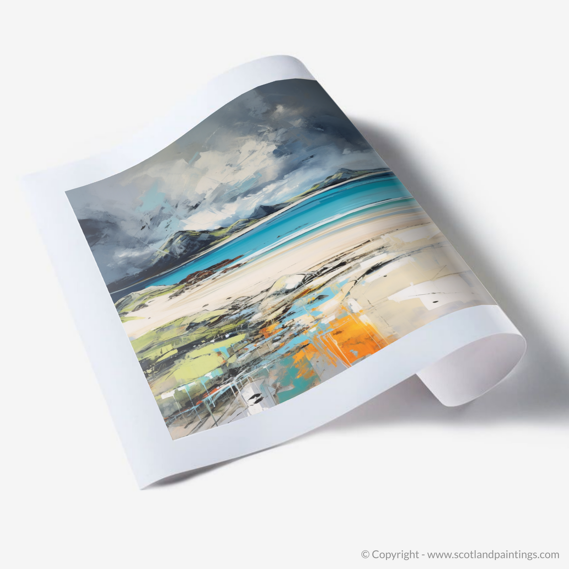 Immerse yourself in the raw beauty of Scotland's coastal embrace with our evocative print, inspired by the dramatic Camusdarach Beach. This piece masterfully captures the untamed essence of the Scottish shoreline through the abstract impressionist lens, igniting the imagination with a symphony of bold strokes and vivid colours.