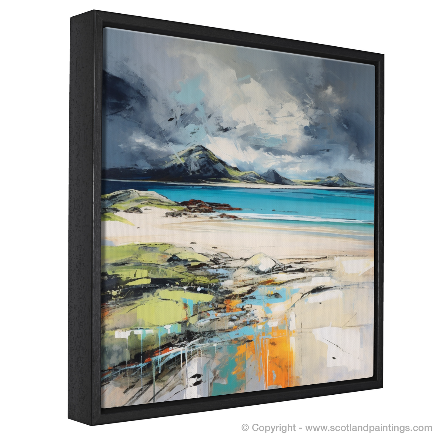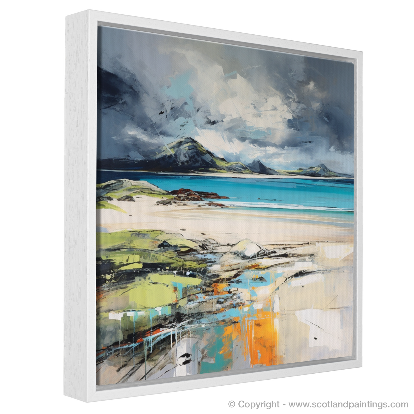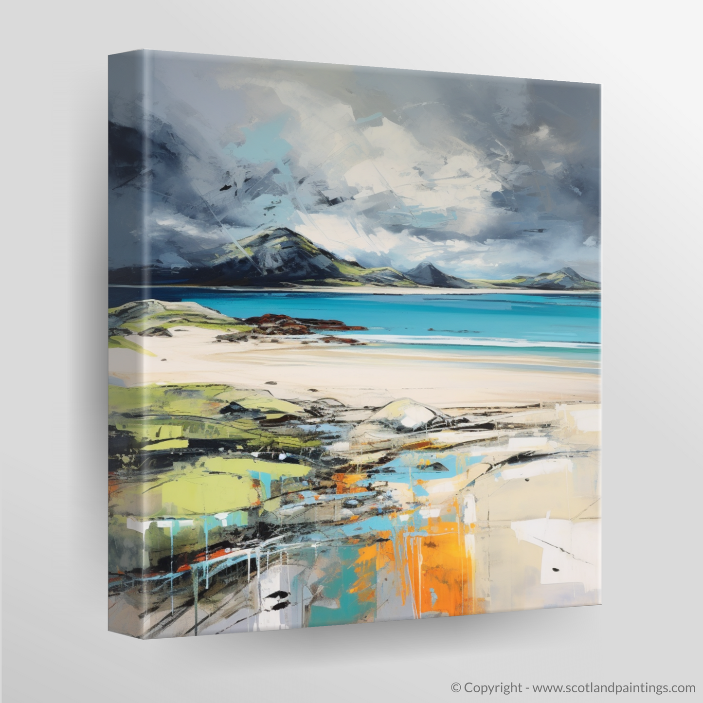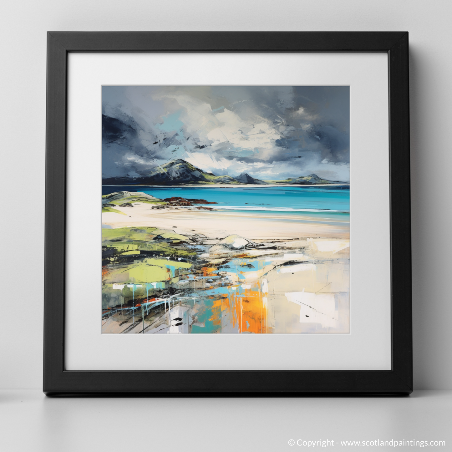 Immerse yourself in the raw beauty of Scotland's coastal embrace with our evocative print, inspired by the dramatic Camusdarach Beach. This piece masterfully captures the untamed essence of the Scottish shoreline through the abstract impressionist lens, igniting the imagination with a symphony of bold strokes and vivid colours.