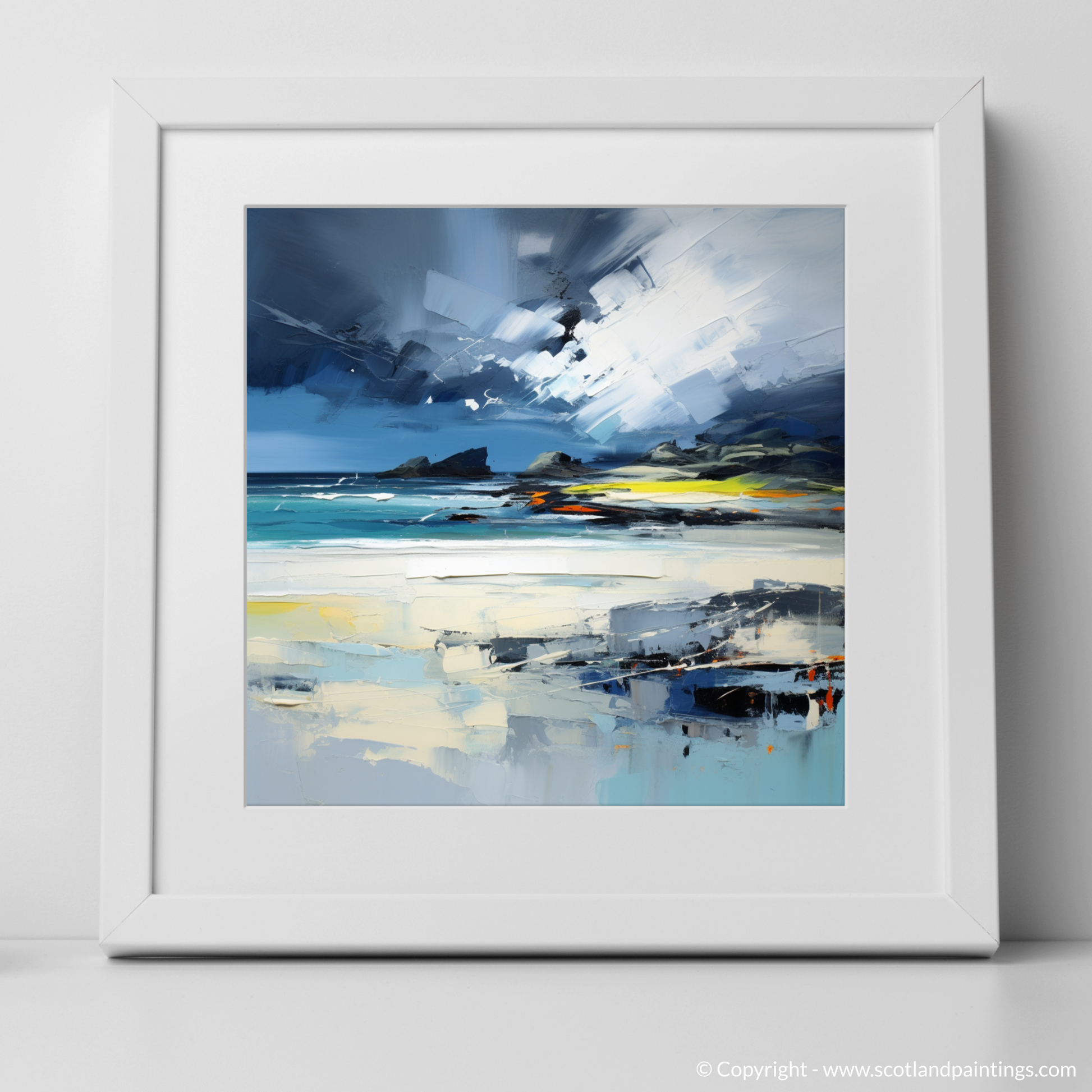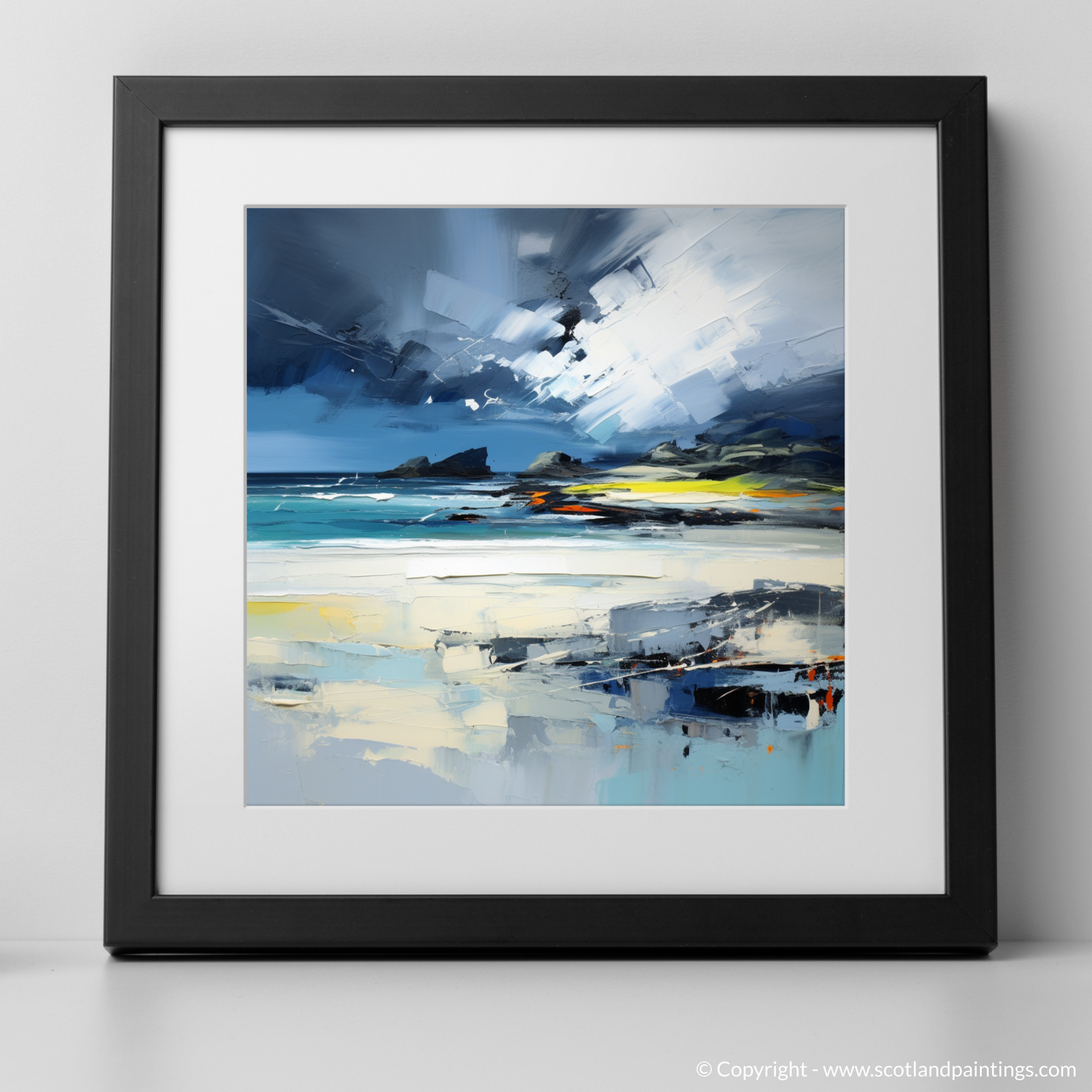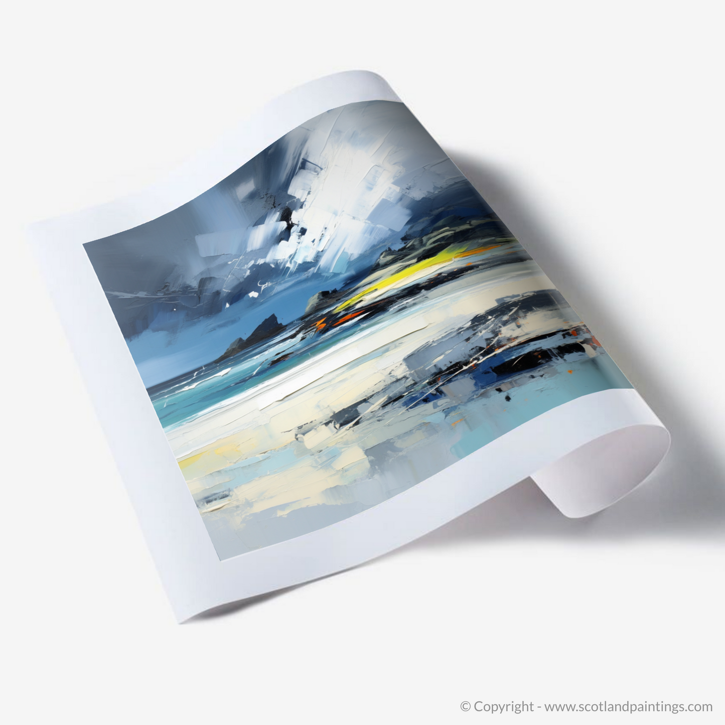 Escape into the tempestuous beauty of the Scottish coasts with this evocative print that captures the untamed spirit of Camusdarach Beach. Bold strokes and an expanse of hues bring to life a scene where the brooding energy of a storm meets the serene majesty of the shore. Slate greys and deep blues blend into a dynamic sky, the paint applied with an abandon that mirrors the wild dance of the elements above.