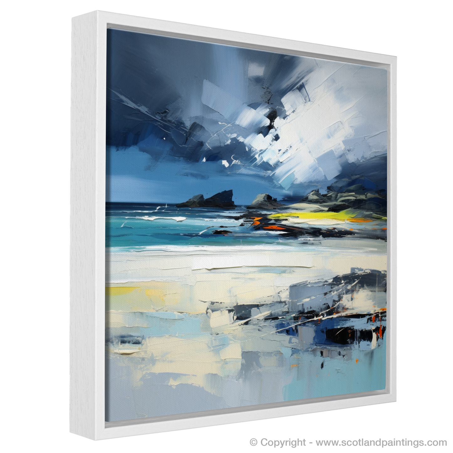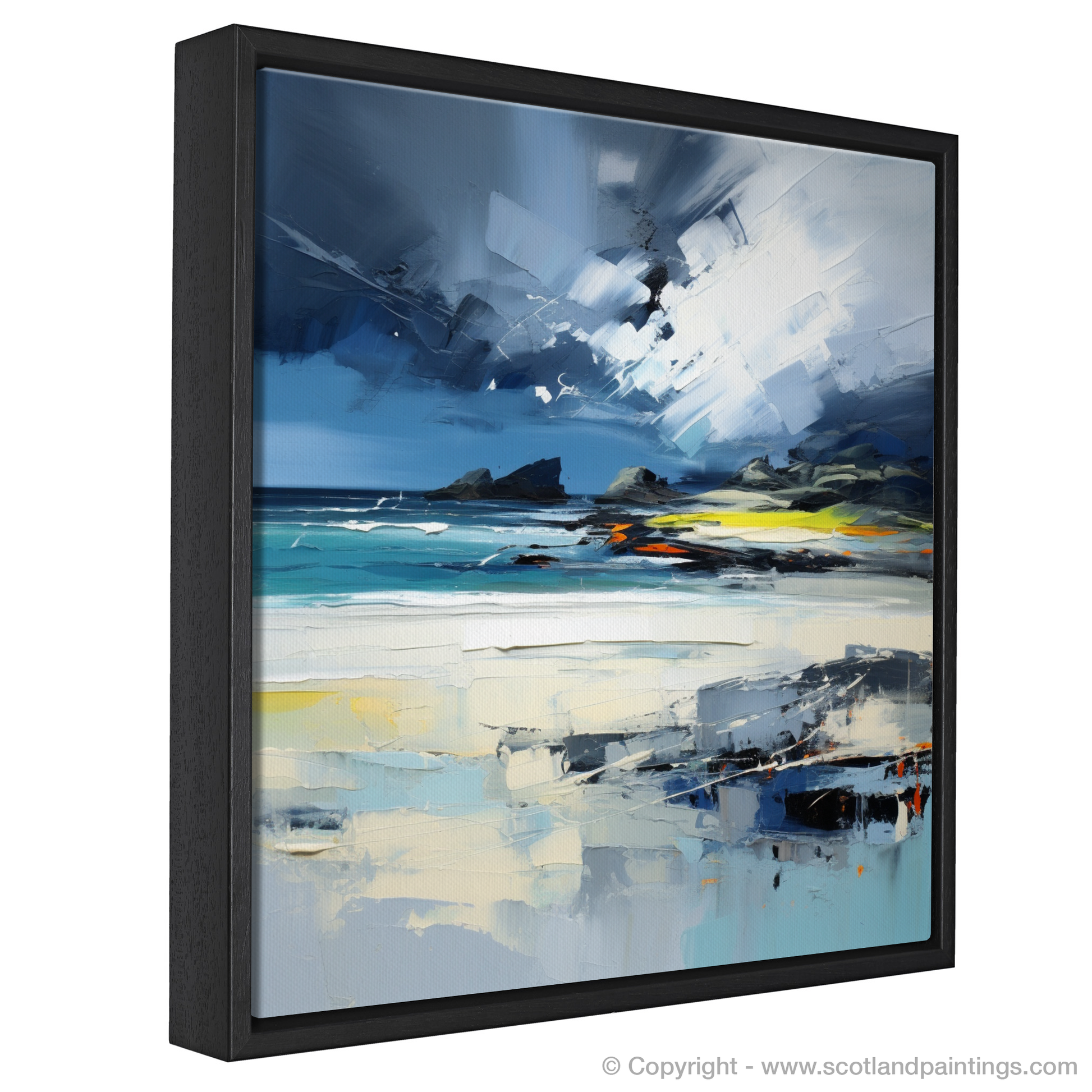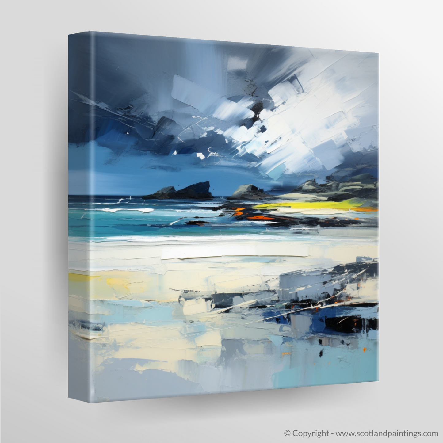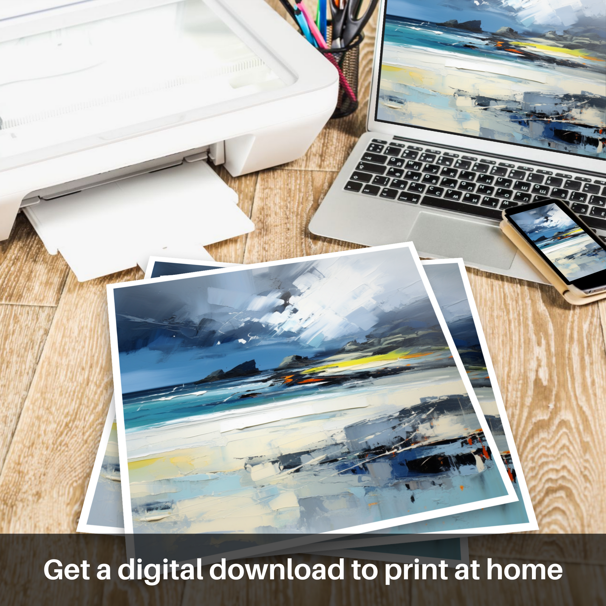 Escape into the tempestuous beauty of the Scottish coasts with this evocative print that captures the untamed spirit of Camusdarach Beach. Bold strokes and an expanse of hues bring to life a scene where the brooding energy of a storm meets the serene majesty of the shore. Slate greys and deep blues blend into a dynamic sky, the paint applied with an abandon that mirrors the wild dance of the elements above.