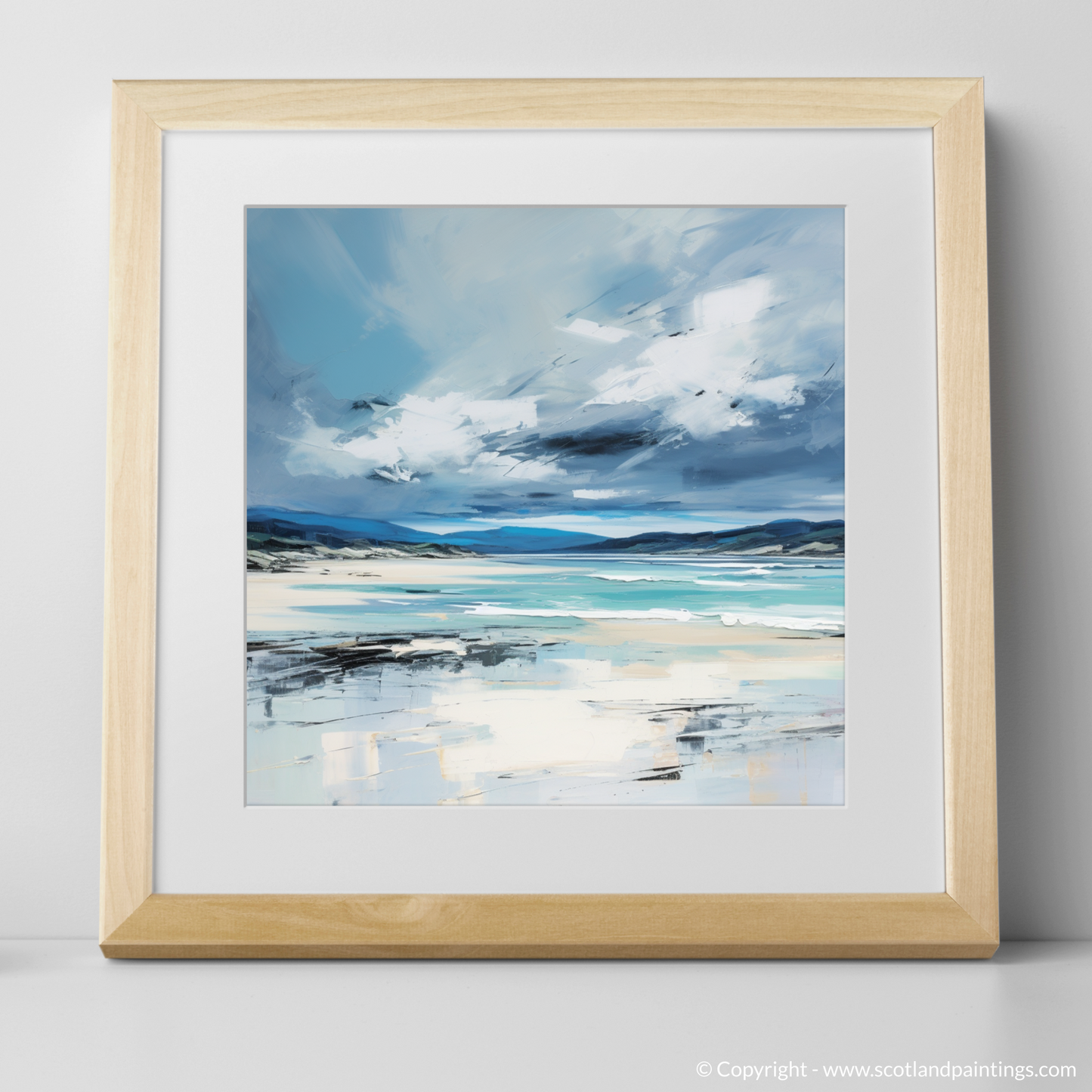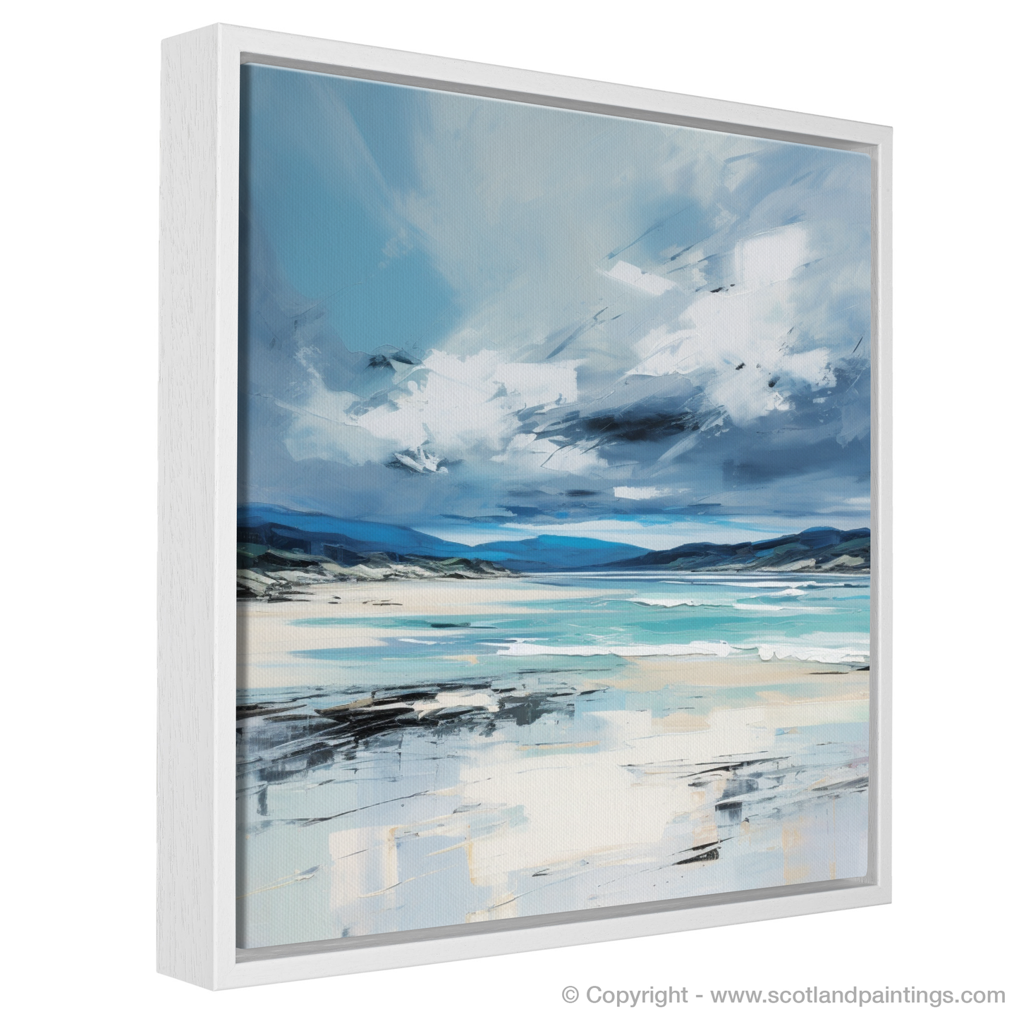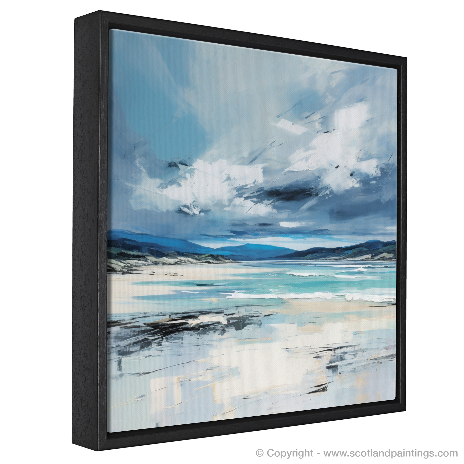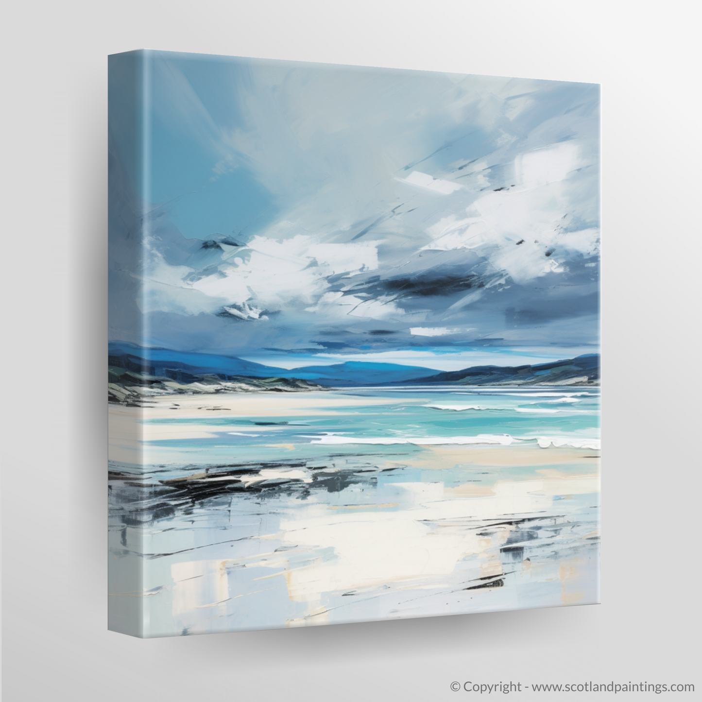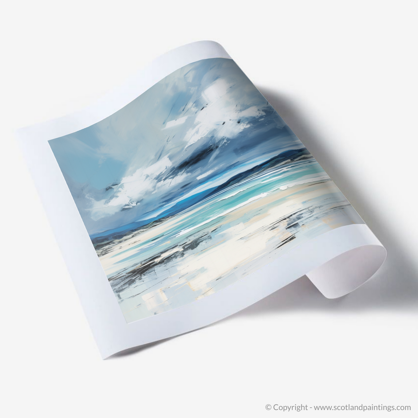 Let the essence of Scotland's rugged coastlines wash over you with this stirring abstract interpretation of Camusdarach Beach under a tempestuous sky. The turbulent heavens dominate the upper expanse of the canvas, a dramatic dance of deep greys and whites, suggesting the untamed movement of clouds as they swirl over the distant horizon.