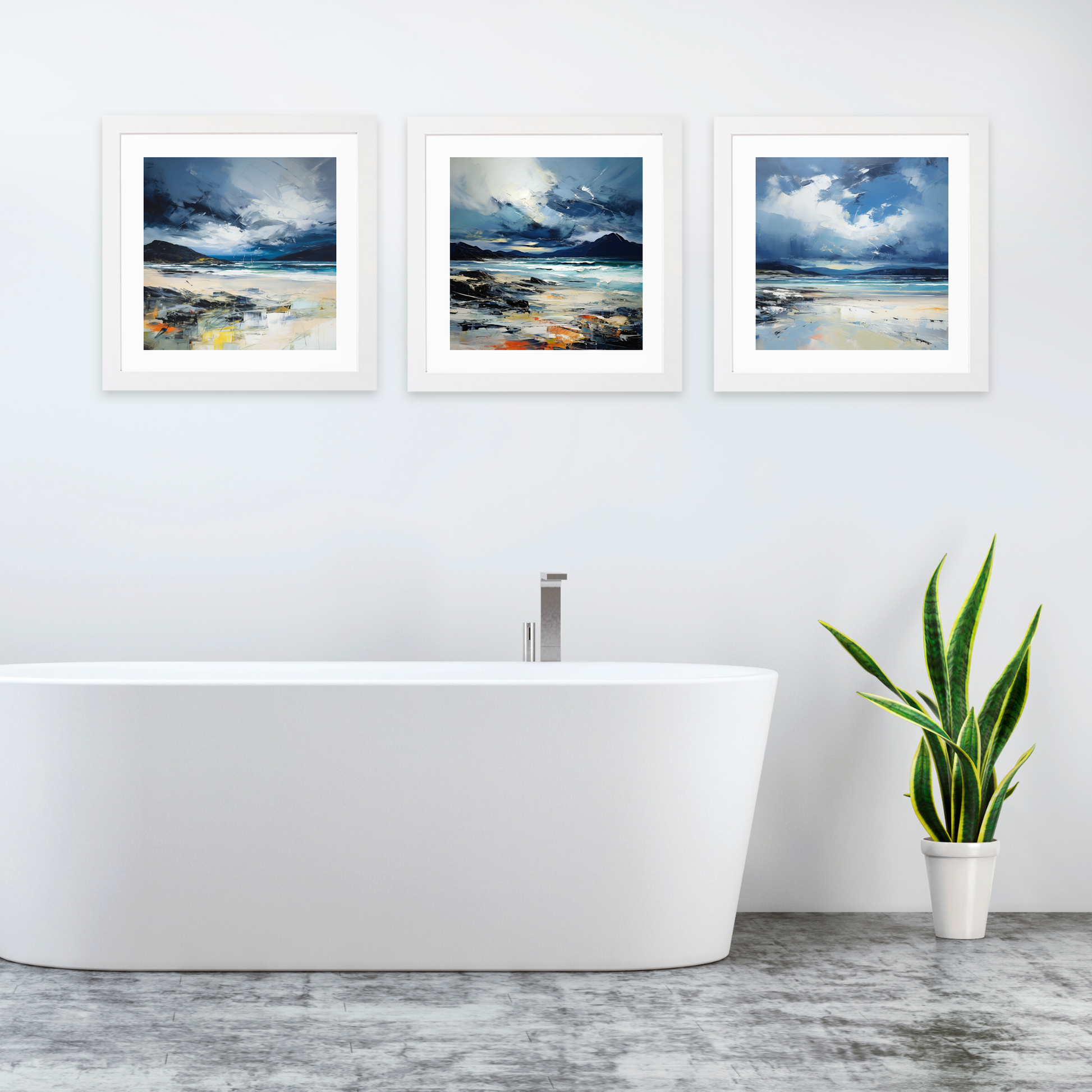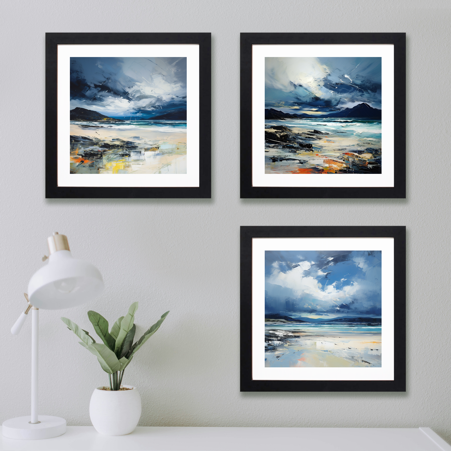 Each artwork vividly conveys the dynamic interplay between the tumbling waves and brooding clouds over Camusdarach’s silken sands. The strokes across these pieces hint at the ever-changing moods of the sea and sky, highlighted by an engaging palette of ocean blues, dusky greys, and the muted whispers of golden sands. Together, these prints form a cohesive narrative that speaks to the heart of Scotland’s untamed coastal landscape.