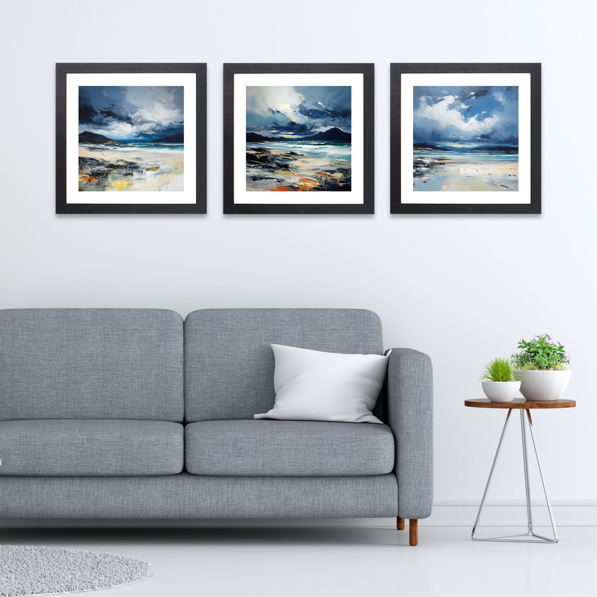 Introducing an exquisite set of three framed prints from the Scottish Beaches collection, now available on ScotlandPaintings.com. These captivating paintings capture the raw beauty of Camusdarach Beach beneath a stormy sky, offering an enchanting blend of drama and tranquillity that beckons the imagination. The set, with its truly evocative and immersive portrayal of Scotland's rugged coastline, draws you into a scene where nature’s raw power meets serene, untouched beauty.