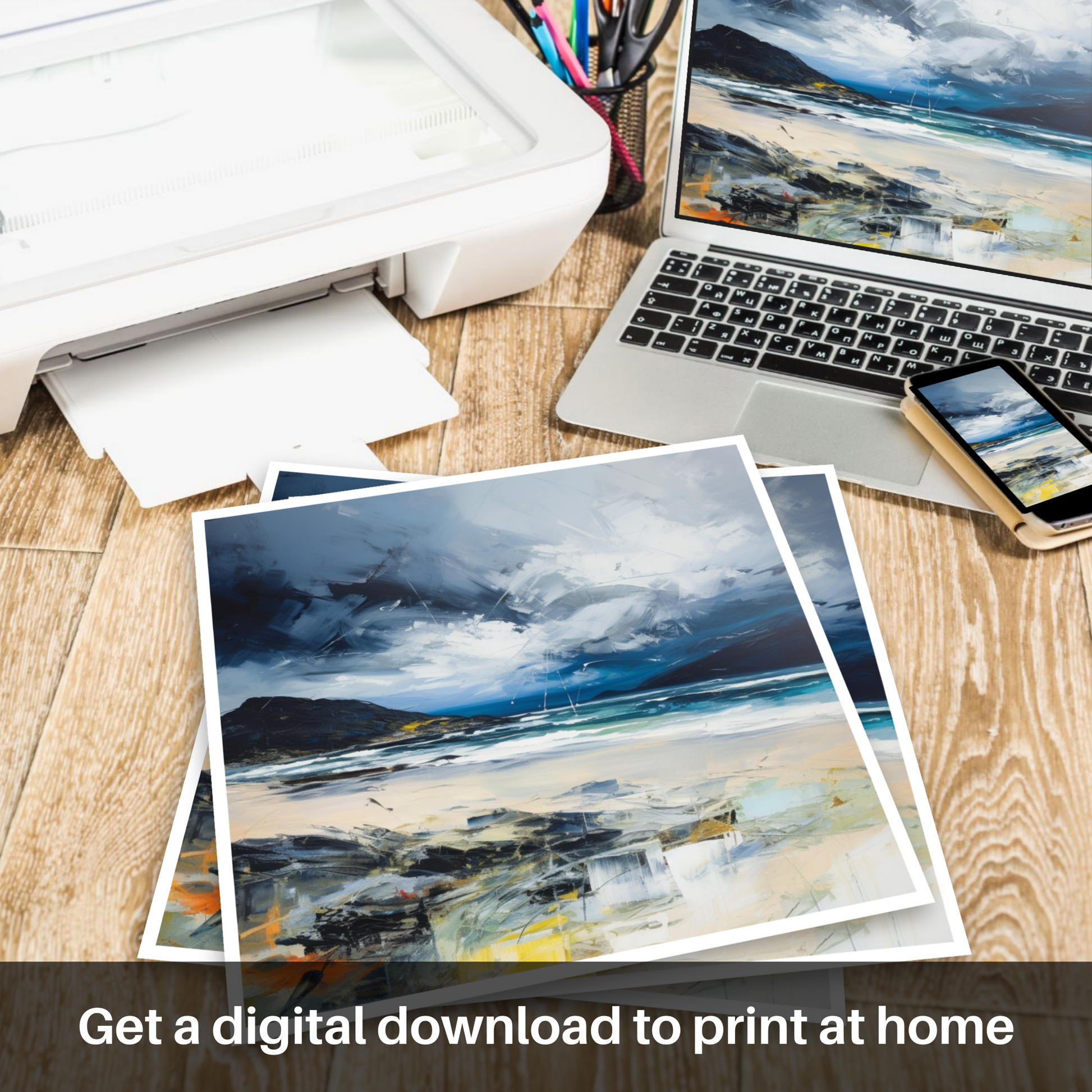 This print from our 'Scottish Beaches' collection will not only serve as a captivating focal point in any space but also as an enduring emblem of nature's dramatic spectacle. For lovers of art that conveys emotion and atmosphere through bold, expressive techniques, this stirring representation of Camusdarach Beach is a testament to the power of the elements and the allure of the Scottish shores.