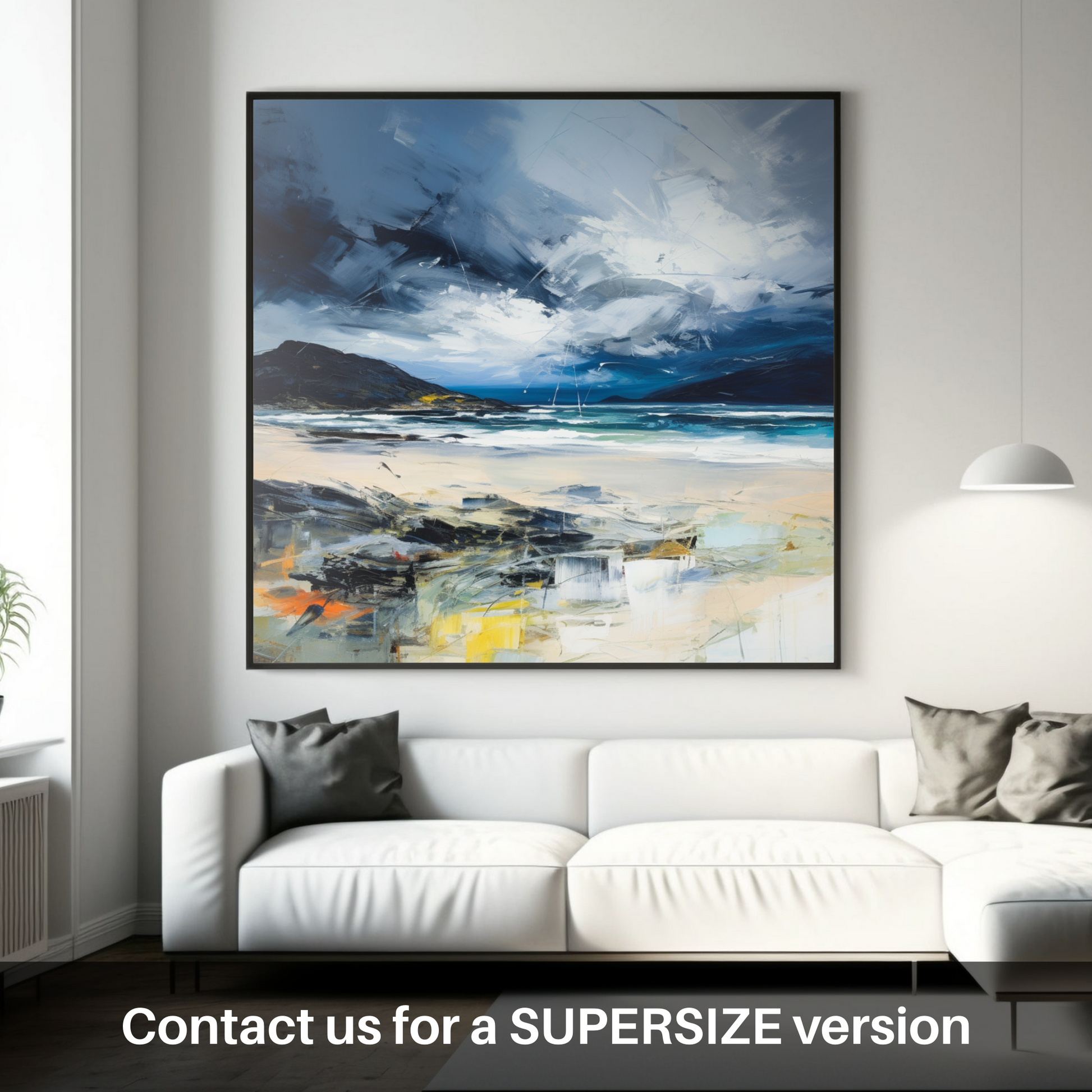 Immerse yourself in the untamed beauty of the Scottish coast with our evocative print, capturing the essence of Camusdarach Beach on a day when the heavens themselves seem to brood with intensity. Swathes of stormy blues and moody greys swirl across the canvas, echoing the tumultuous skies above, while the wild ocean below shimmers with fleeting glimpses of turquoise and white, hinting at the ceaseless movement of waves.