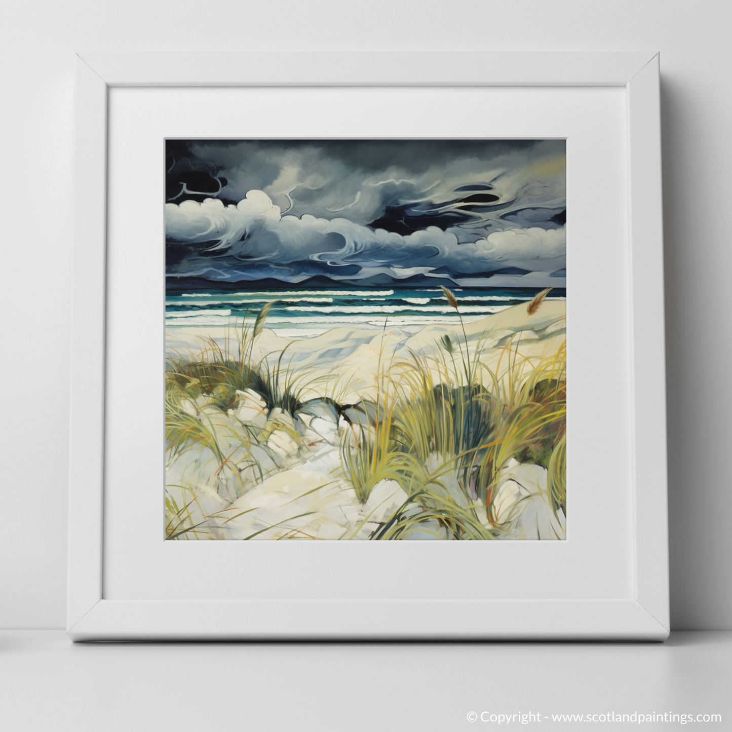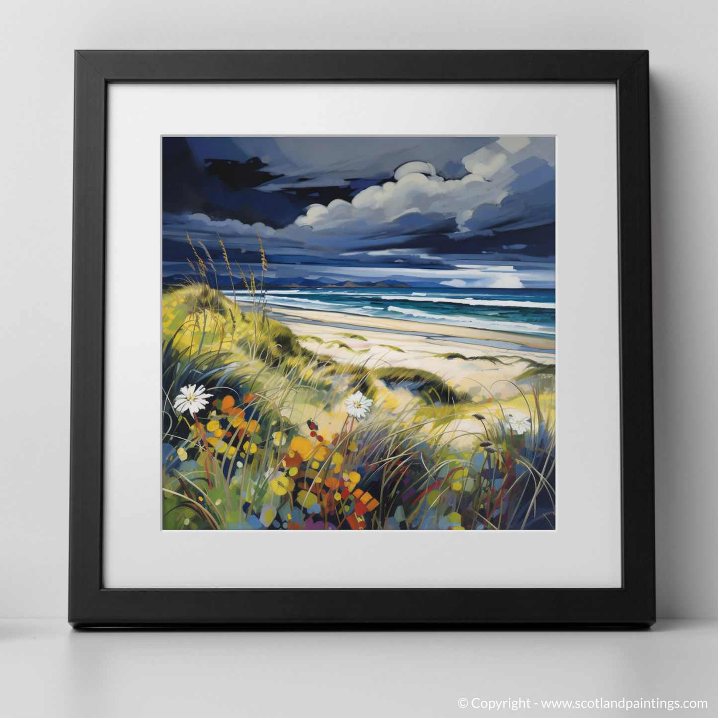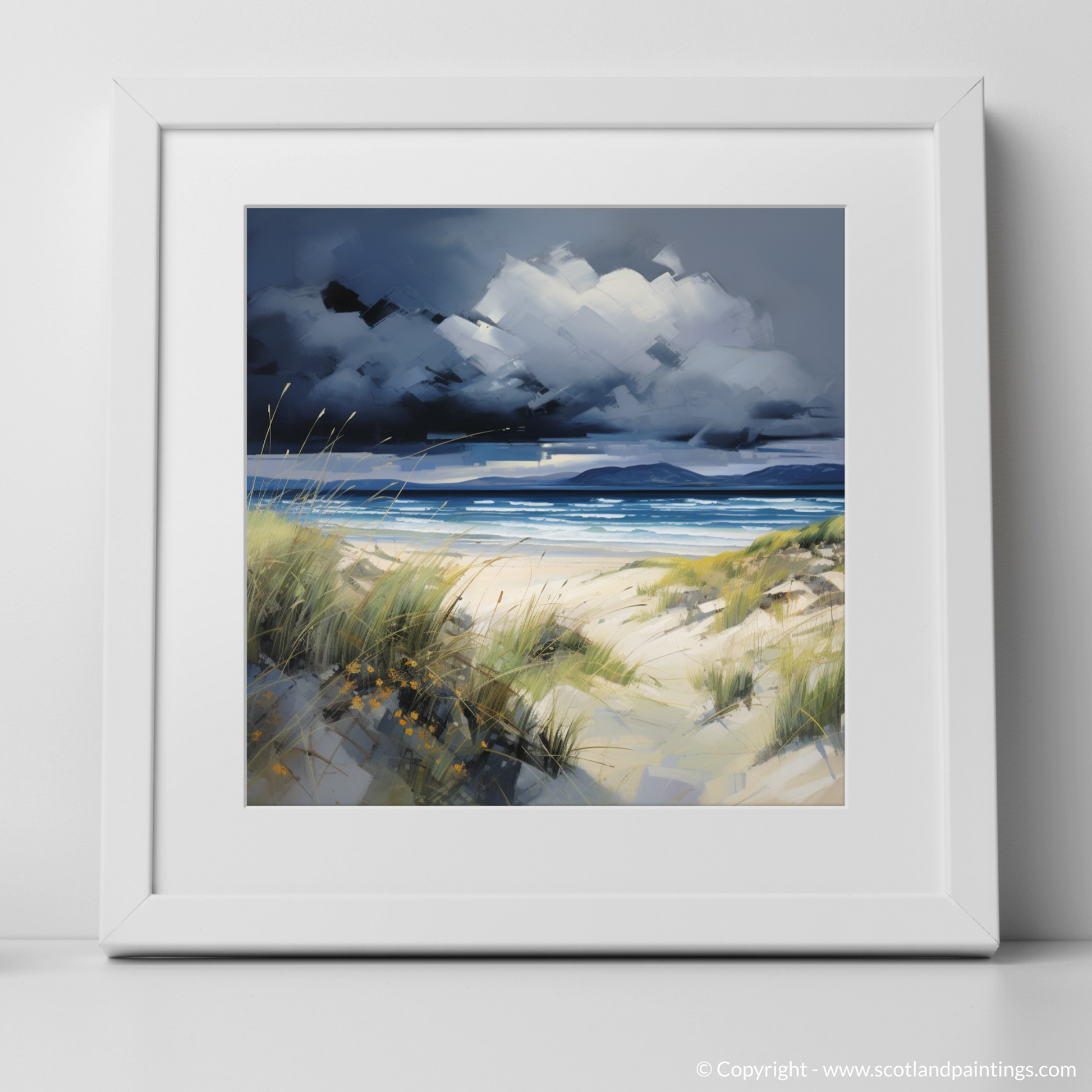 Camusdarach Beach, renowned for its stunning views and tranquil ambience, is vividly depicted in these prints. Situated on Scotland’s rugged west coast, the beach is a pristine haven where golden sands meet turbulent waters, and nature’s power is on full display beneath a dramatic sky. The artwork reflects this extraordinary setting, capturing the essence of a place that has captivated visitors for generations with its wild beauty and timeless charm.