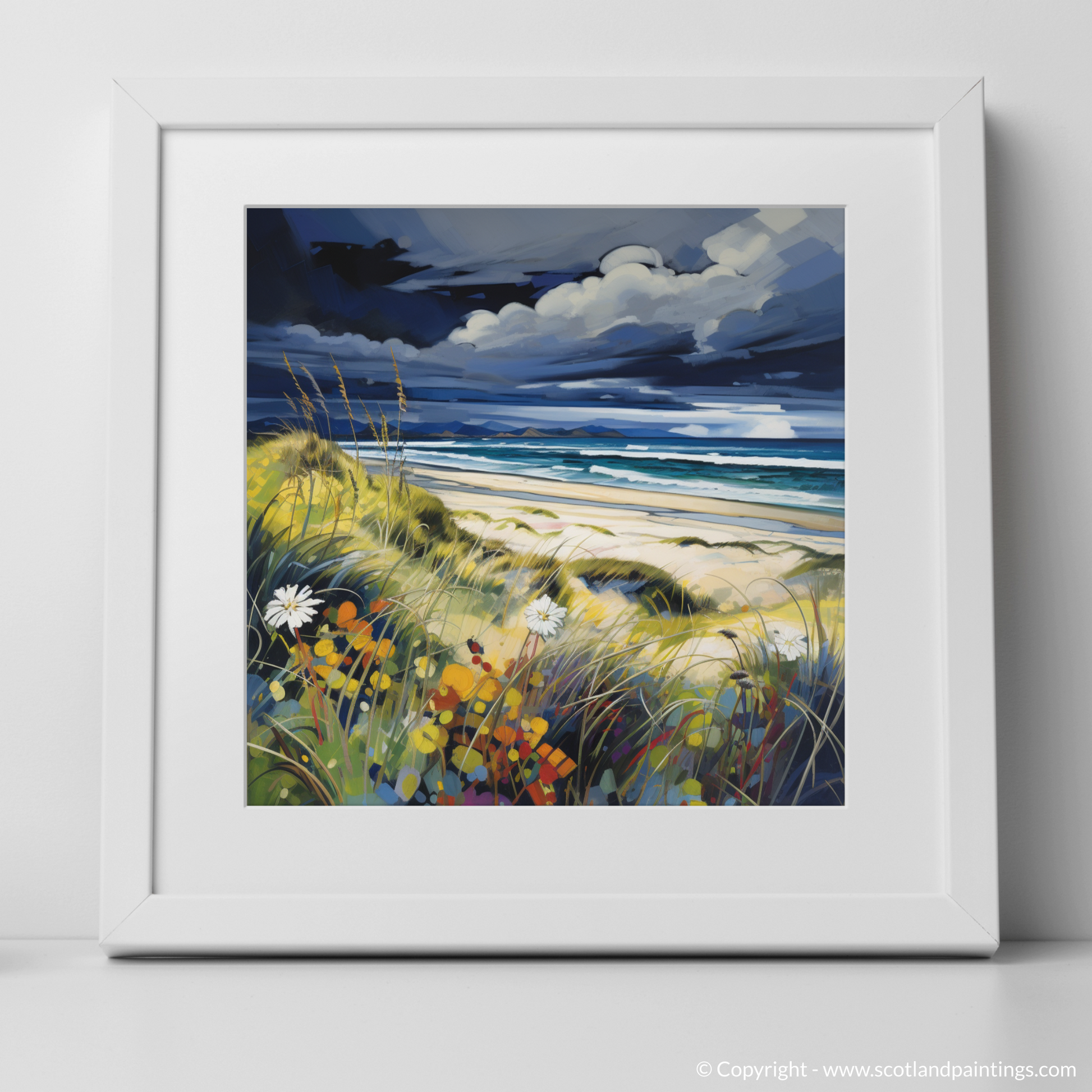 In the foreground, wild grasses and bursts of wildflowers dance vivaciously to the rhythm of the wind, dotted with an array of energetic colours ranging from sunshine yellows to deep, passionate reds. Dabs of expressive whites replicate the delicate blooms that scatter the sand dunes, creating a stunning contrast to the deluge of colour around them.