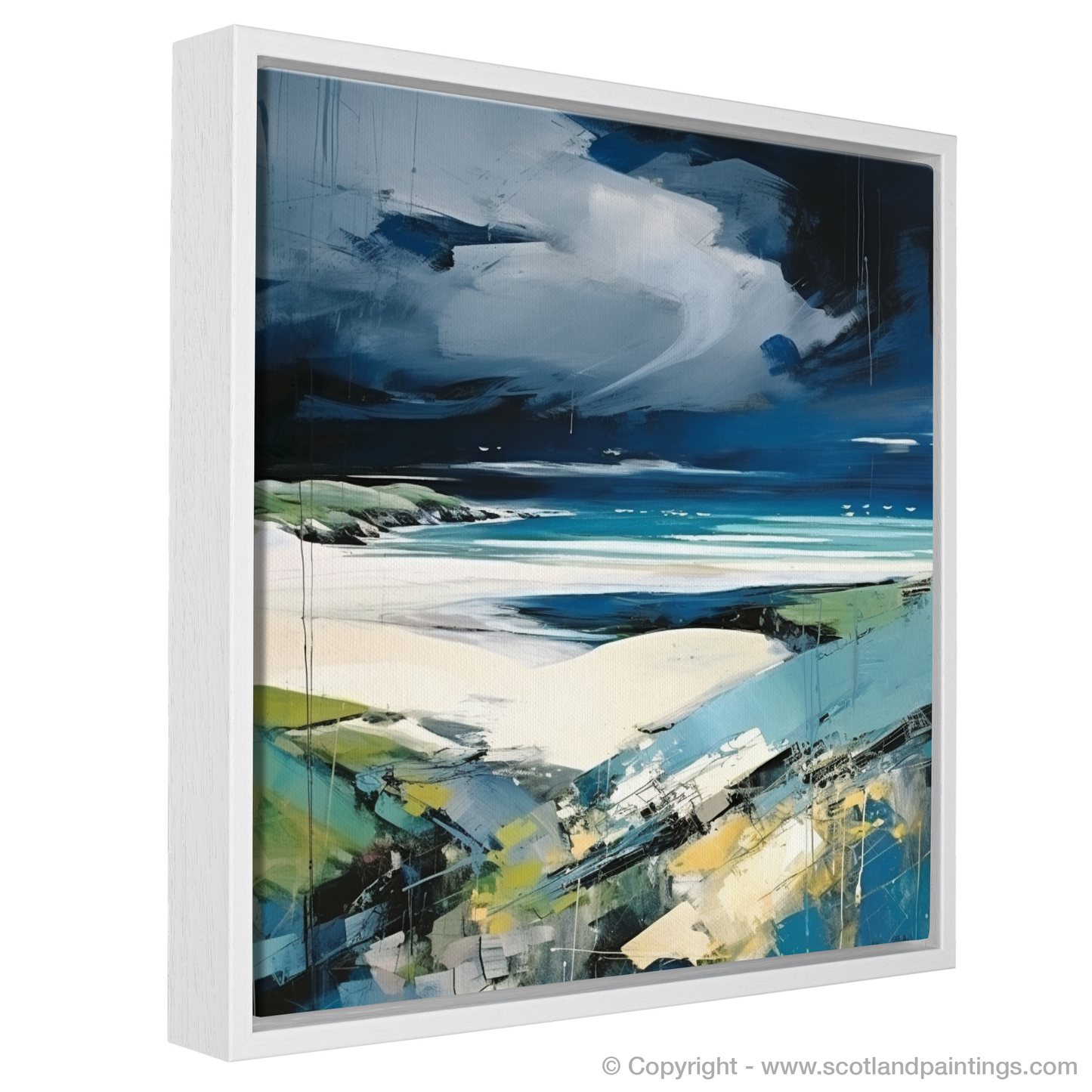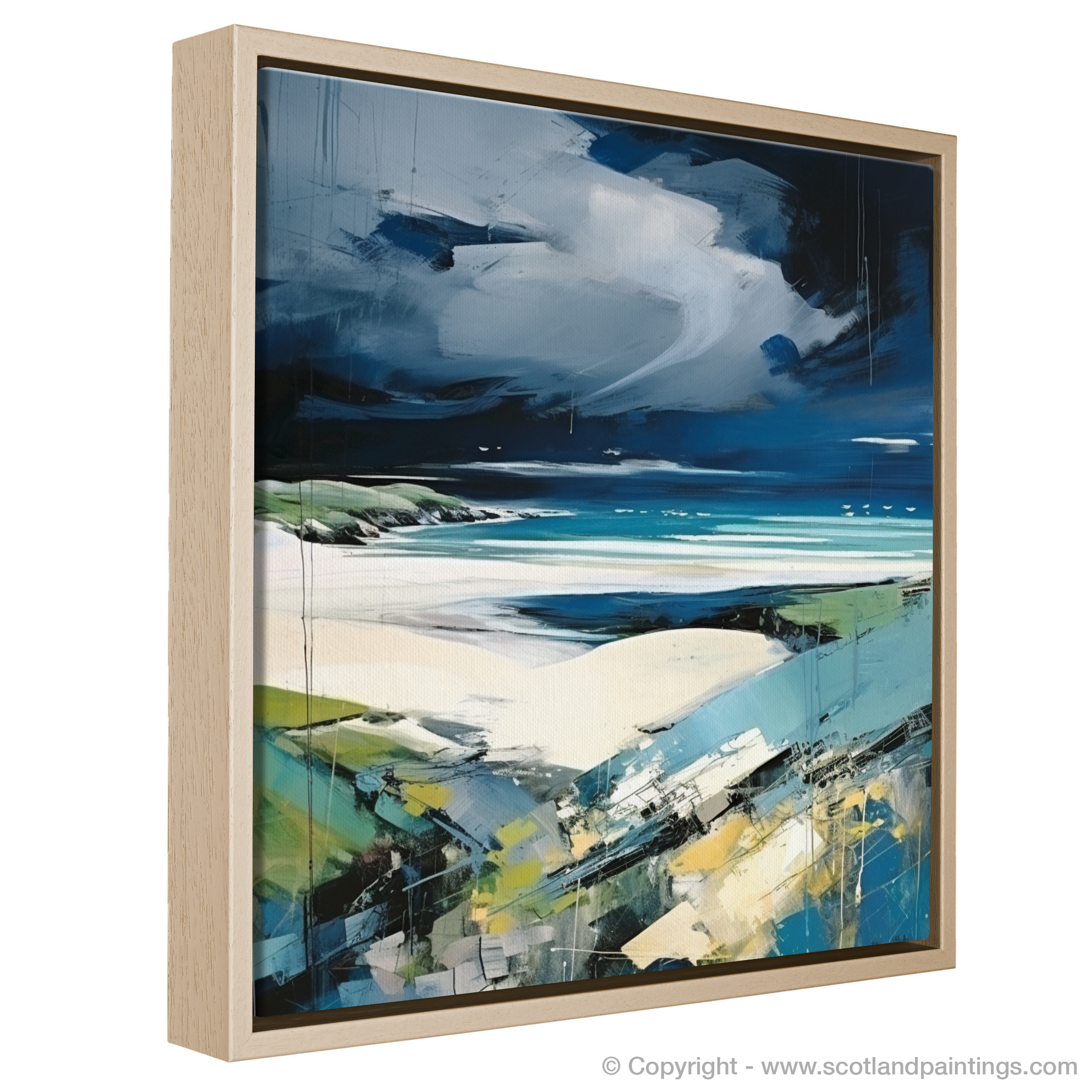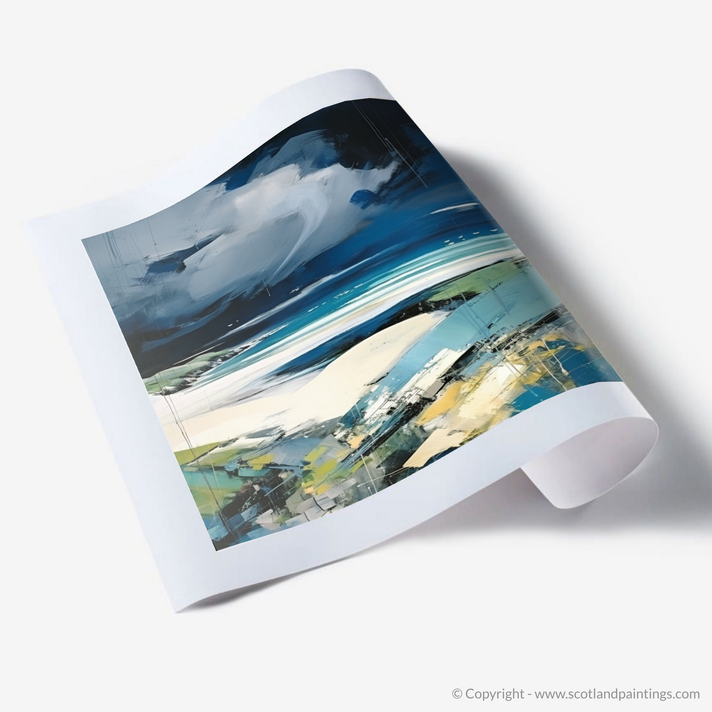 As moody skies brood over the serene Camusdarach Beach, this abstract impressionist print captures the tumultuous spirit of Scotland's natural beauty. It evokes an emotional response, representative of the unpredictable climate where land and sea meet under the watchful eye of the heavens.