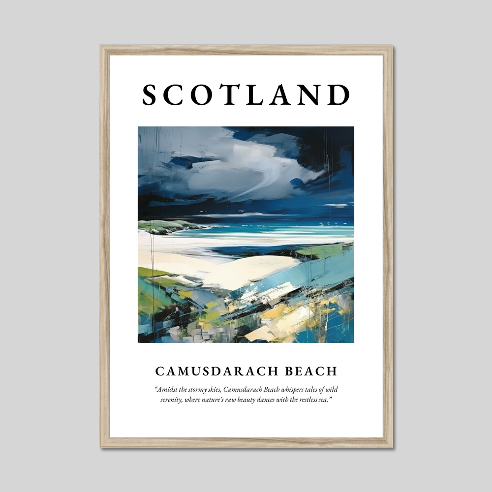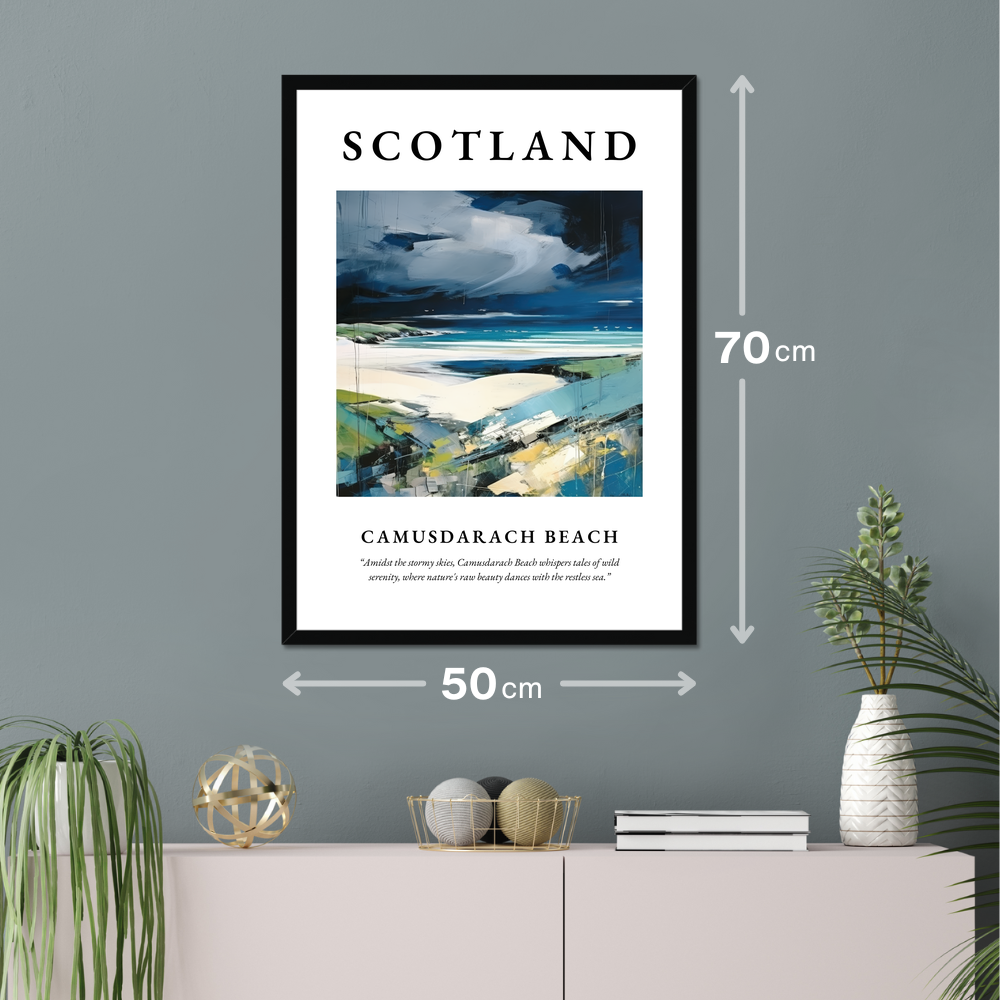 Embark on a visual journey to the untamed coasts of Scotland with our breathtaking framed poster print, showcasing the captivating allure of Camusdarach Beach. Measuring an impressive 50cm x 70cm, this exquisite art piece is designed to command attention and bring the raw beauty of the Scottish seaside into your home.