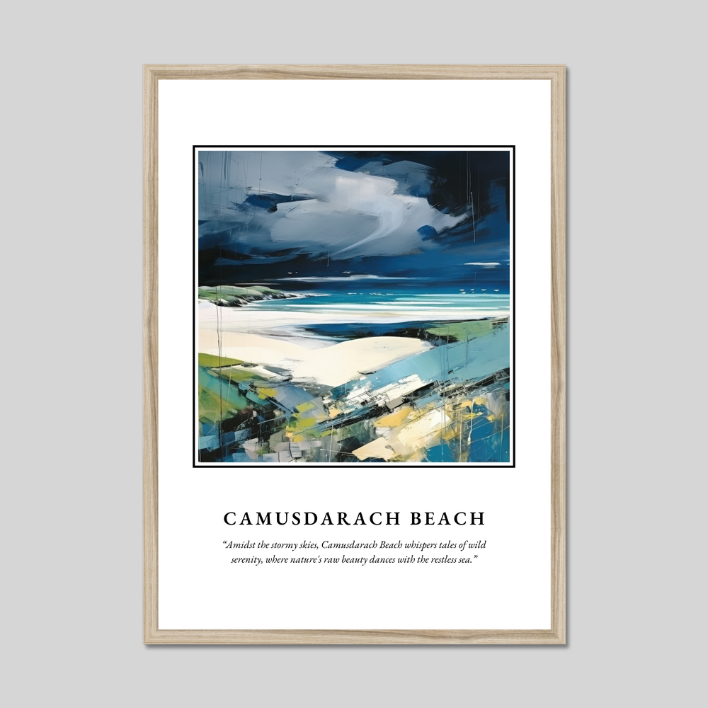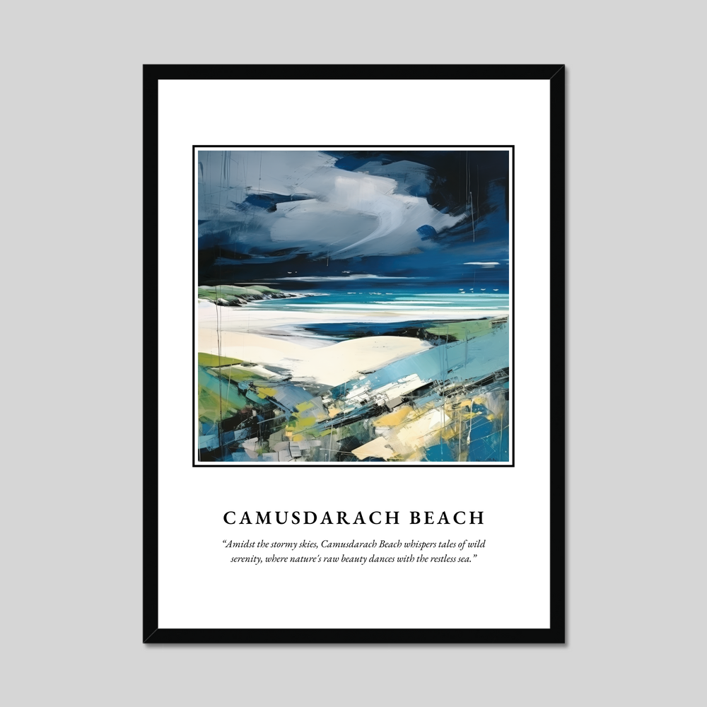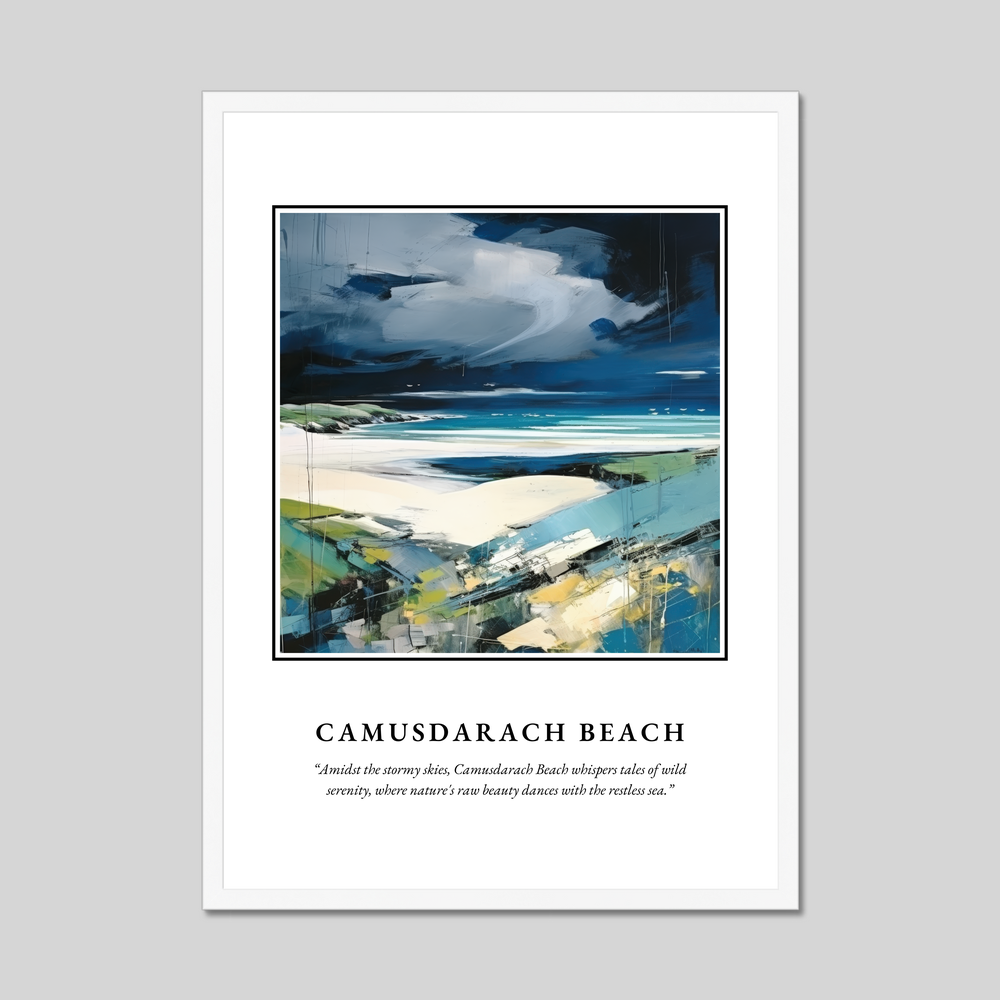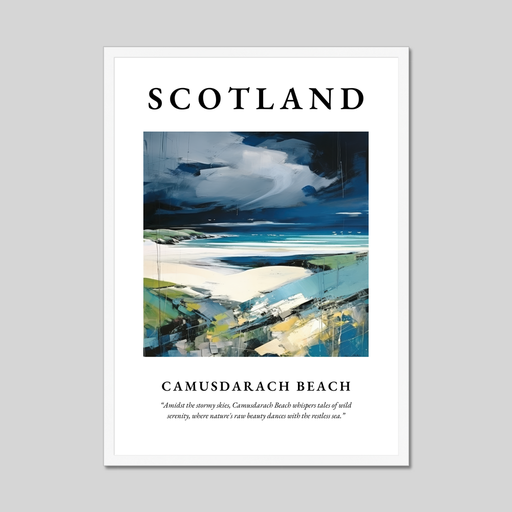 Beneath the painting, the whisper of a quote further draws you into the magic of this coastal escape: “Amidst the stormy skies, Camusdarach Beach whispers tales of wild serenity, where nature's raw beauty dances with the restless sea.” This poetic touch echoes the pulse of the place, resonating with those who treasure Scotland’s untamed splendour or who harbour nostalgic memories of tranquil walks along its shores.