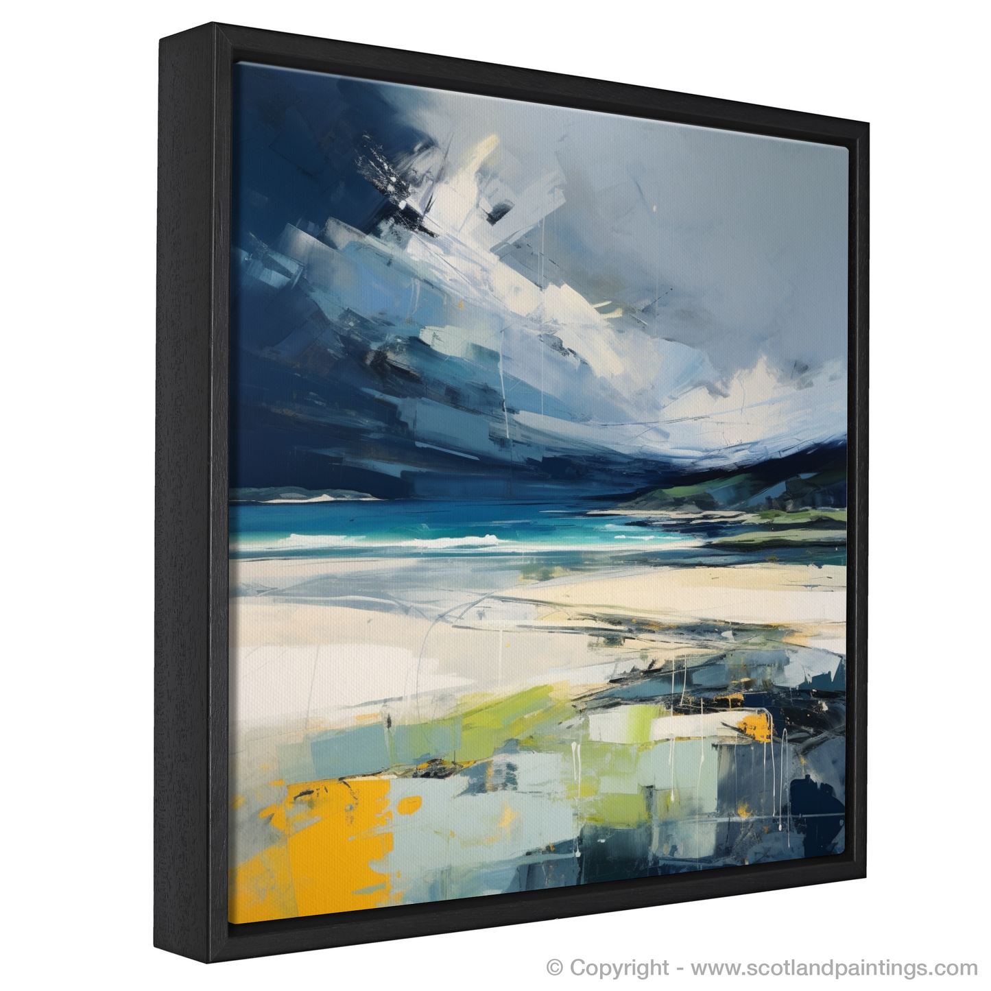 A stark contrast to the brooding heavens, the beach itself is rendered in bright, refreshing hues. The cerulean and turquoise of the sea churn with an inner light, an almost tangible salute to the wild waters of the Scottish coast. Flecks of white and pale blue animate the surface, hinting at the capricious play of light on the waves. The shoreline is a spectrum of pale sand tones, interspersed with the striking pops of yellow and deep green, suggesting a landscape rich with grasses and wildflowers, resilient against the coastal winds.