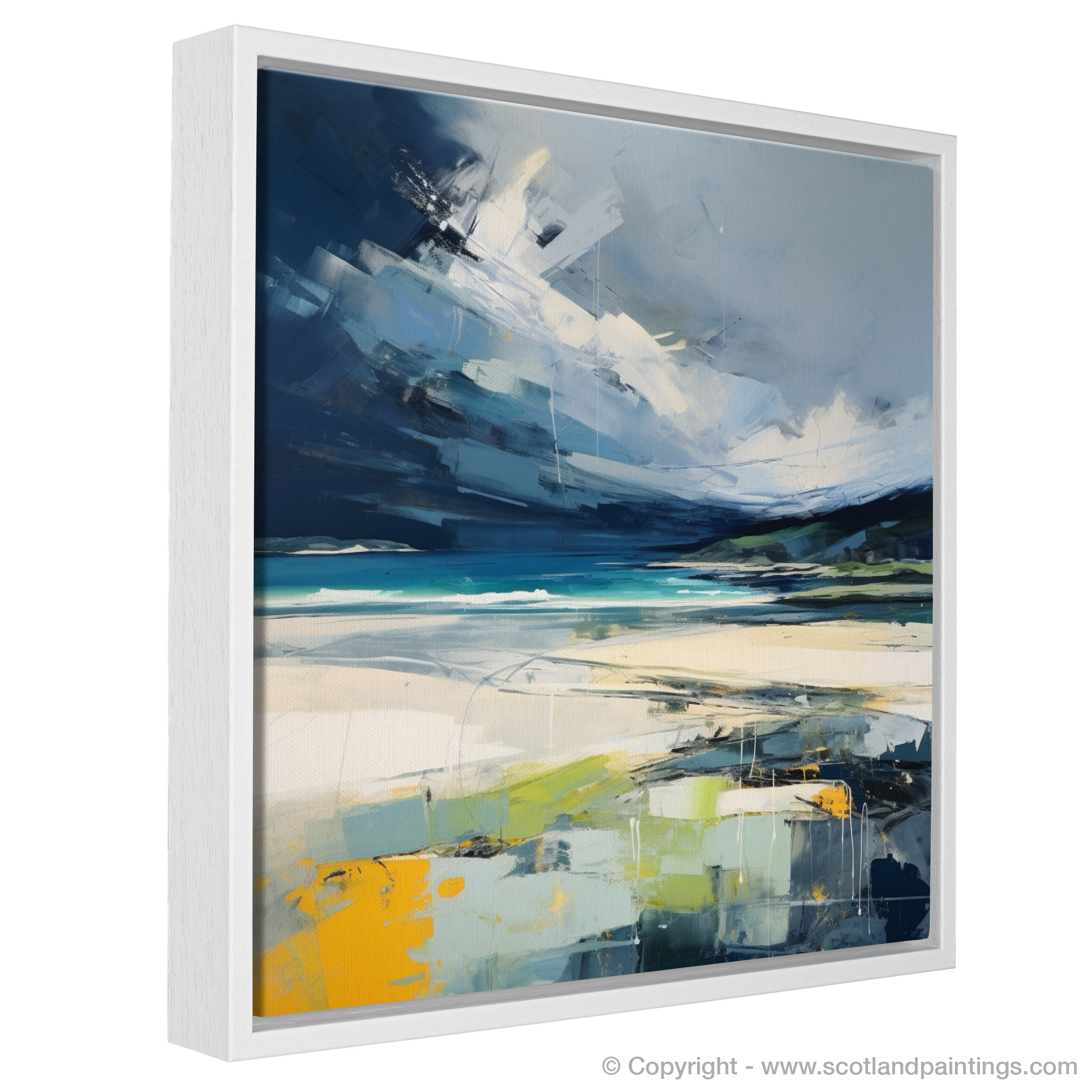 Immerse yourself in the tempestuous beauty of Scotland's natural landscapes with this evocative print. Captured in the essence of Abstract Impressionism, this piece embodies the dynamic and untamed spirit of Camusdarach Beach under a stormy sky. Broad, sweeping gestures of white and grey dominate the upper portion of the canvas, simulating the tumultuous movement of clouds as they race across the firmament, their shadows casting an imposing atmosphere over the scene below.