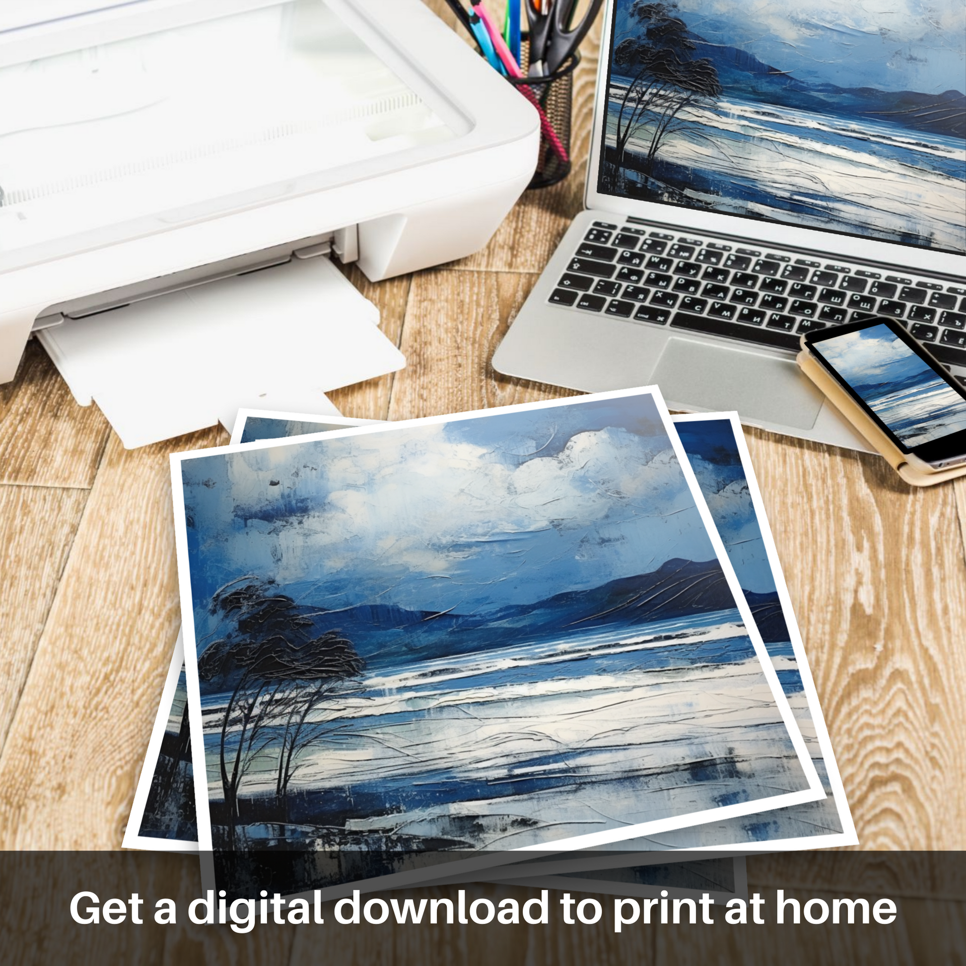 The interplay of light and dark brings a dramatic tension to the scene, embodying the very essence of the rugged Scottish coastline. Each brushstroke carries the weight of the storm and the resilience of nature, inviting the observer to lose themselves in the abstract portrayal of one of Scotland's finest vistas. This print promises to be a stunning focal point in any room, stirring the soul with its portrayal of wild, natural beauty.