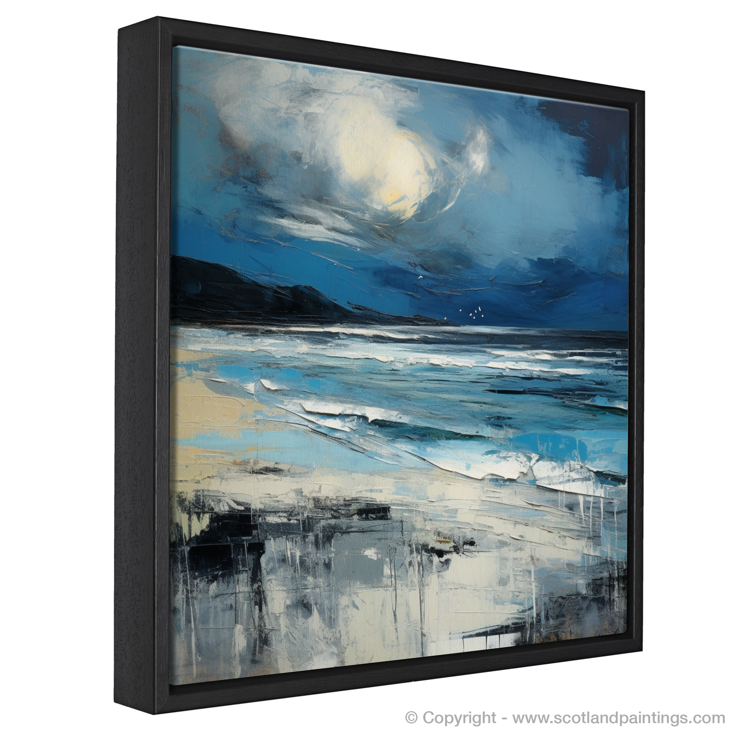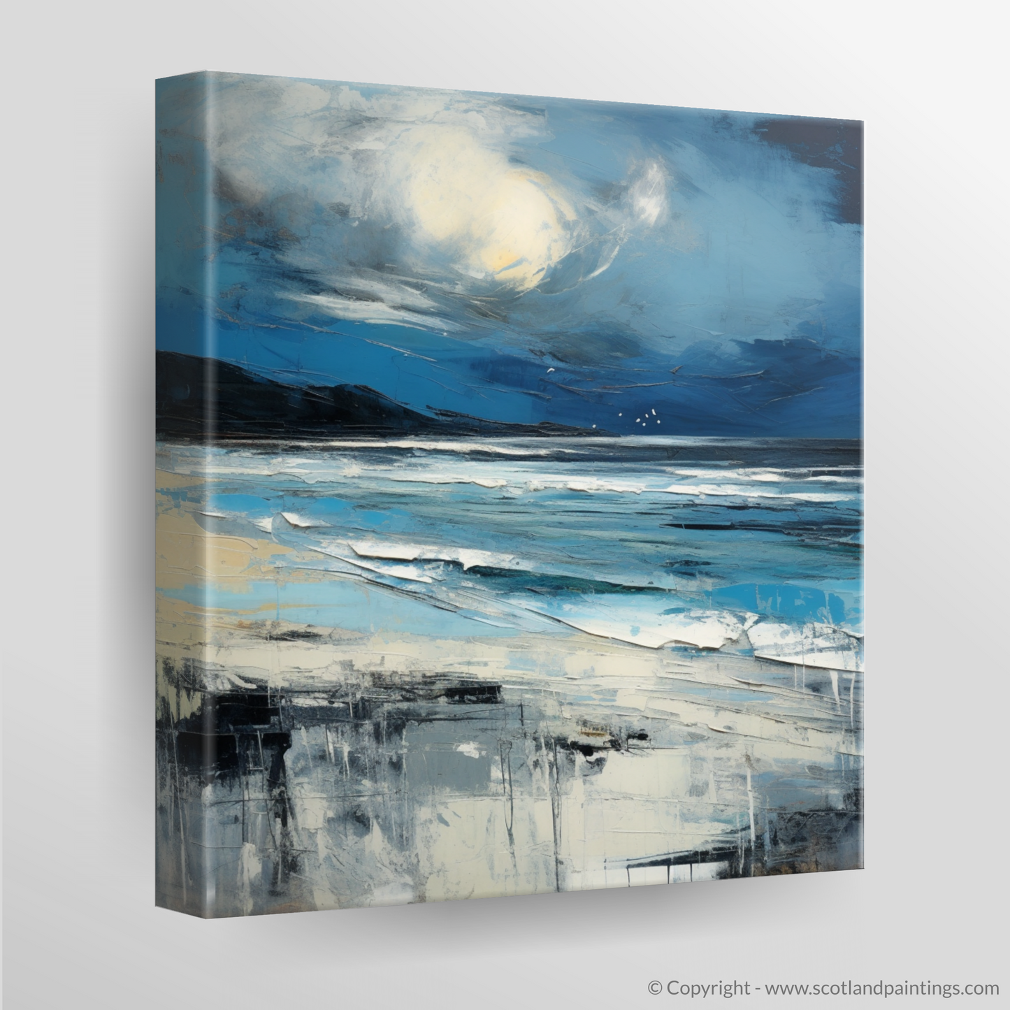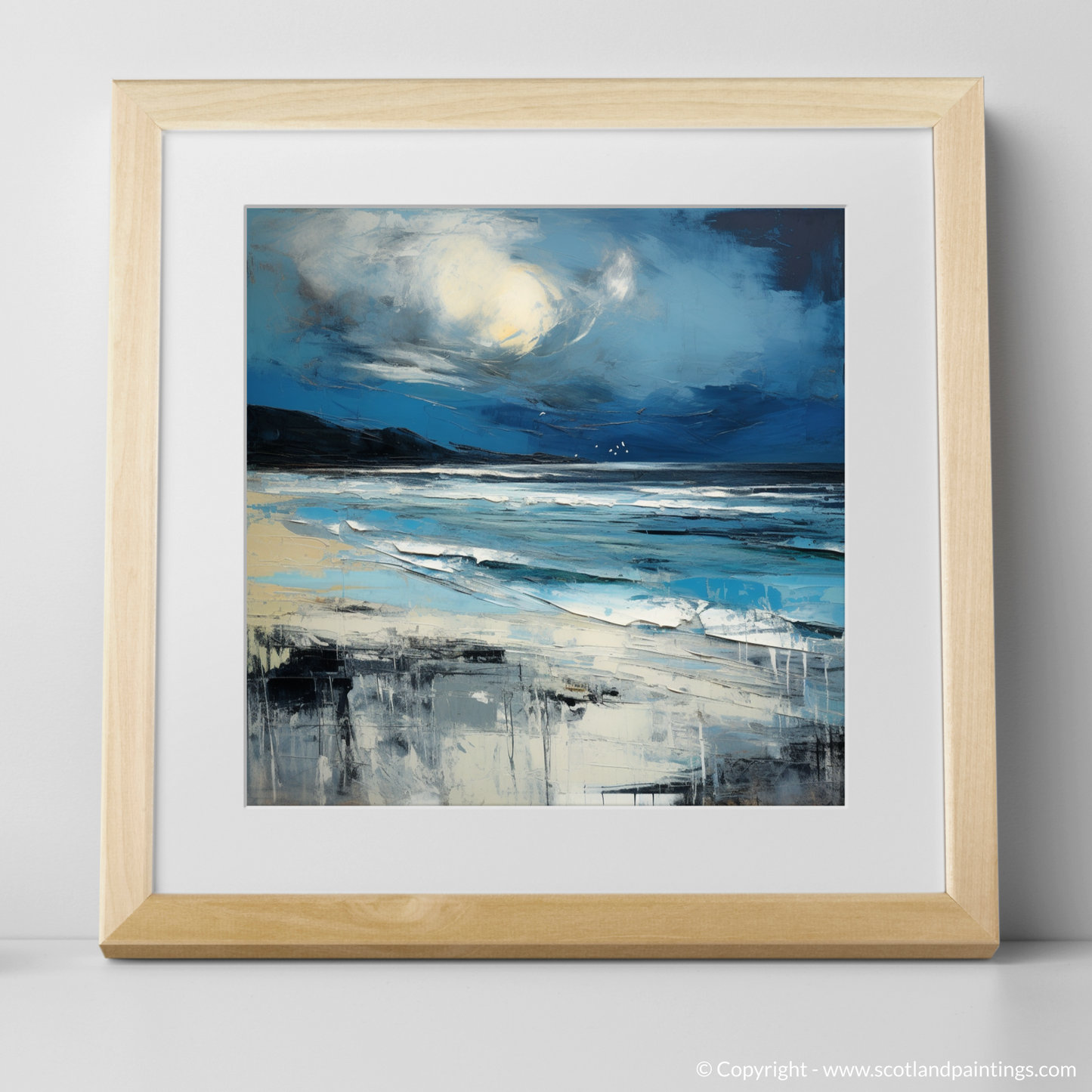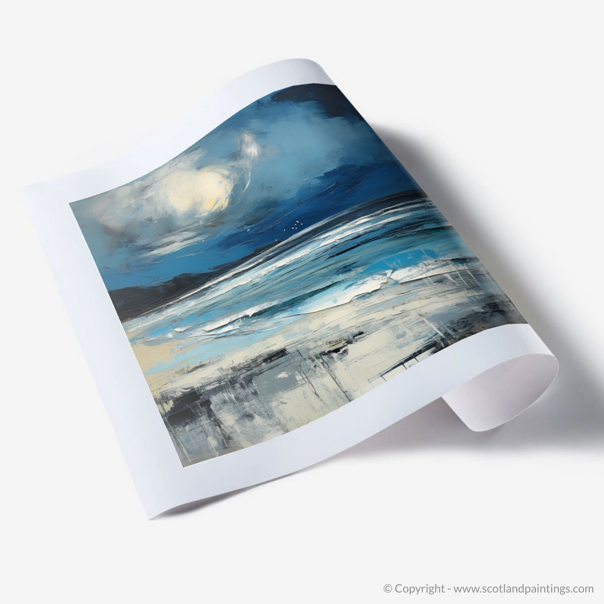 Captured within this evocative piece is the tumultuous beauty of Camusdarach Beach, enveloped by the fury of a Scottish storm. The swirling clouds dominate the canvas, reflecting the unpredictable nature of the Highlands' weather, with the foreboding hues of blue and grey tinged with the glowering white of the churning sea foam. Against this brooding canopy, a dramatic burst of light in the form of a ghostly pale orb casts a spectral glow, infusing the scene with an otherworldly poignancy.