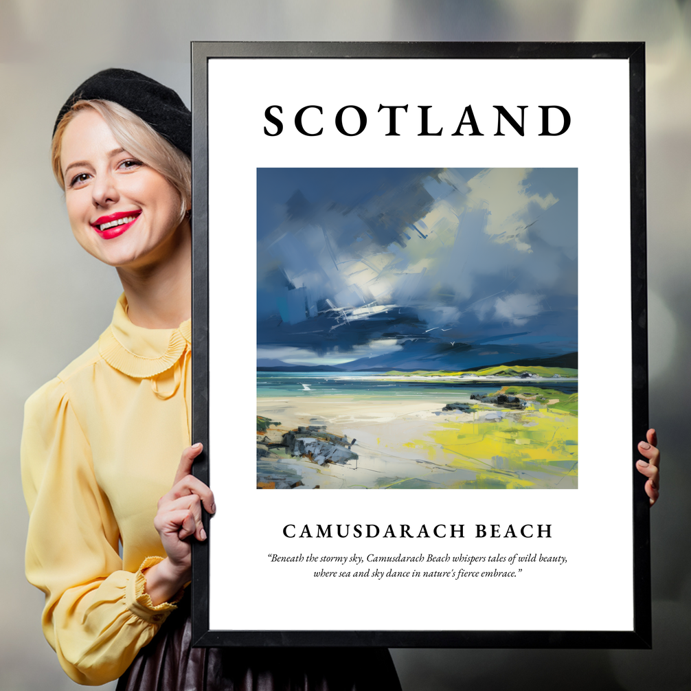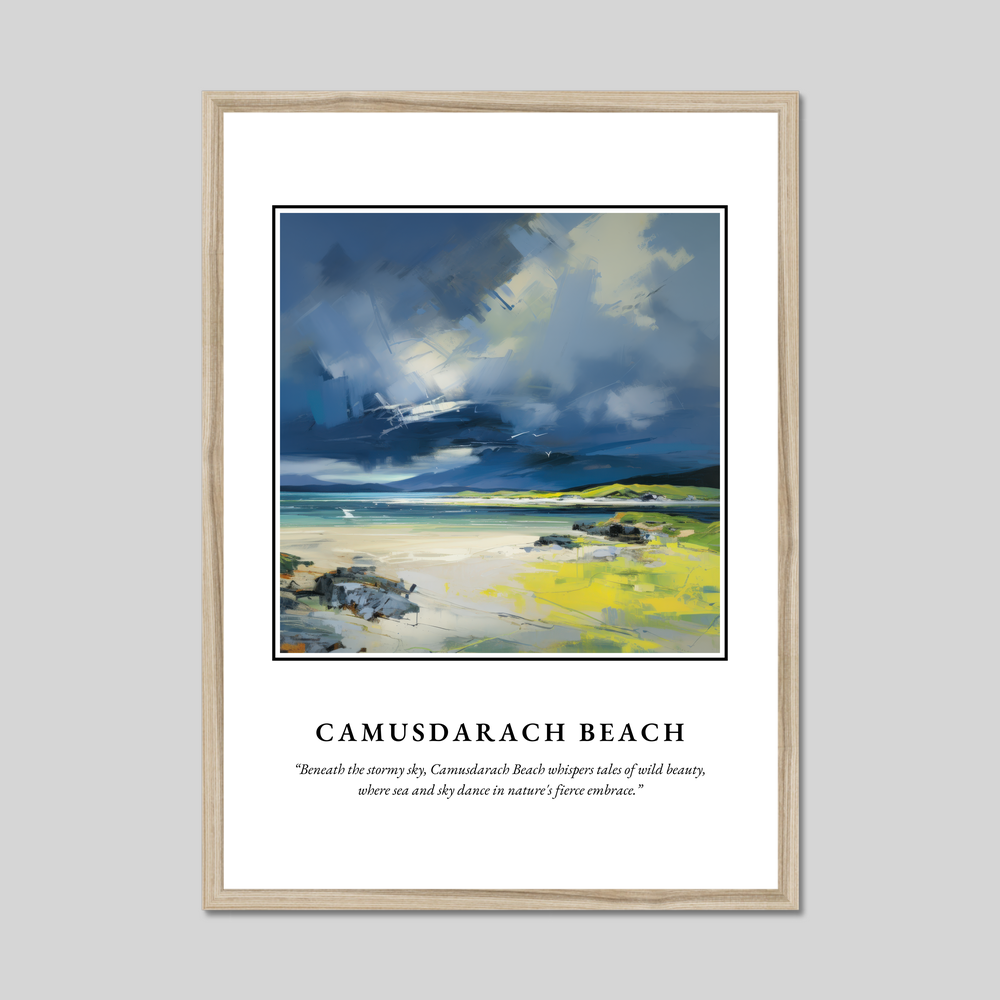 The abstract expressionism style captures the raw, unfiltered essence of Camusdarach Beach. Bold brushstrokes and a vibrant palette of blues, greens, and yellows recreate the dynamic interplay between the sky and sea. This artistic interpretation doesn’t just depict a landscape; it invites you into a world where the elements dance together in a powerful embrace. Beneath this visual masterpiece, the quote “Beneath the stormy sky, Camusdarach Beach whispers tales of wild beauty, where sea and sky dance in nature's fierce embrace” evokes the mystery and magic of this remarkable place.
