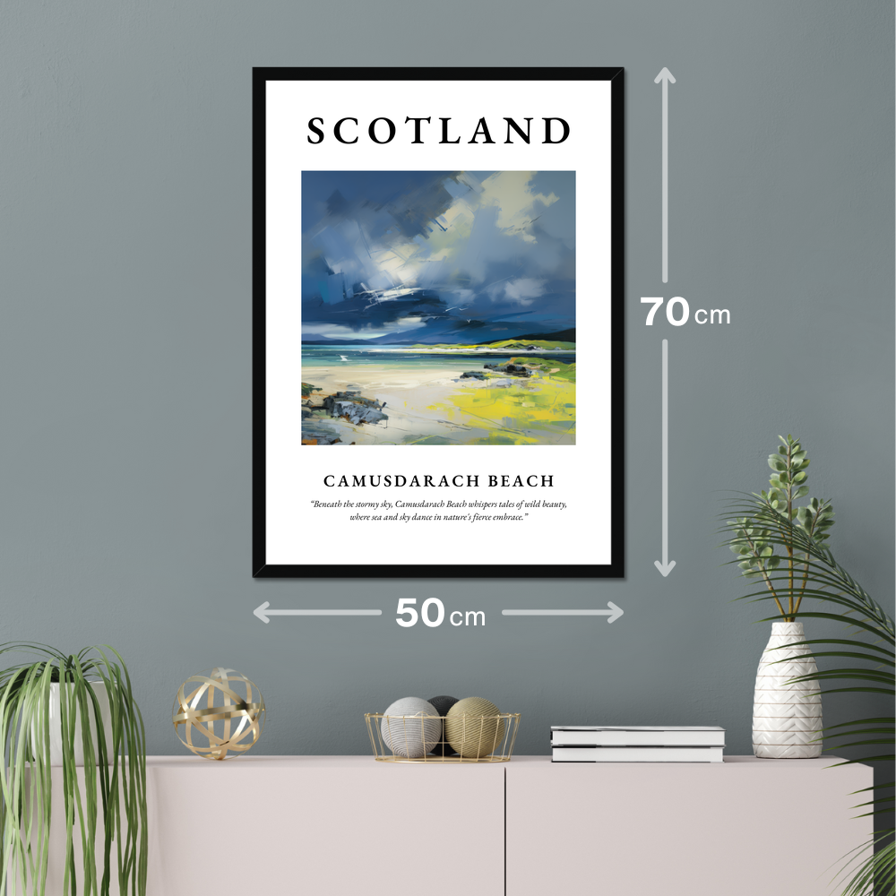 Experience the untamed allure of Scotland’s majestic coastline with our stunning framed art print of Camusdarach Beach. Measuring an impressive 50cm x 70cm, this captivating poster commands attention and transforms any wall into a canvas of natural beauty. The word "SCOTLAND" graces the top in bold, striking letters, setting the stage for the evocative painting below. Available in sophisticated black, crisp white, or a charming natural wood-effect frame, this piece complements any interior style.