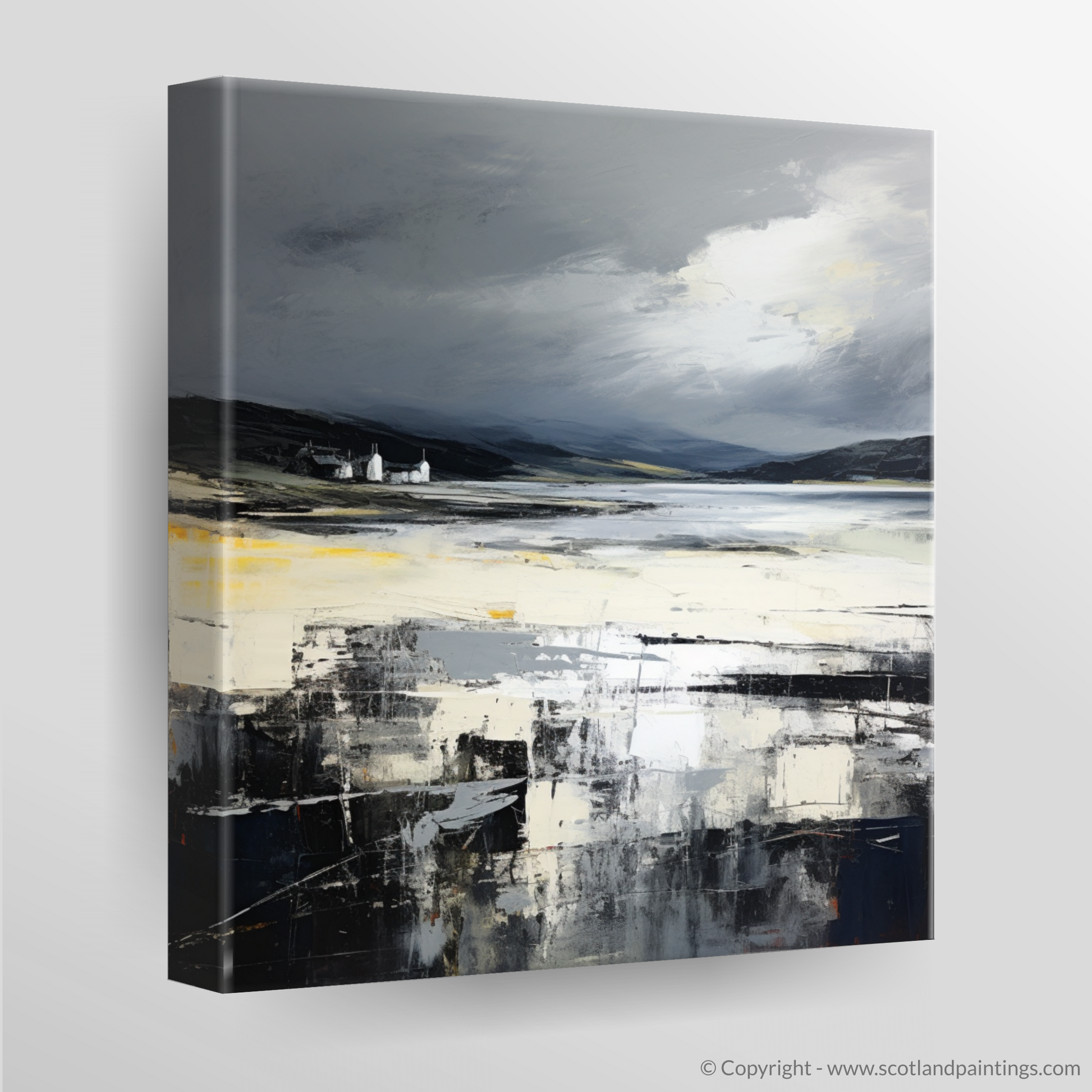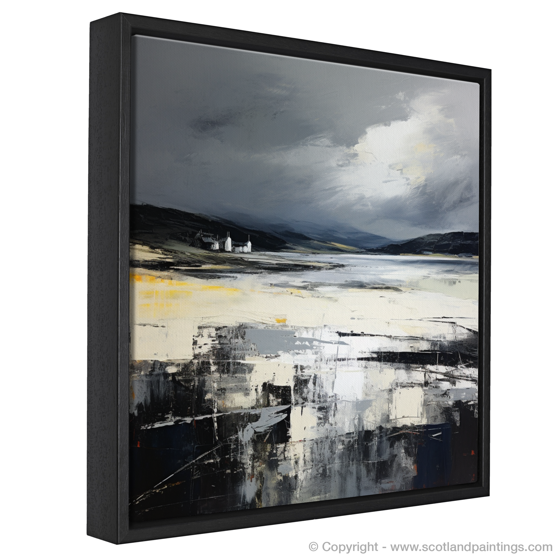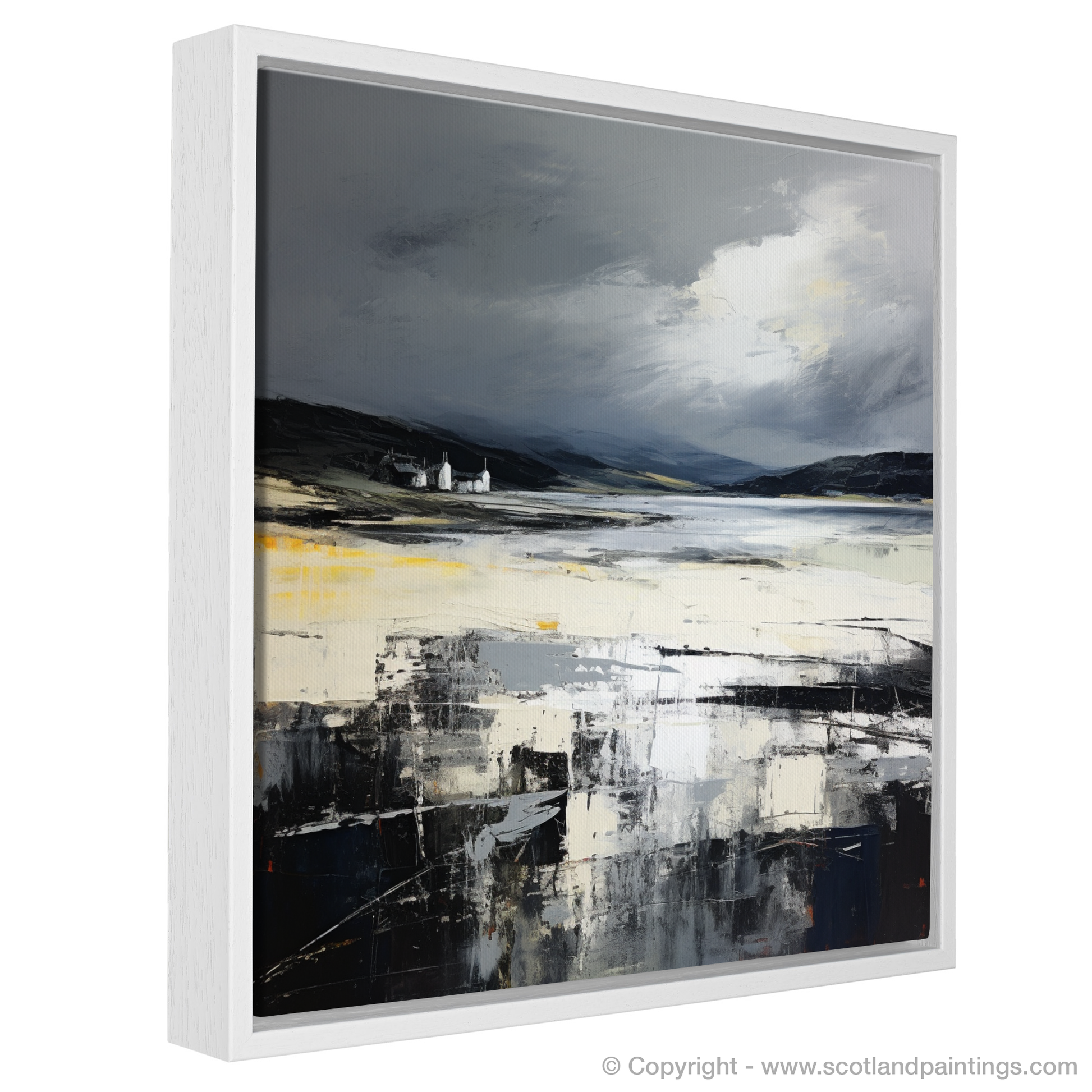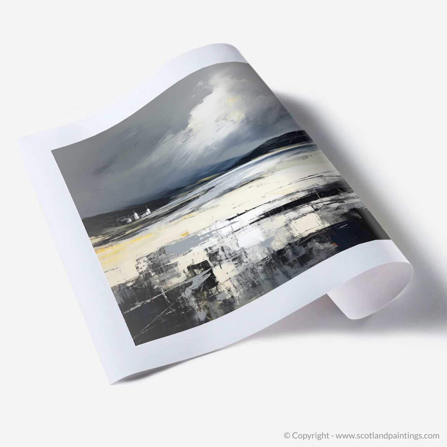 Immerse yourself in the tumultuous beauty of the Scottish coastline with a striking print inspired by the majestic Camusdarach Beach. This exquisite piece captures the wild, untamed spirit of Scotland under an enigmatic stormy sky. The abstract portrayal uses a palette dominated by brooding greys, contrasting with the rich blacks and striking touches of white that imply a lively dance between the elements.