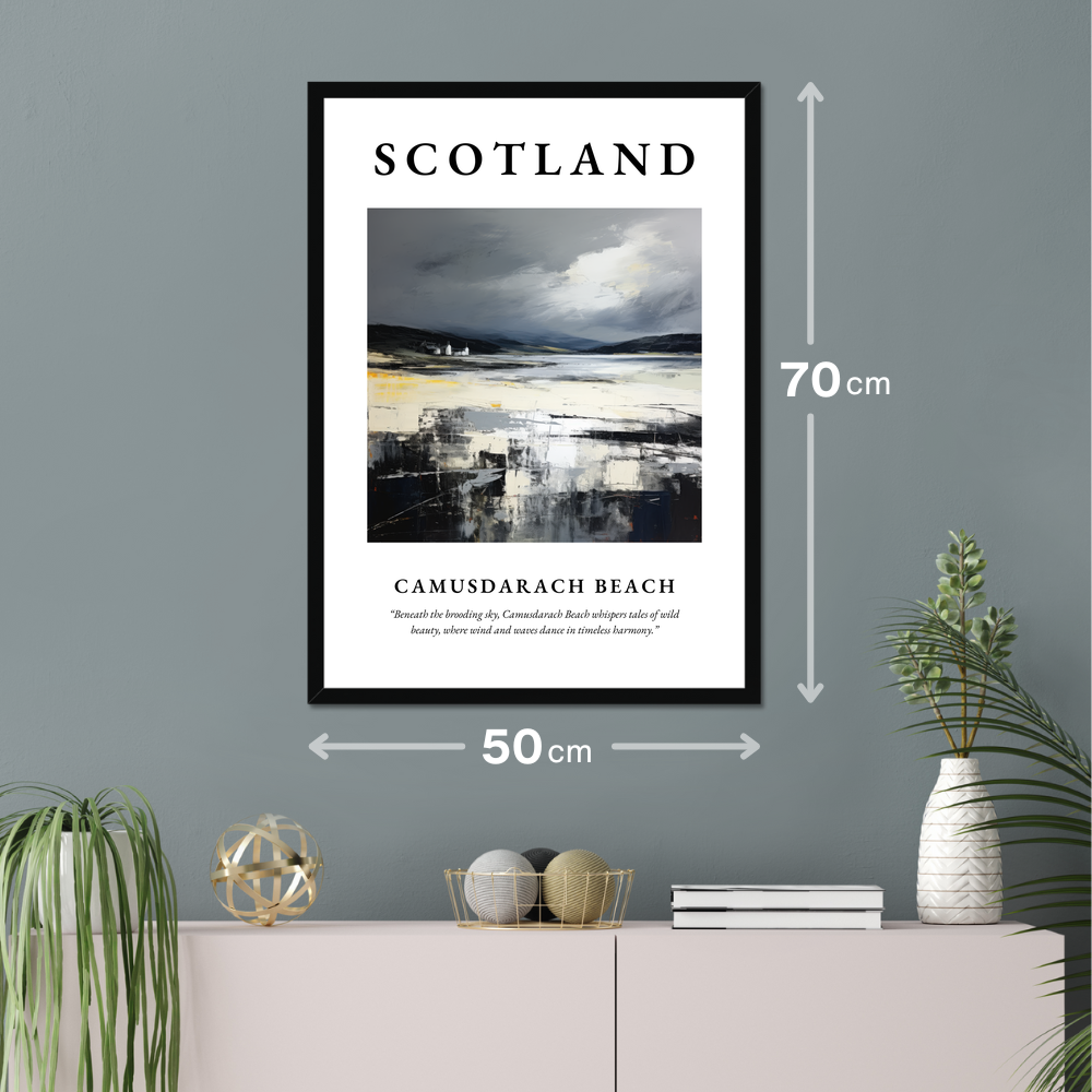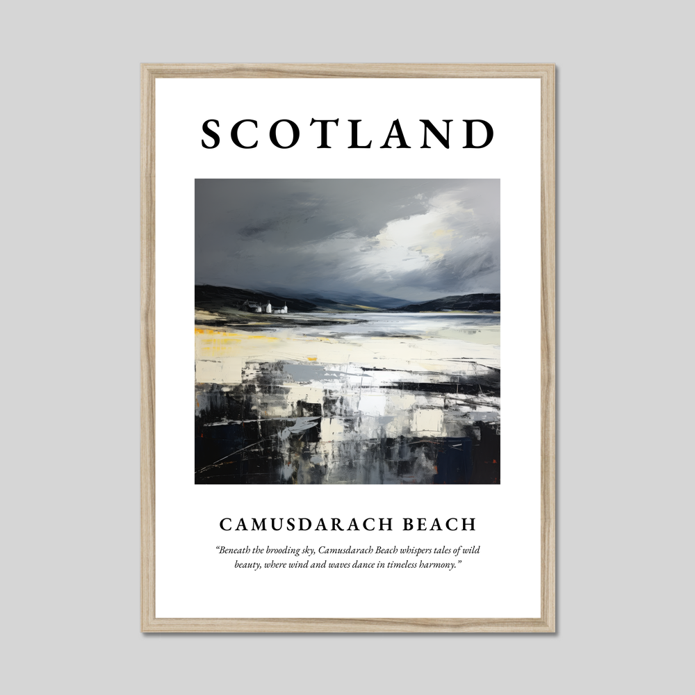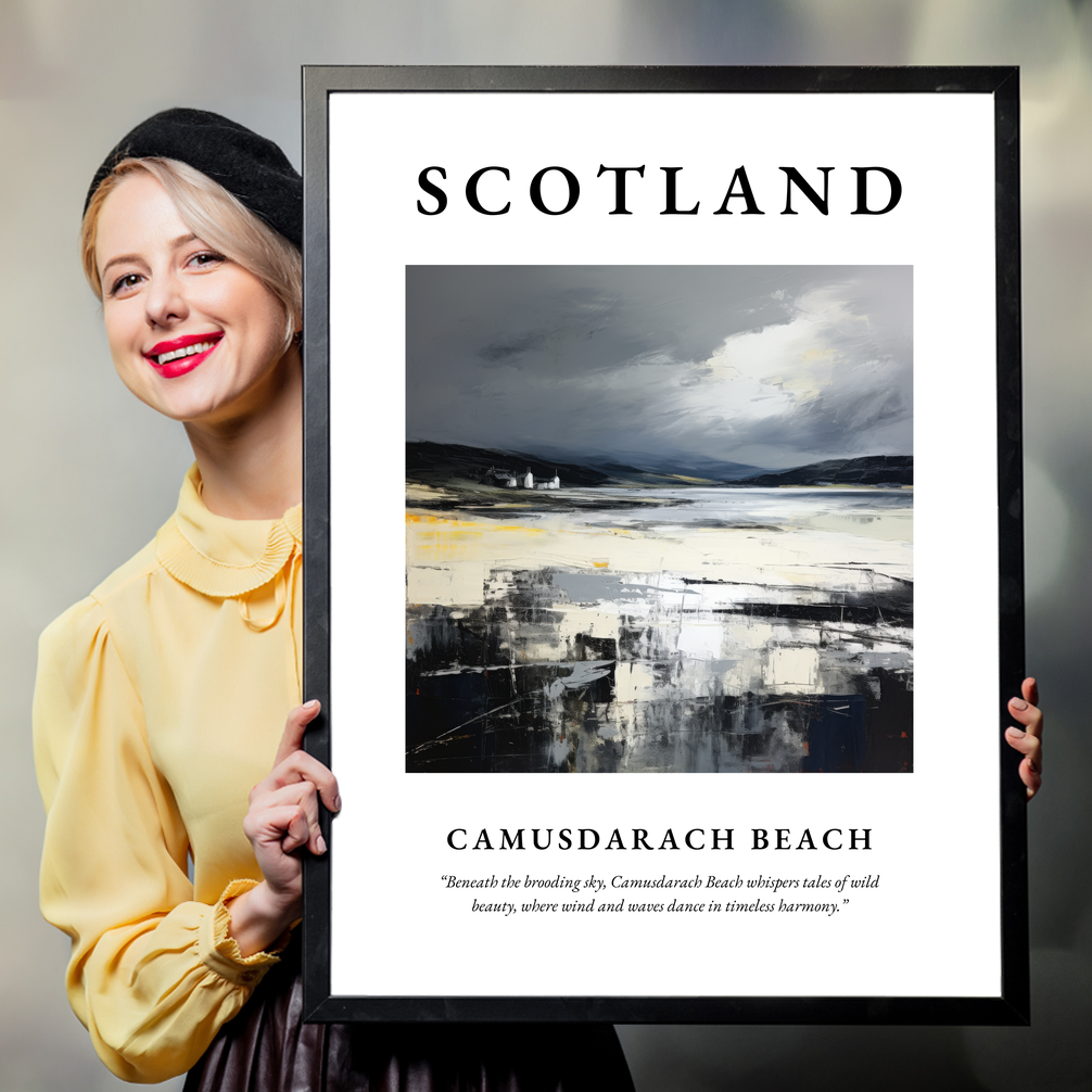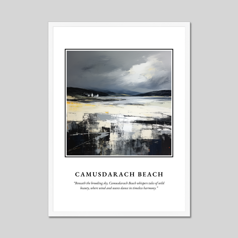 Camusdarach Beach, nestled on Scotland’s west coast, is a haven for dreamers and wanderers alike. Known for its stunning views towards the Isle of Skye and the Small Isles, it is a place where time seems to stand still. The landscape, often shadowed by dramatic skies, mirrors the essence captured in our artwork, portraying nature's untouched beauty. Whether you have wandered these sands or dream of them from afar, this poster invites you to bask in the serenity and drama of one of Scotland's most evocative settings.