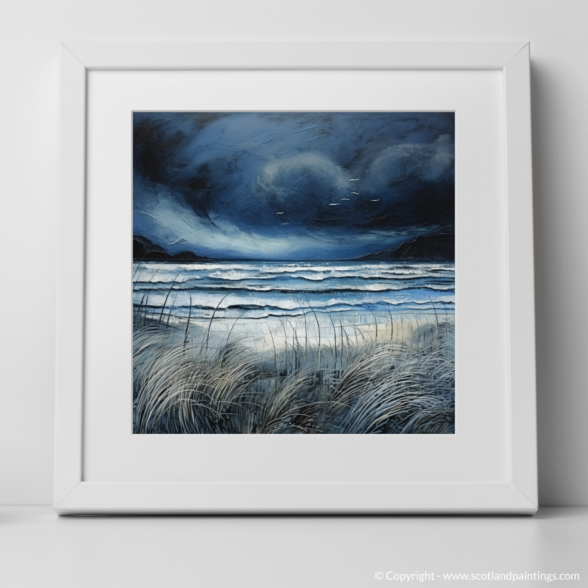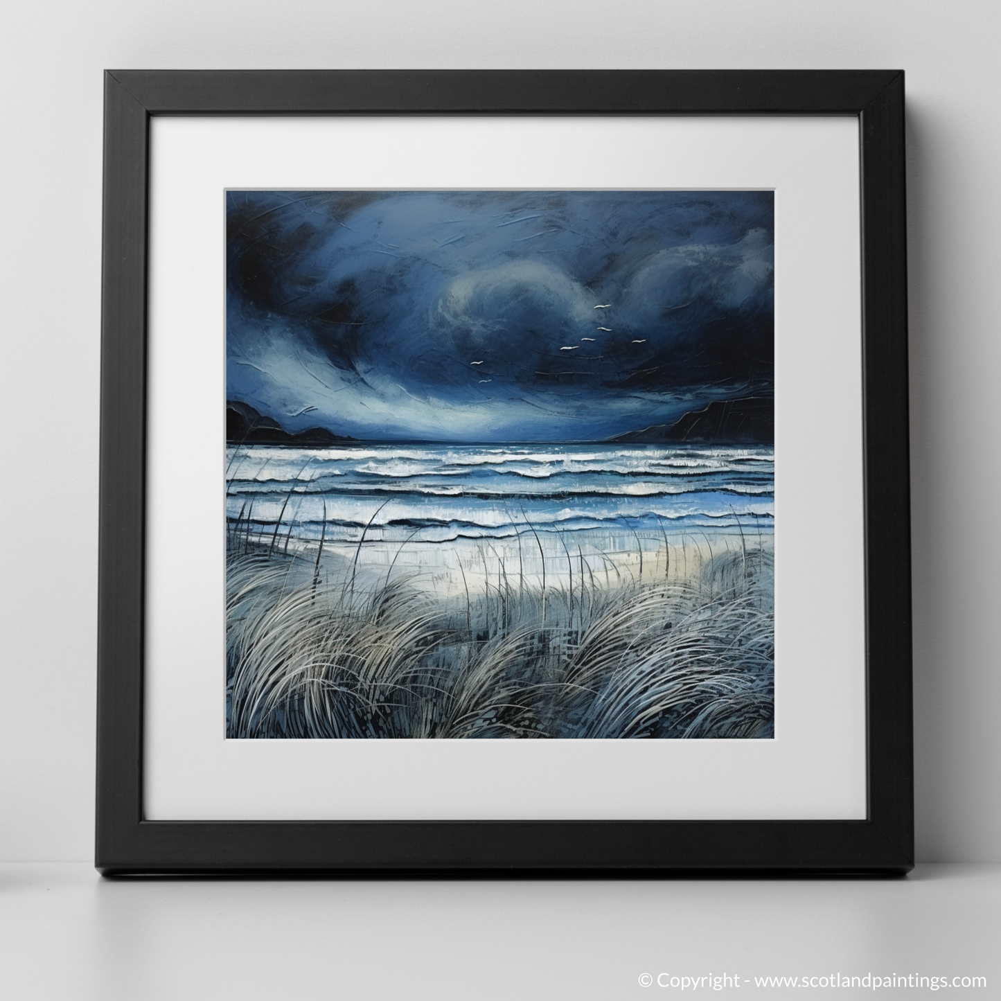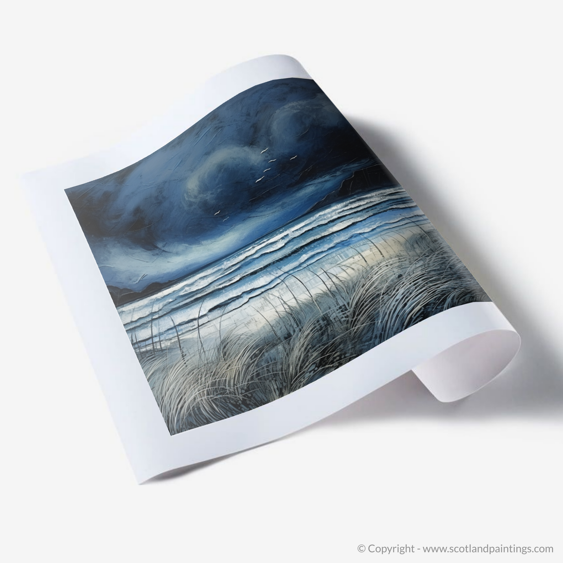 Capturing the untamed spirit of Camusdarach Beach, this mesmerising print steeped in the Abstract Expressionist style, conjures the raw emotions of Scotland's rugged coastal beauty. The tempestuous sky, swirling with deep shades of blue and ominous tones of dark grey, mirrors the chaotic dance of the rolling waves below, creating a dynamic interplay of movement across the canvas.
