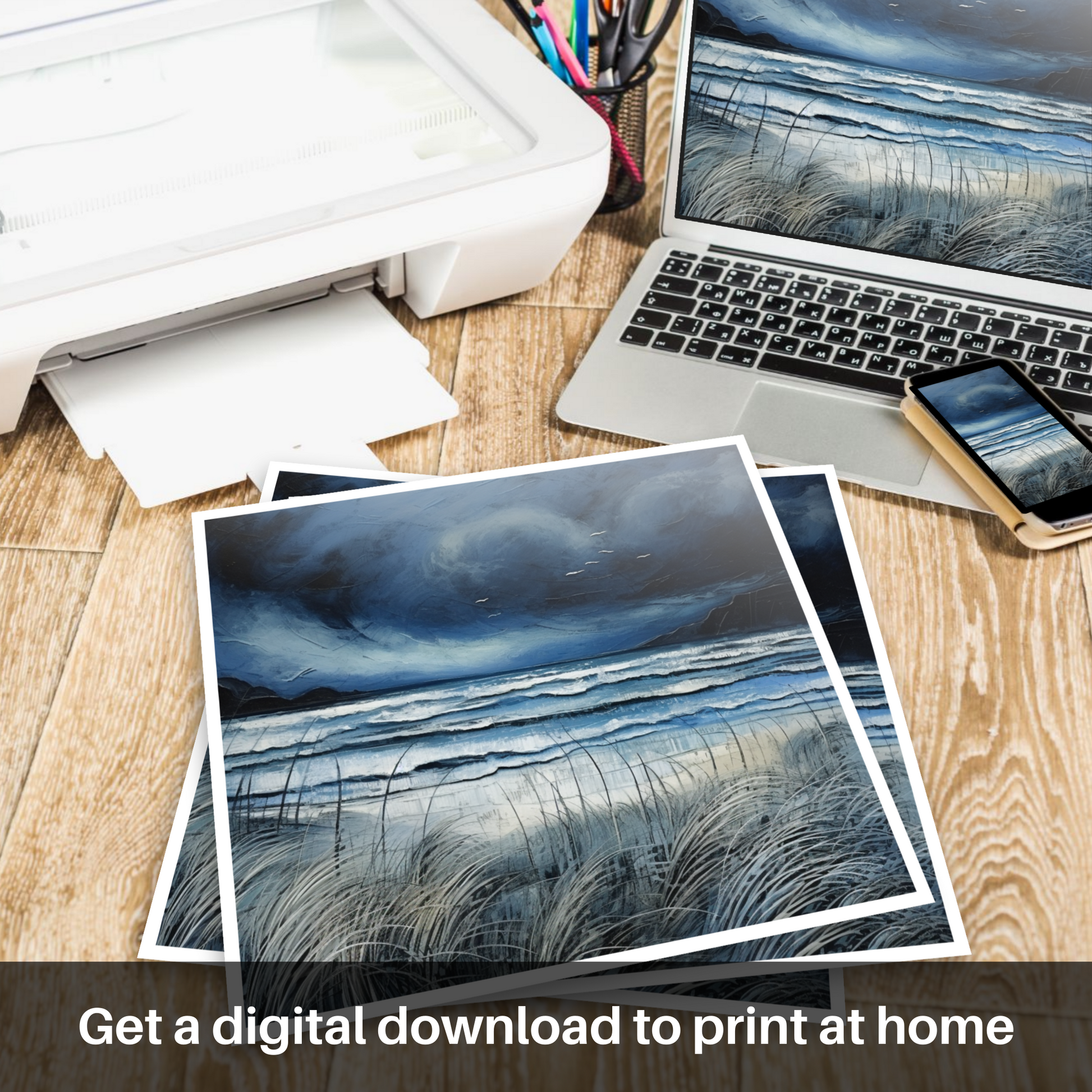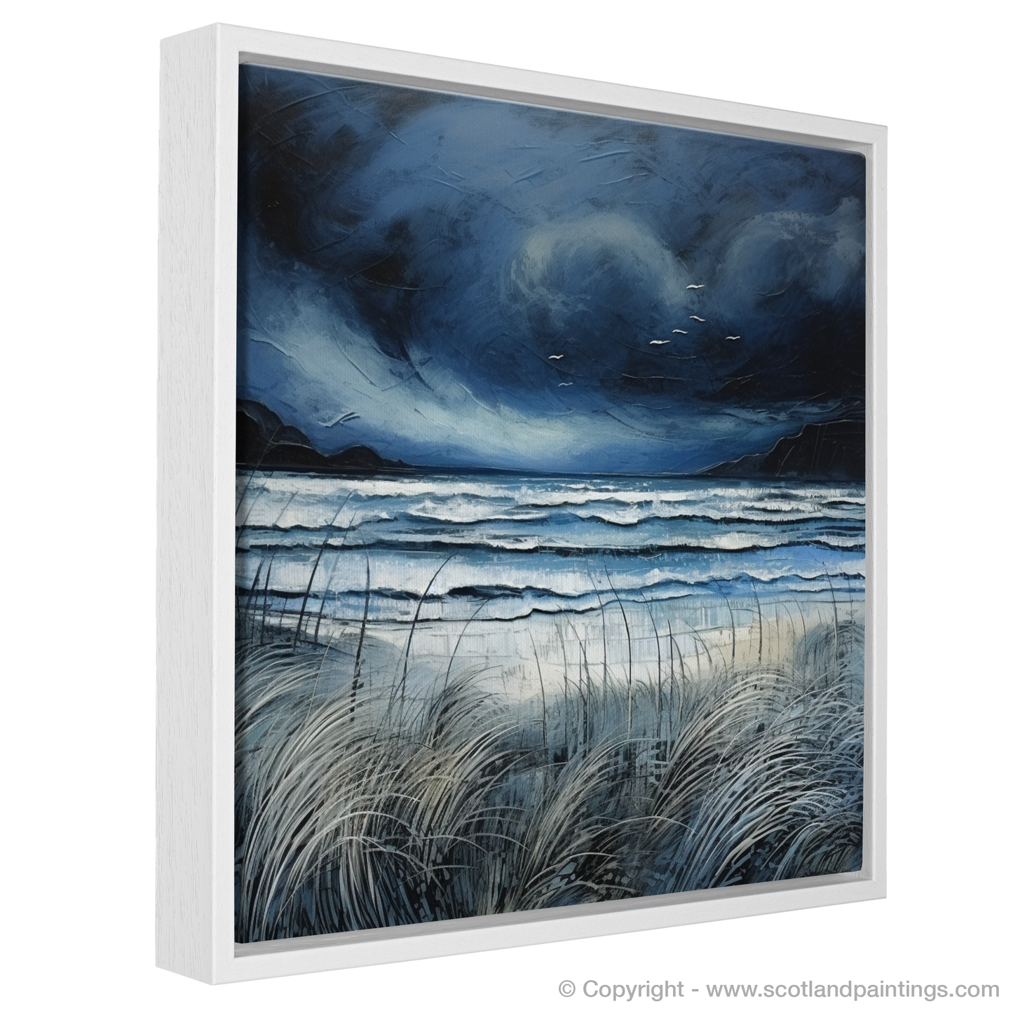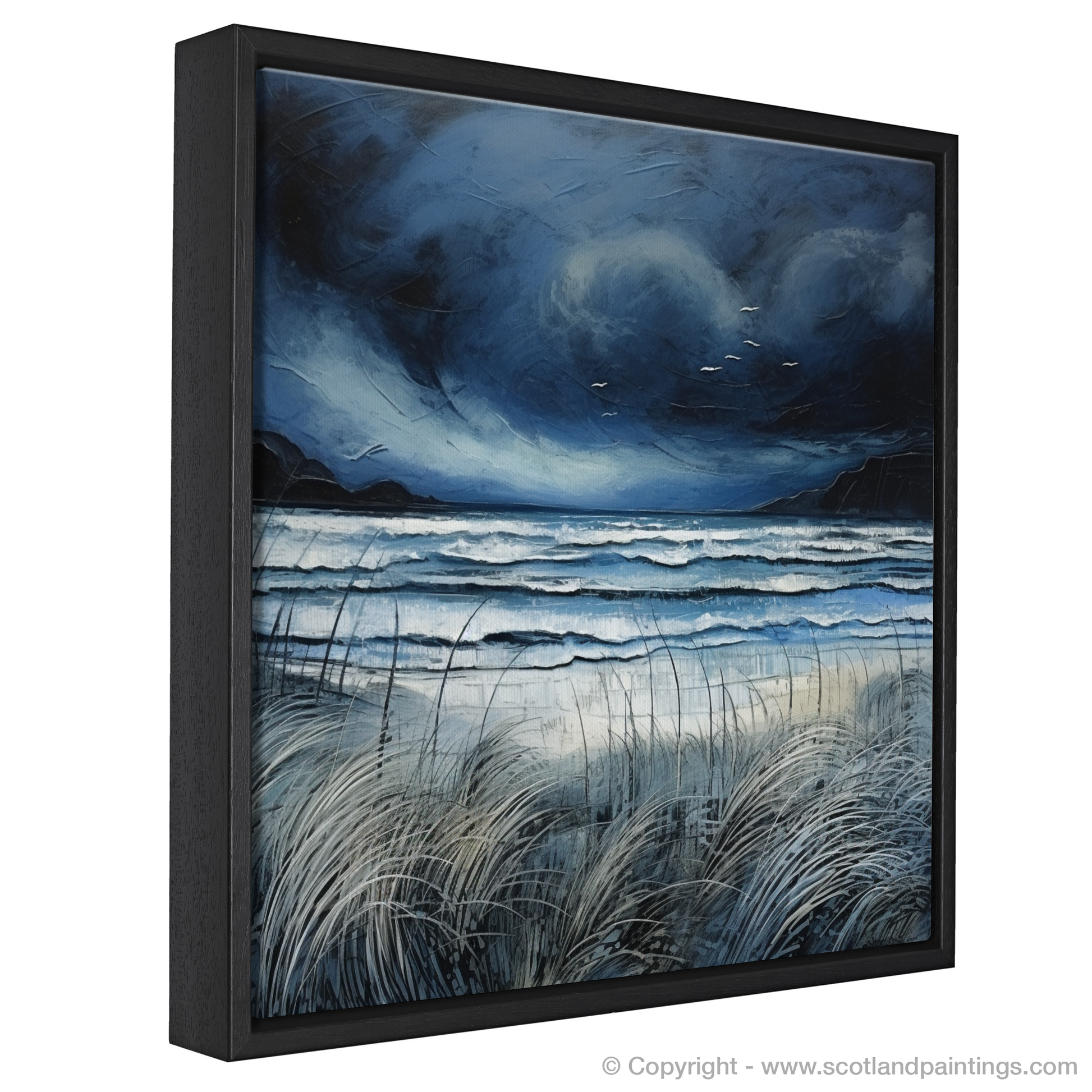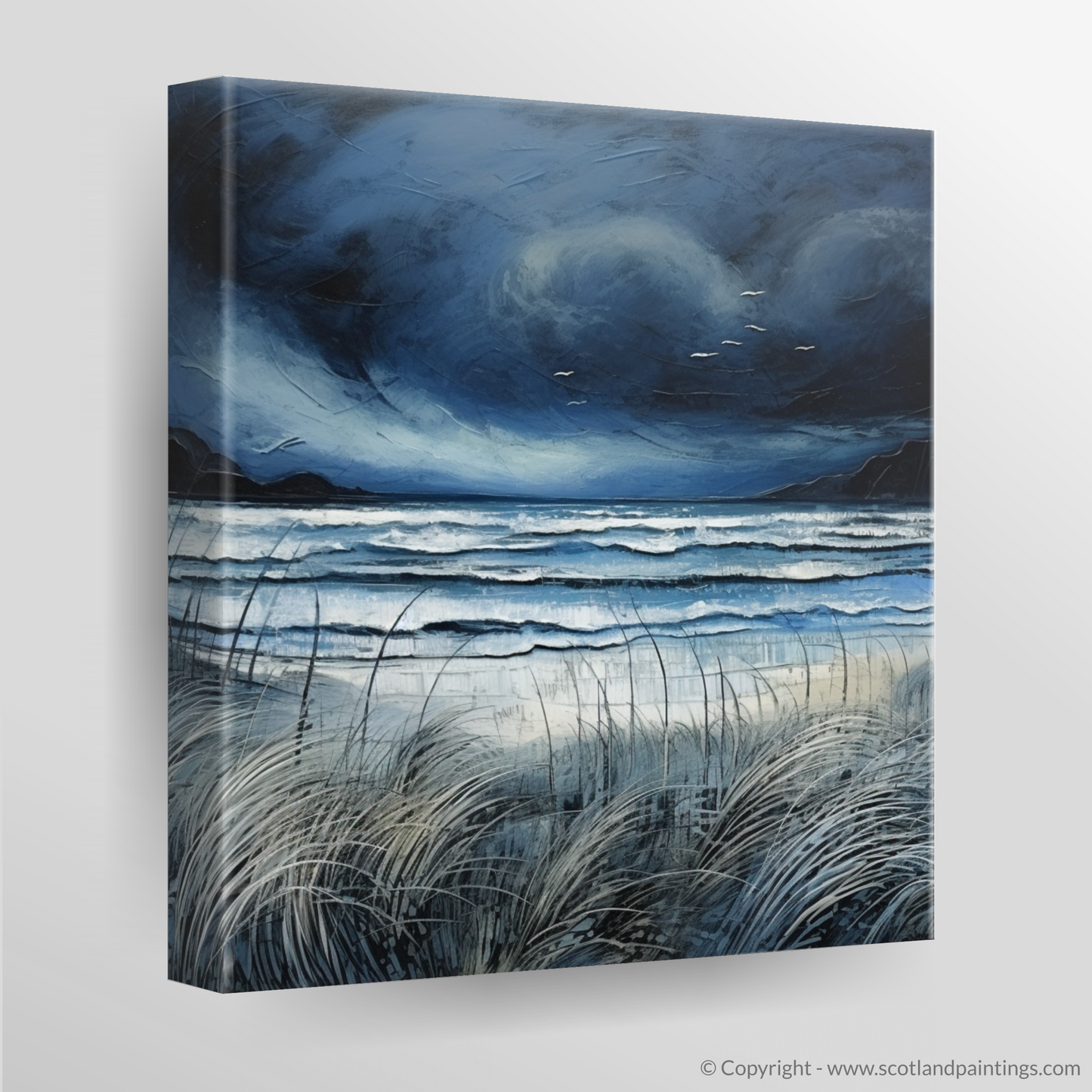 Capturing the untamed spirit of Camusdarach Beach, this mesmerising print steeped in the Abstract Expressionist style, conjures the raw emotions of Scotland's rugged coastal beauty. The tempestuous sky, swirling with deep shades of blue and ominous tones of dark grey, mirrors the chaotic dance of the rolling waves below, creating a dynamic interplay of movement across the canvas.