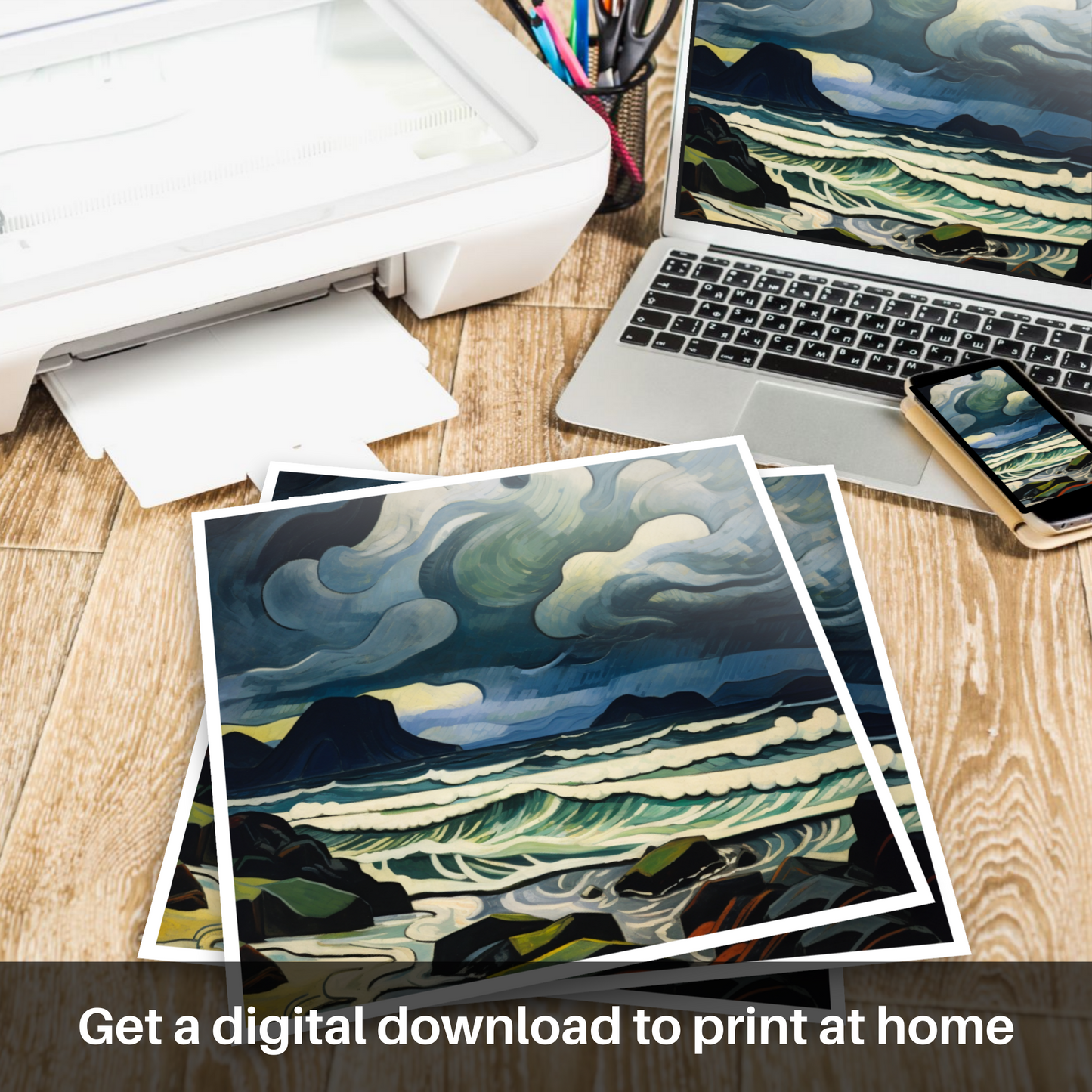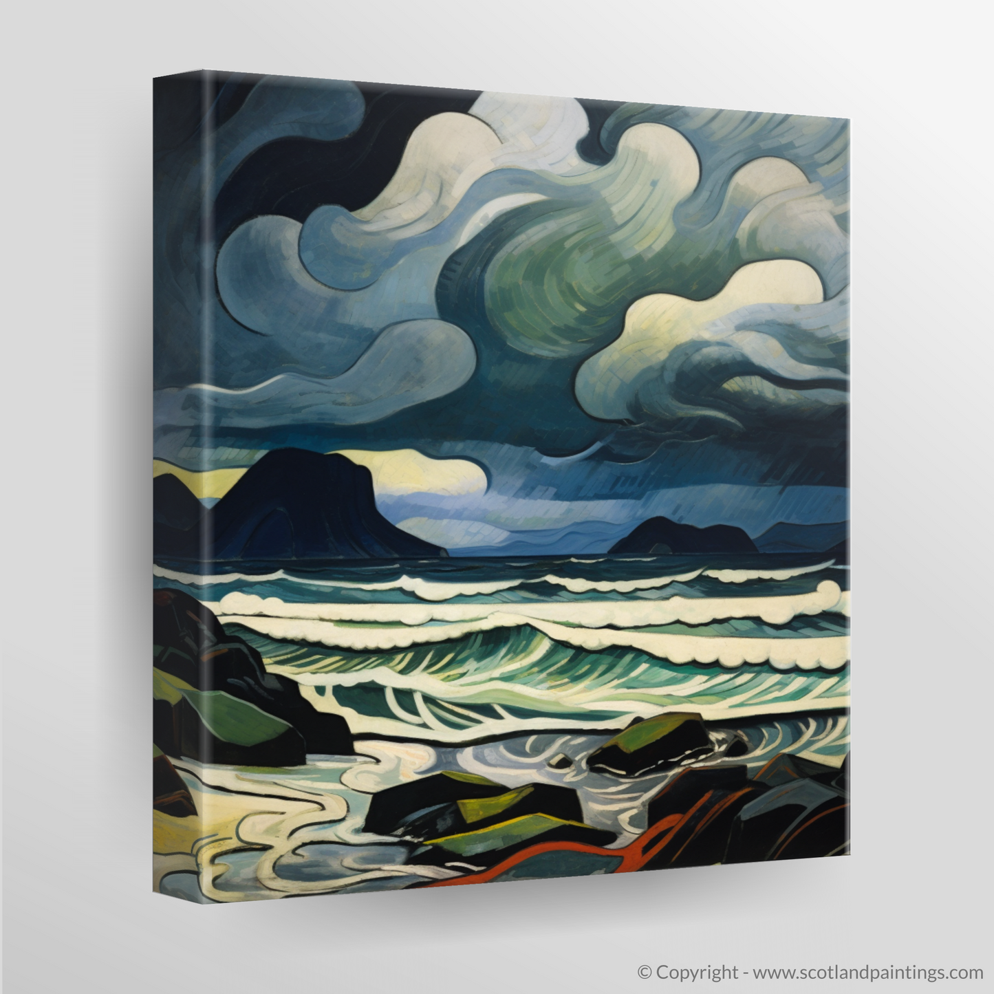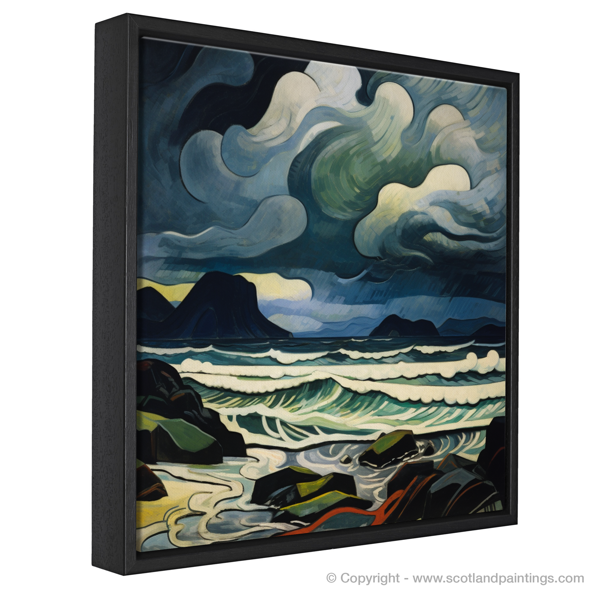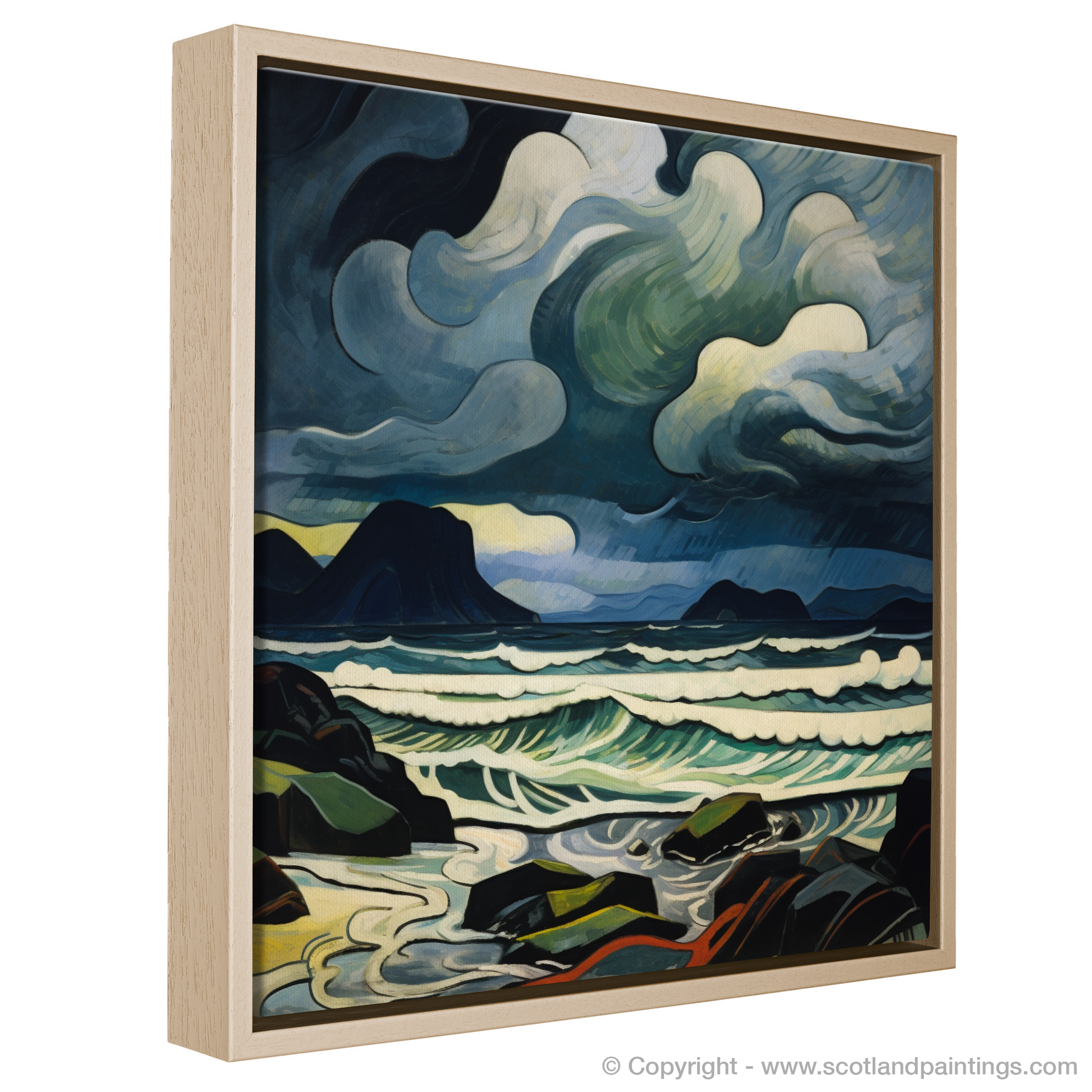 Allow the dynamic essence of Scotland's rugged coastline to sweep across your wall with this emotive abstract expression of Camusdarach Beach. This piece plunges the viewer into the heart of a tempest, with an atmospheric portrayal of storm-churned skies and untamed waves. The palette is a captivating dance of deep blues, ghostly greys and vibrant whites, animating the scene with a palpable energy.