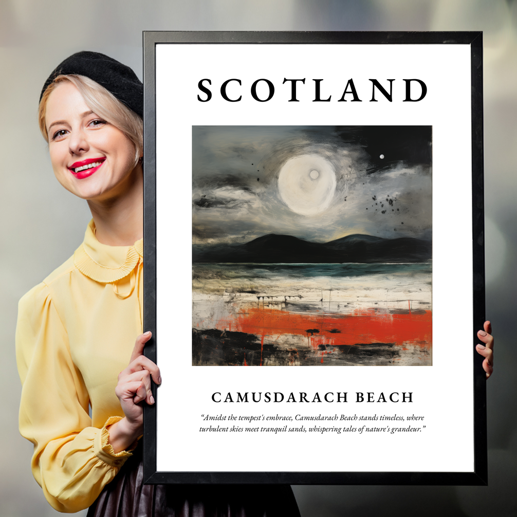 For those with a personal connection to Camusdarach Beach or a fondness for Scotland's stunning coastline, this artwork whispers tales of your cherished memories. Perhaps you’ve walked these sands or have a longing to visit; this piece serves as a daily reminder or inspiration. The accompanying quote, “Amidst the tempest's embrace, Camusdarach Beach stands timeless, where turbulent skies meet tranquil sands, whispering tales of nature's grandeur,” elegantly captures the essence of this magical location and the emotions it evokes.