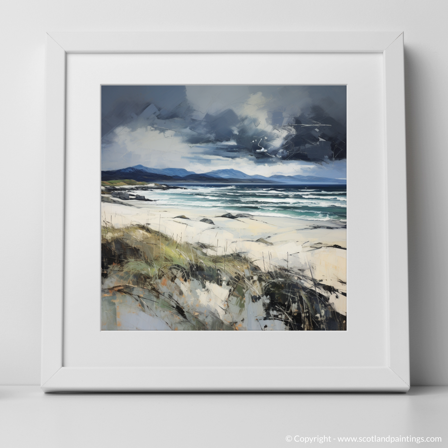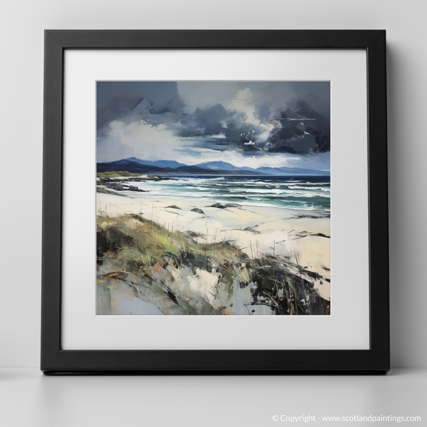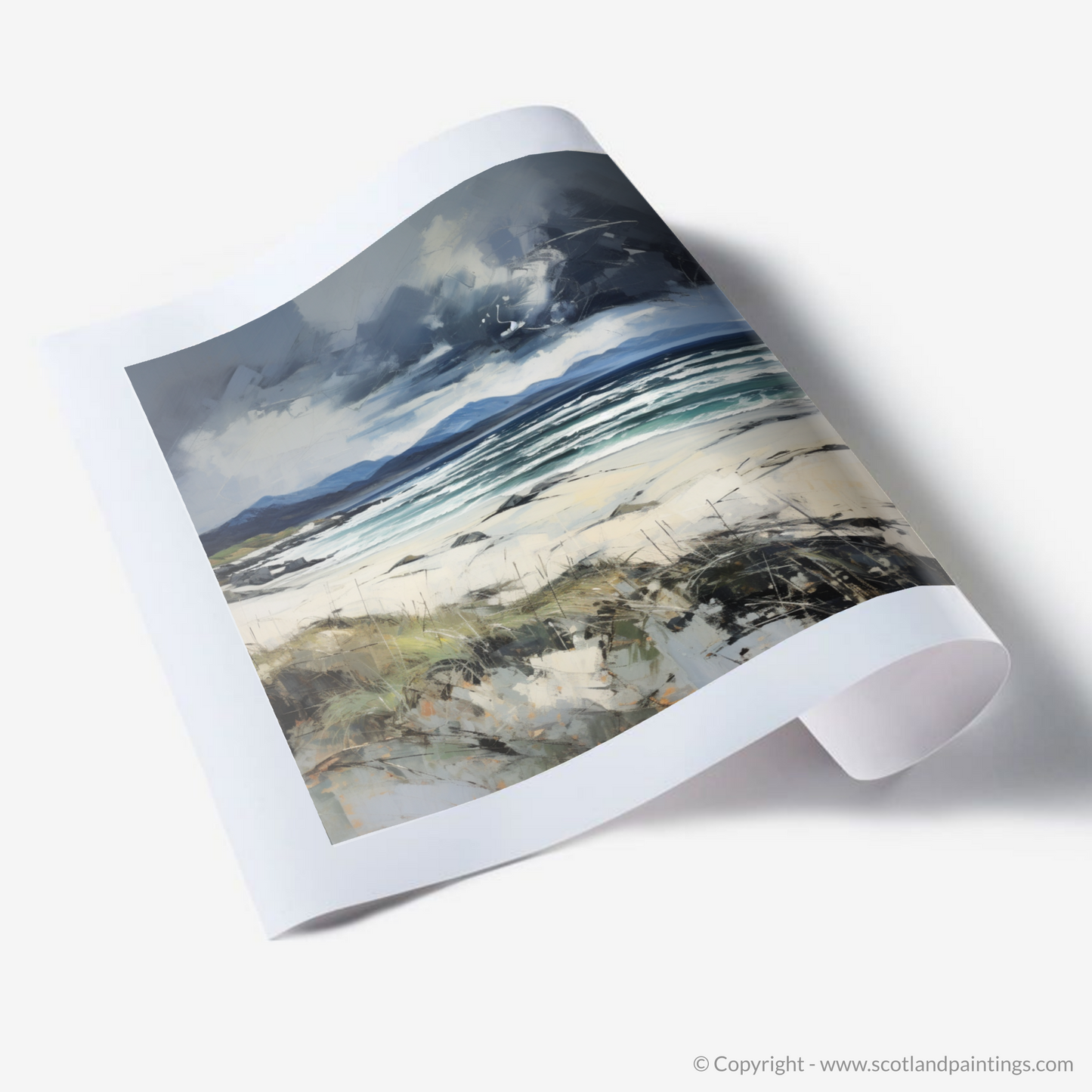 Capturing the wild essence of Scotland's natural beauty, this evocative print showcases the dynamic and untamed spirit of Camusdarach Beach under a tumultuous sky. The artwork envelops the viewer in a symphony of abstract expressionist strokes, where brooding shades of charcoal and slate clash with fleeting touches of azure and white to portray a storm gathering above the horizon.