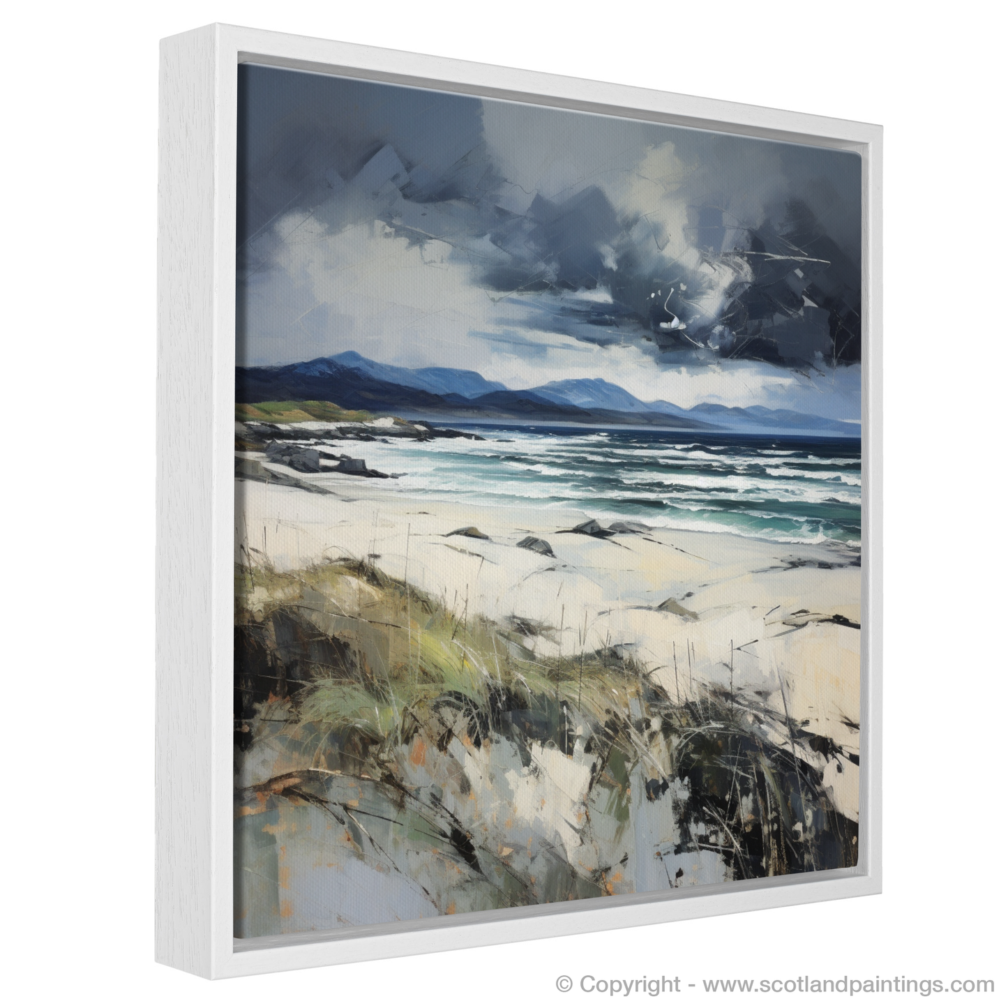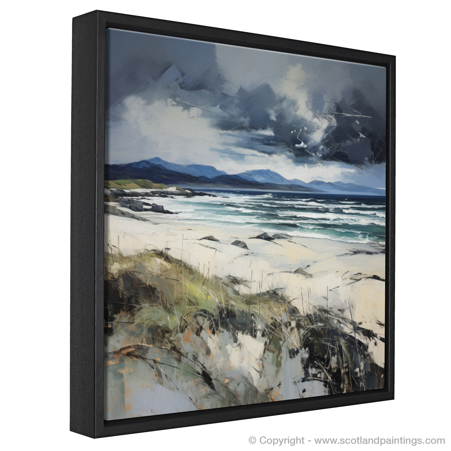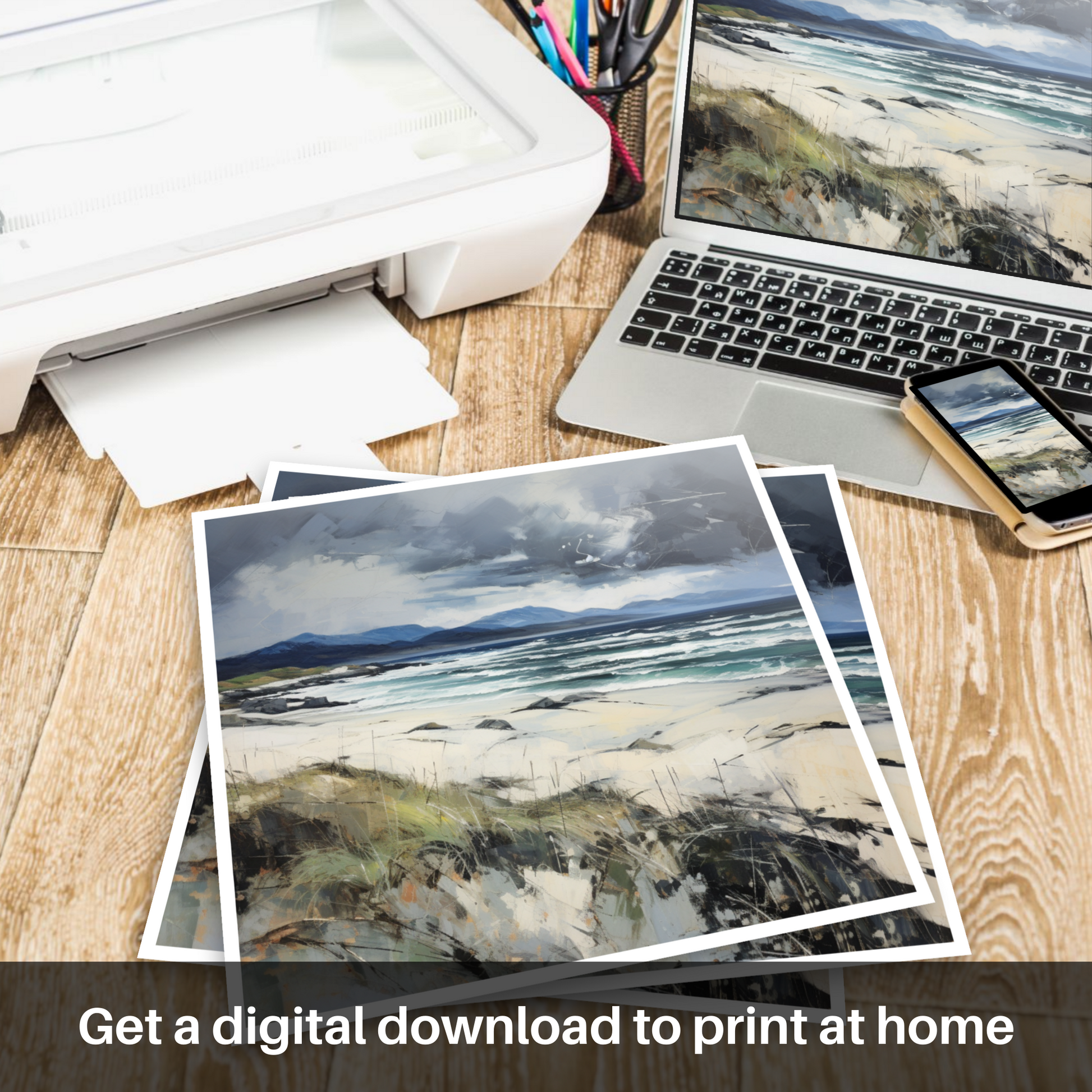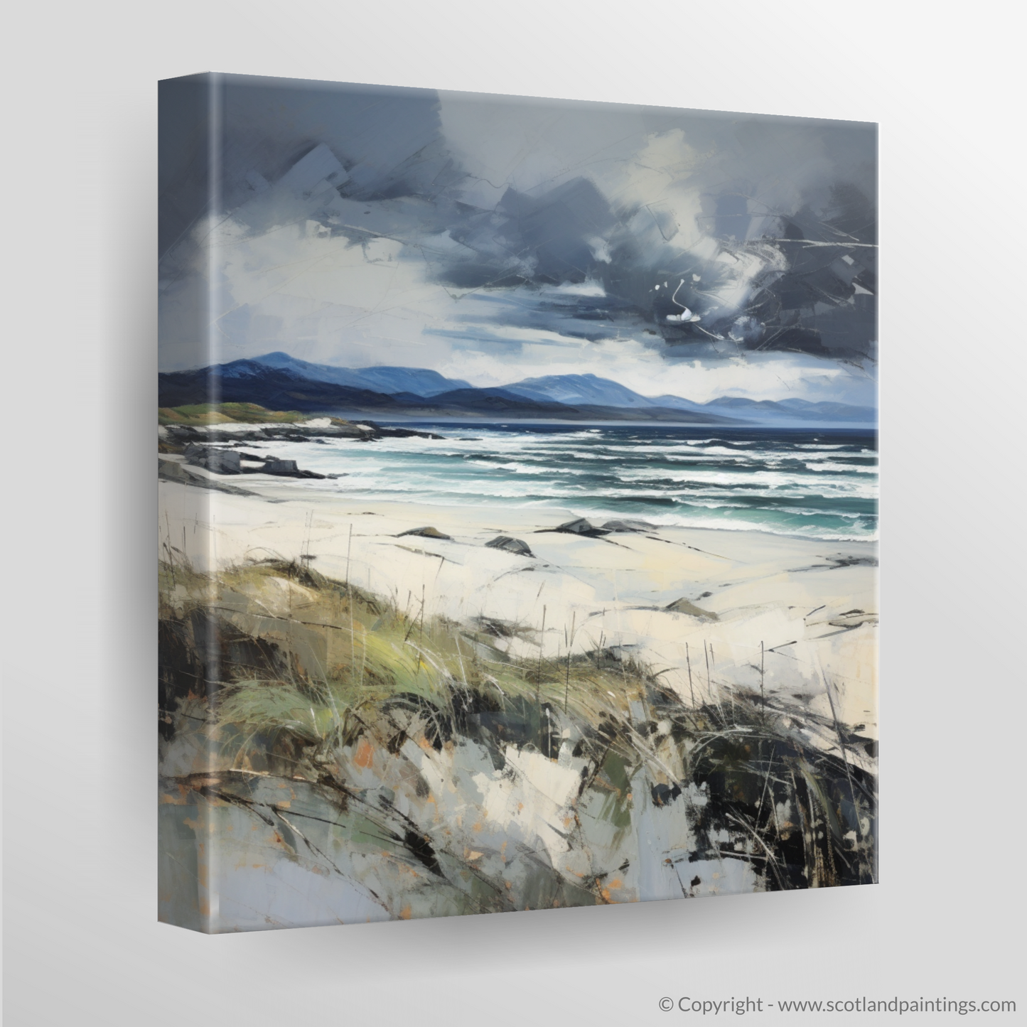 Capturing the wild essence of Scotland's natural beauty, this evocative print showcases the dynamic and untamed spirit of Camusdarach Beach under a tumultuous sky. The artwork envelops the viewer in a symphony of abstract expressionist strokes, where brooding shades of charcoal and slate clash with fleeting touches of azure and white to portray a storm gathering above the horizon.