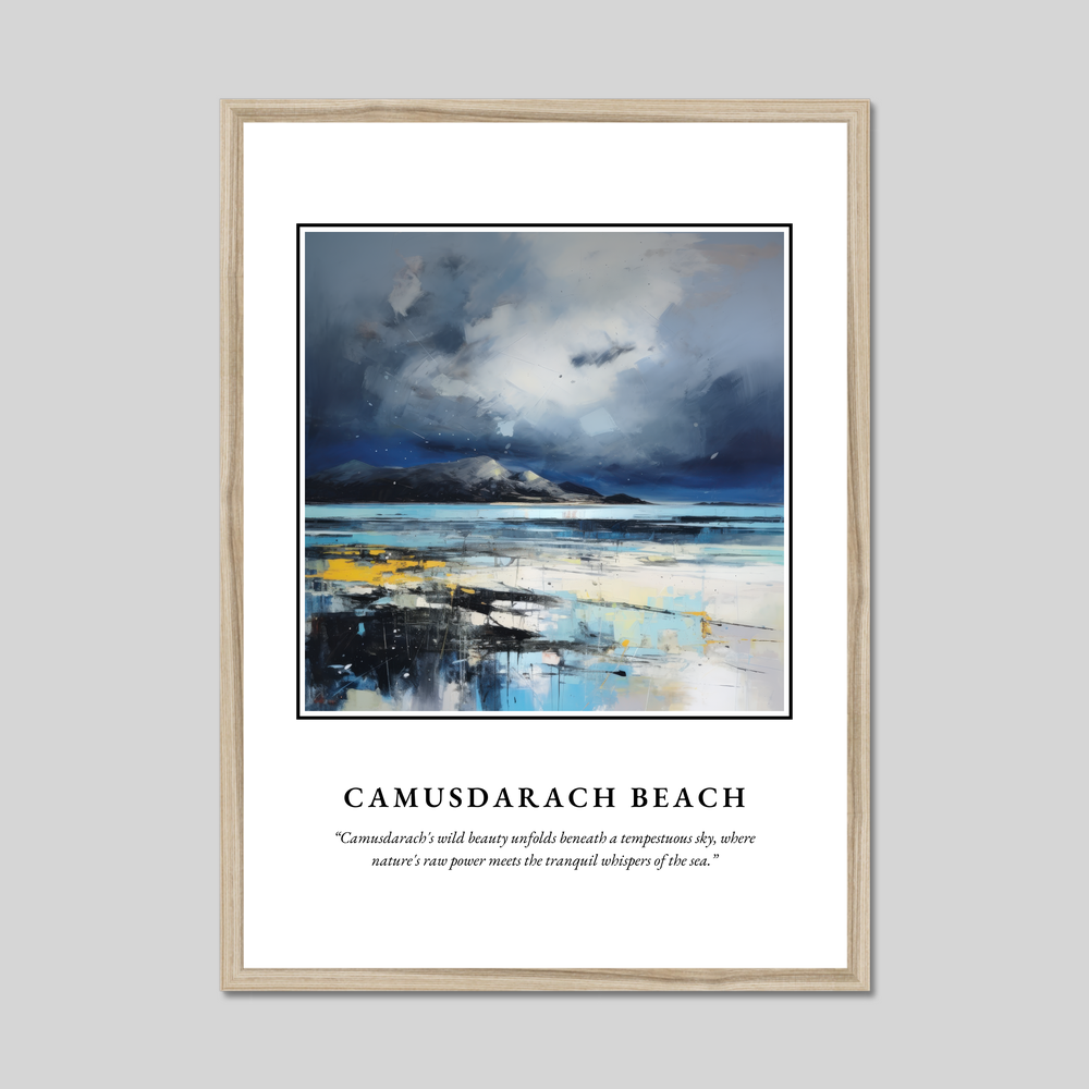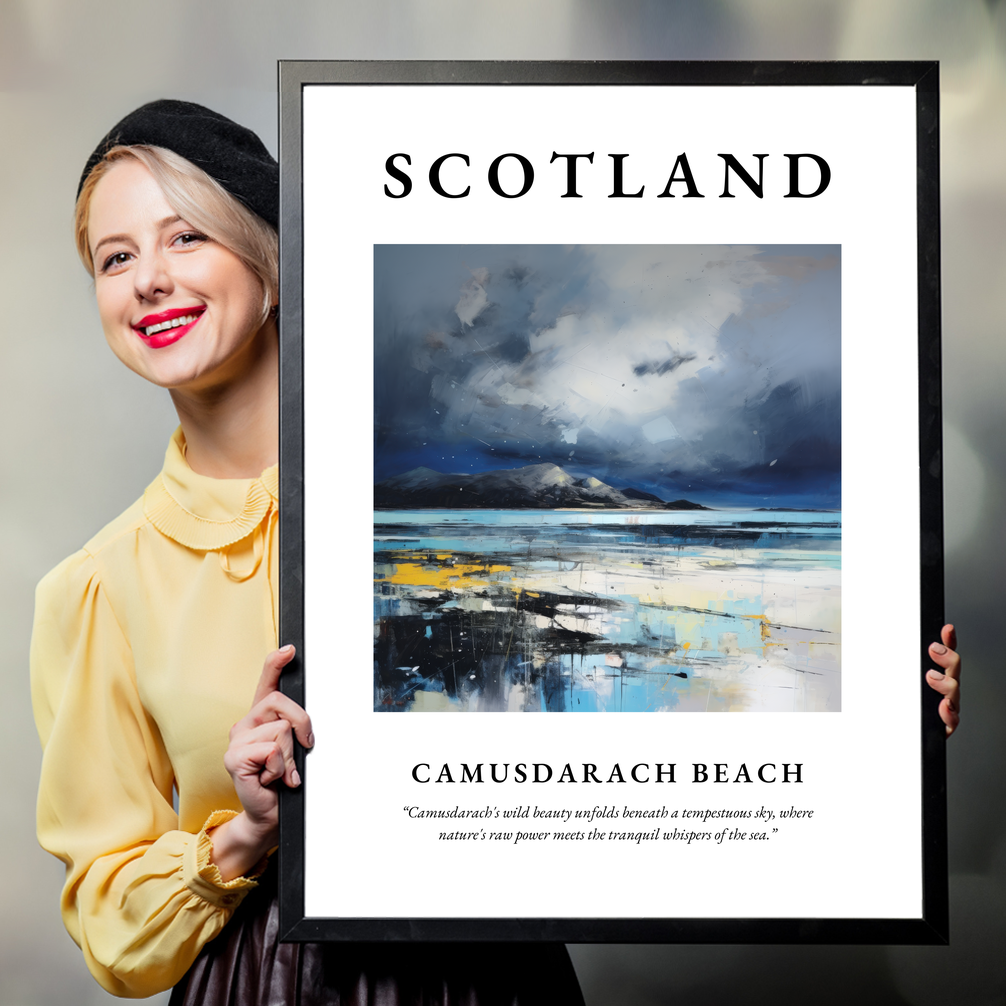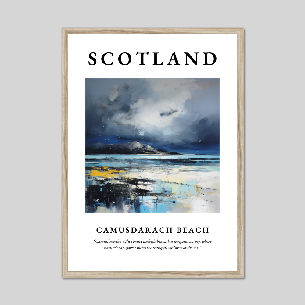 Available in sophisticated black, crisp white, or a natural wood-effect frame, the poster seamlessly complements any interior style, whether you're aiming for modern minimalism or cosy rustic charm. The bold “SCOTLAND” emblazoned at the top sets the stage for the enchanting abstract painting of Camusdarach Beach below. This piece of art captures the essence of the beach with broad, expressive strokes that evoke the dynamic dance between sea and sky. Beneath the painting, the quote “Camusdarach's wild beauty unfolds beneath a tempestuous sky, where nature's raw power meets the tranquil whispers of the sea” captures the mood perfectly.