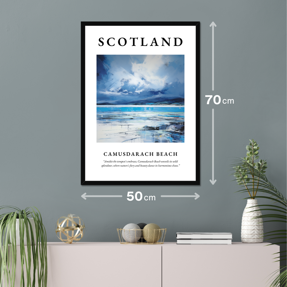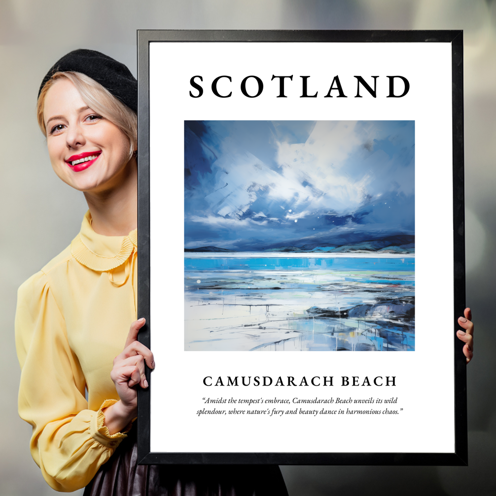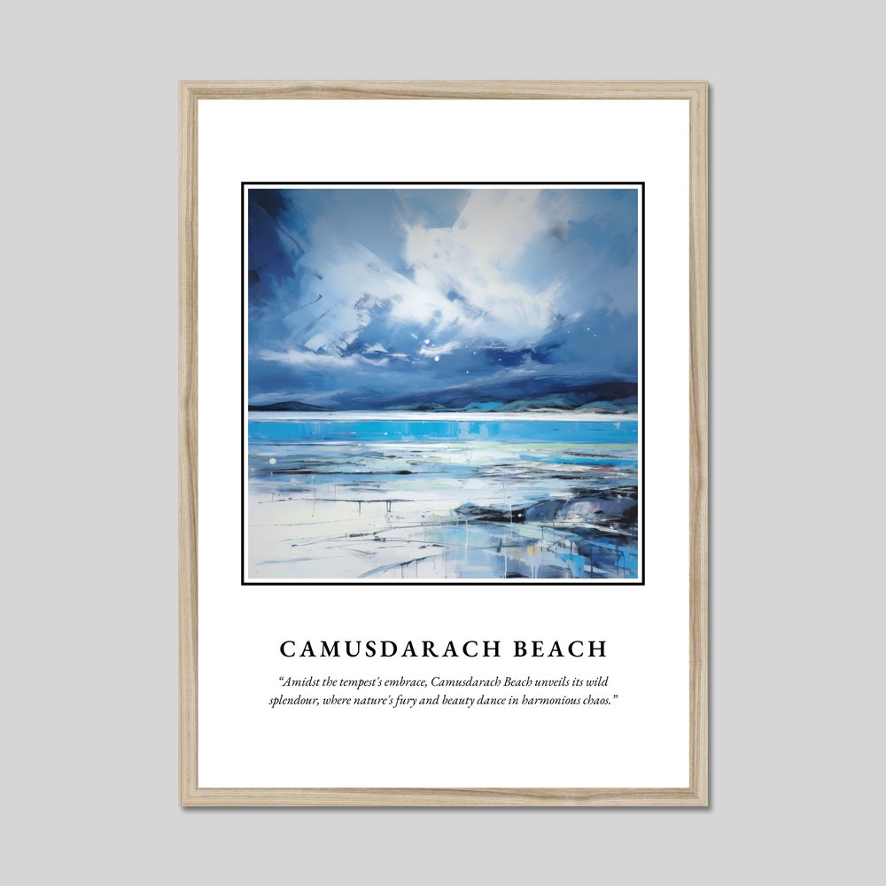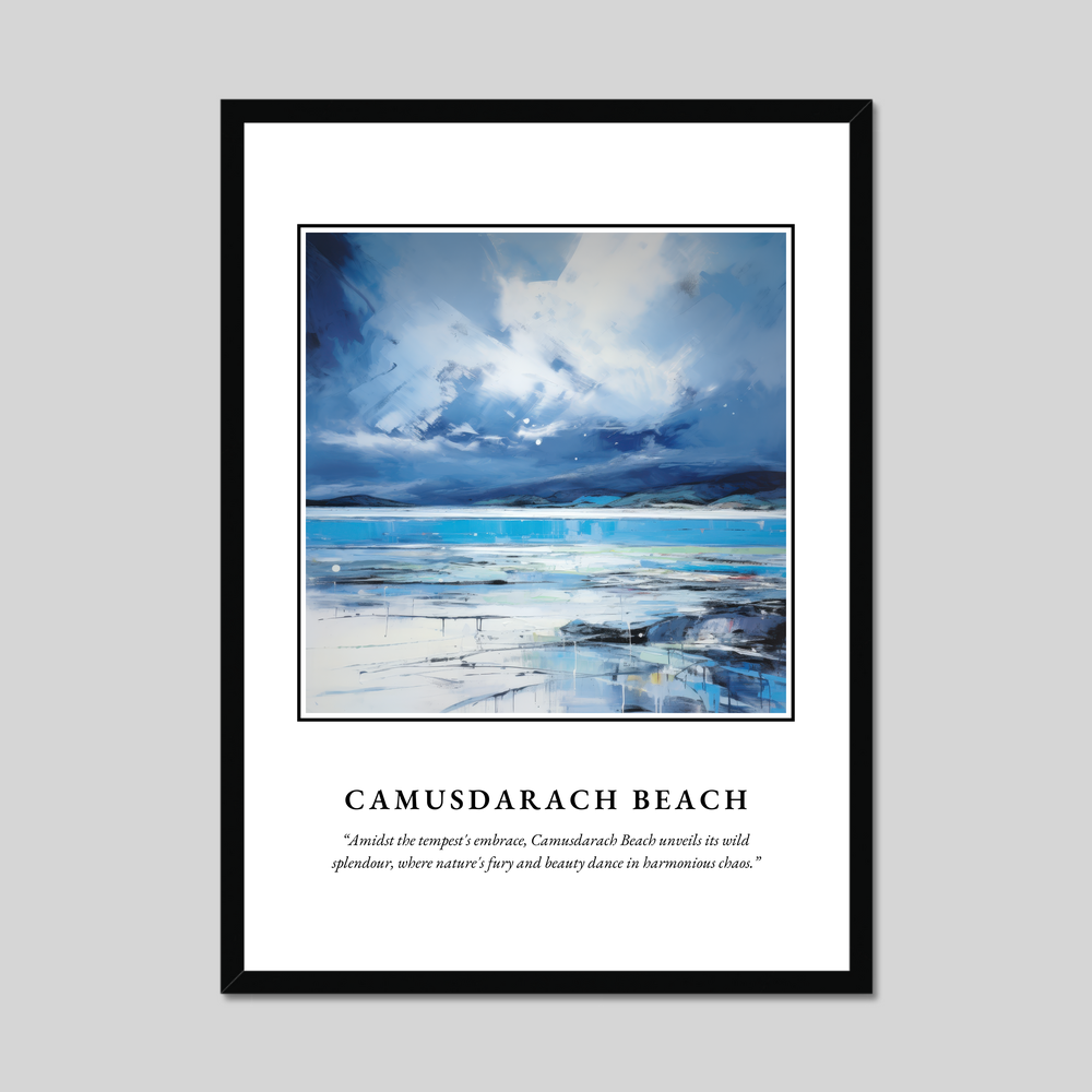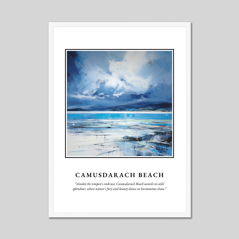 A quote, nestled beneath the artwork, reads, “Amidst the tempest's embrace, Camusdarach Beach unveils its wild splendour, where nature's fury and beauty dance in harmonious chaos.” This evocative line invites reflection, resonating with anyone who has felt the beach's magic or yearns for such an experience.