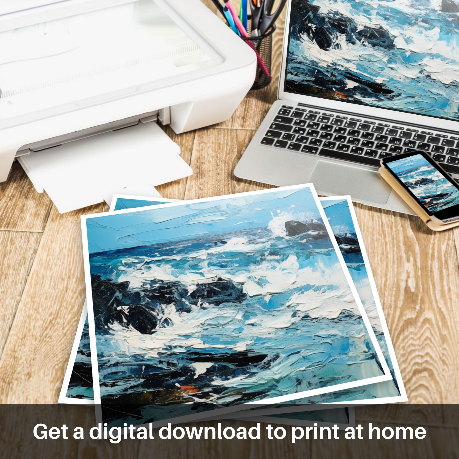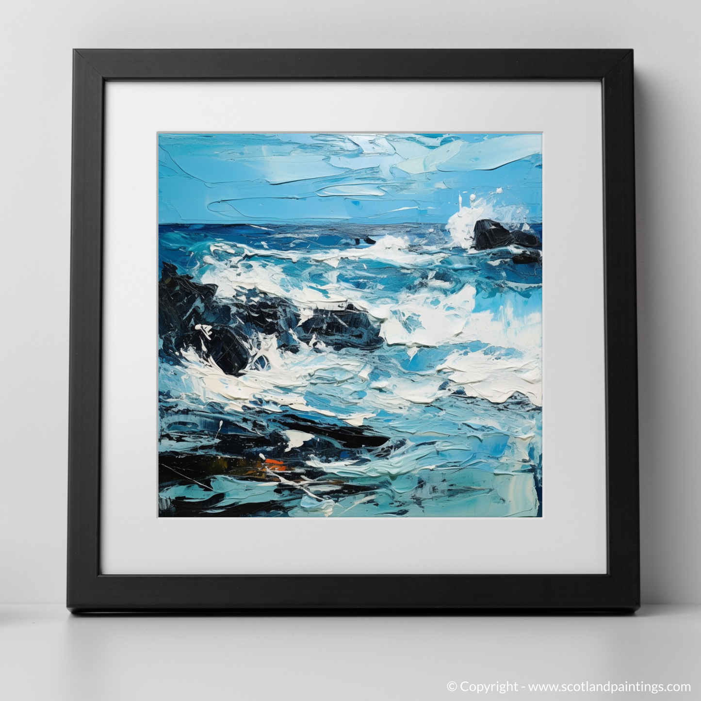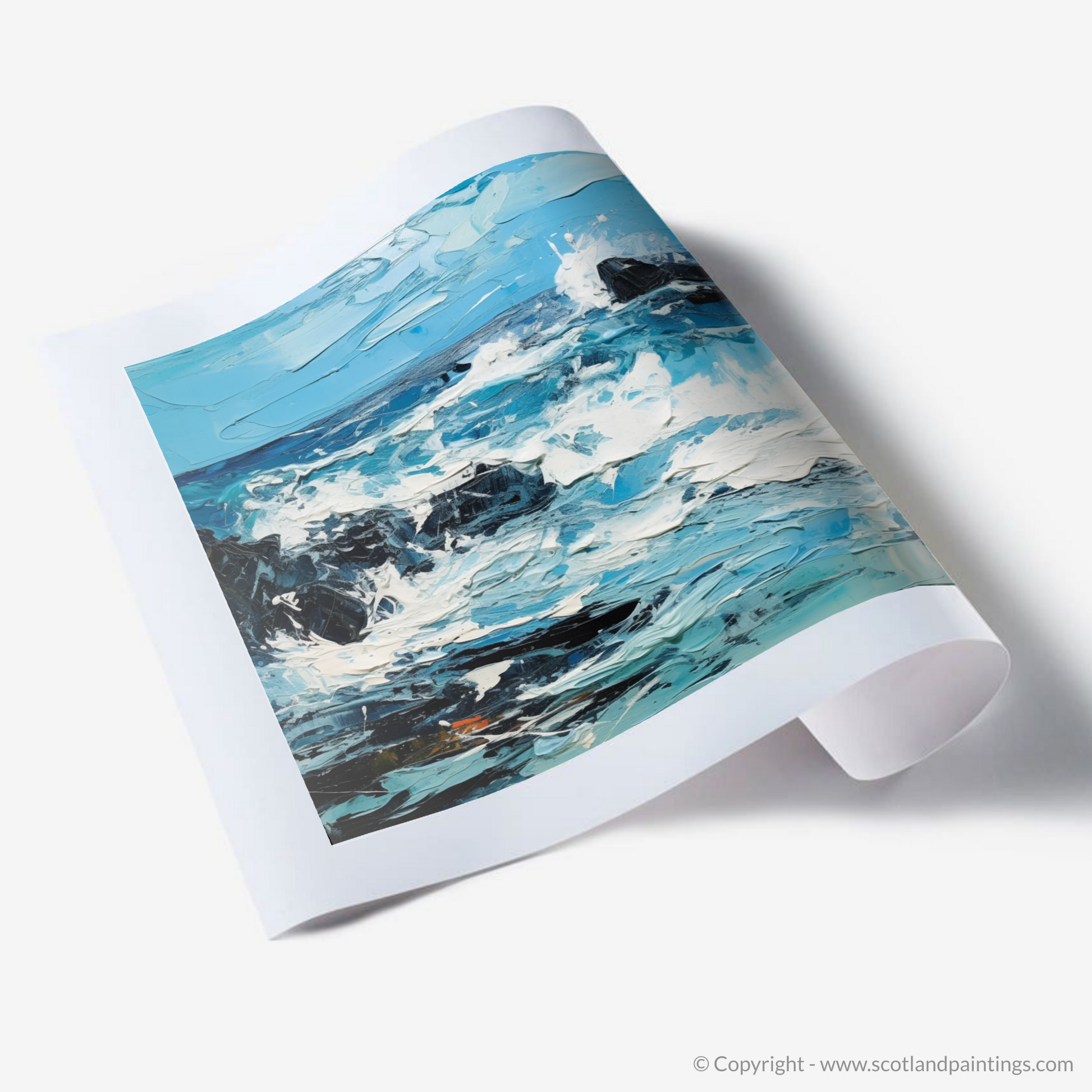 Let the drama of the Scottish coastline embrace your senses with this captivating print, inspired by the turbulent beauty of Camusdarach Beach. The restless spirit of the sea comes alive through bold strokes and a palette of deep blues, frothy whites, and mysterious greys that dance across the canvas in a symphony of colour and motion. Each layer of paint is applied with an energy that echoes the untamed nature of Scotland's marine landscape.