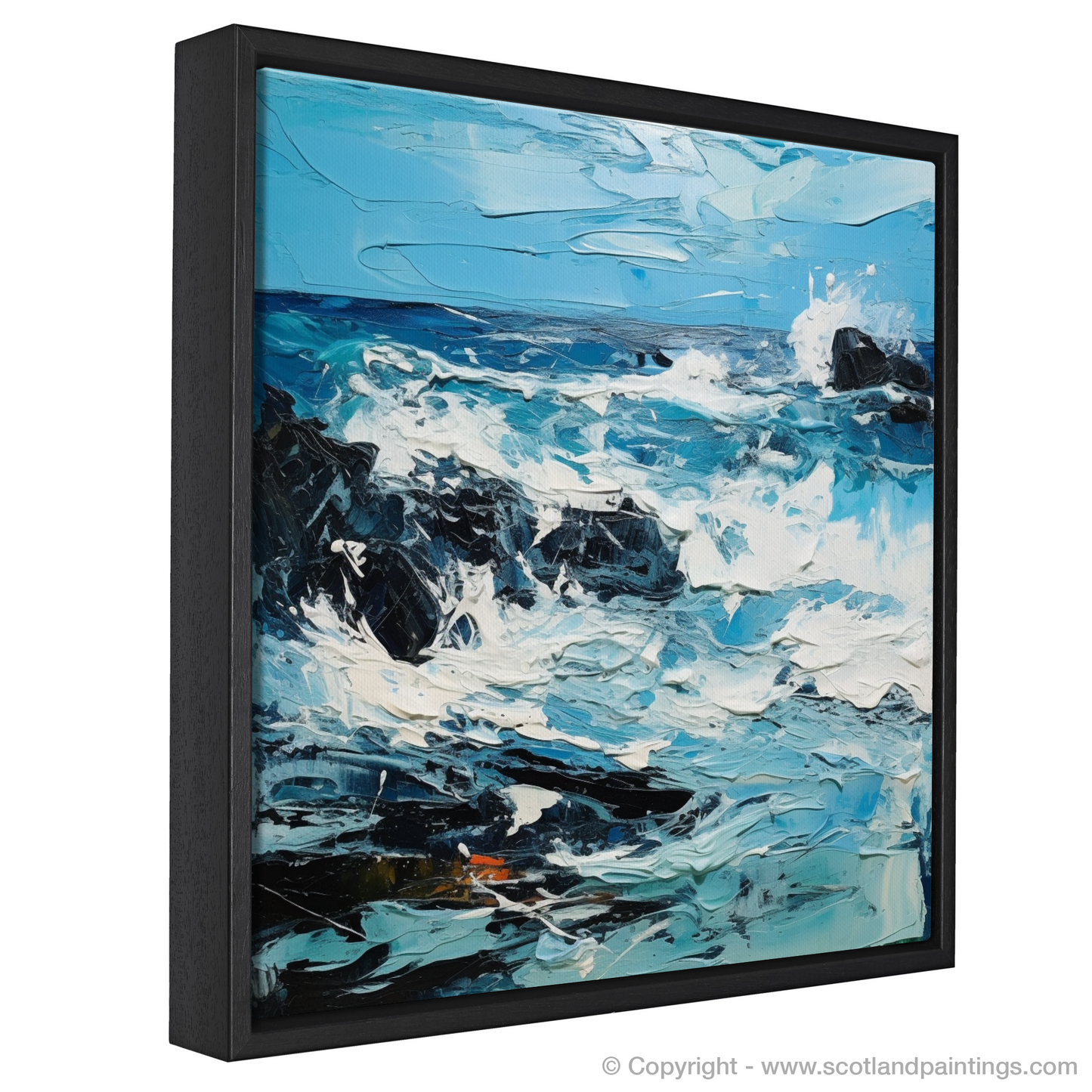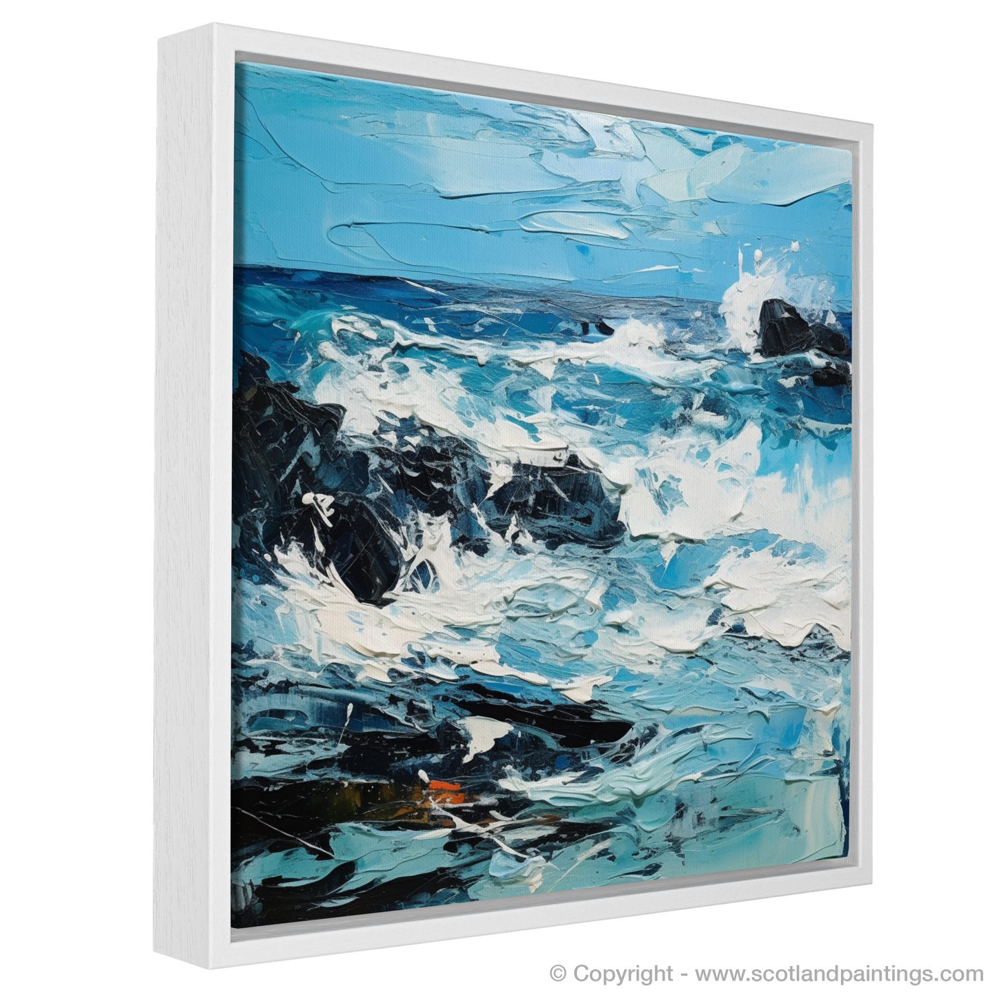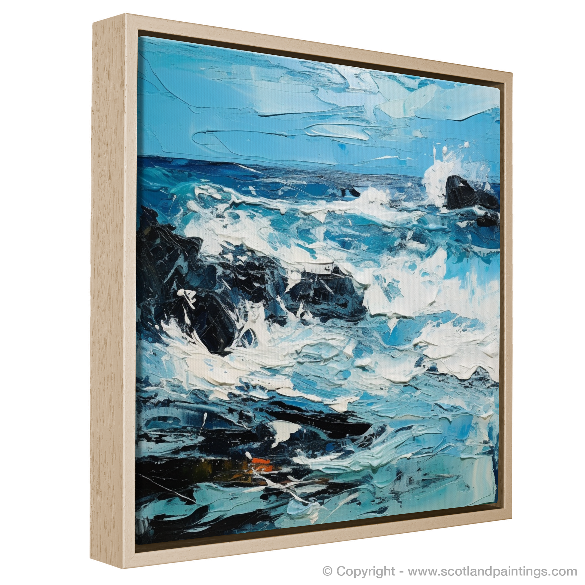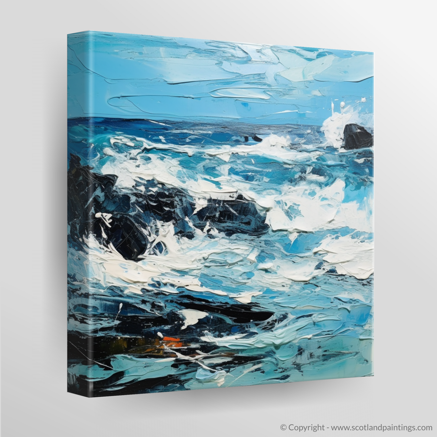 Let the drama of the Scottish coastline embrace your senses with this captivating print, inspired by the turbulent beauty of Camusdarach Beach. The restless spirit of the sea comes alive through bold strokes and a palette of deep blues, frothy whites, and mysterious greys that dance across the canvas in a symphony of colour and motion. Each layer of paint is applied with an energy that echoes the untamed nature of Scotland's marine landscape.