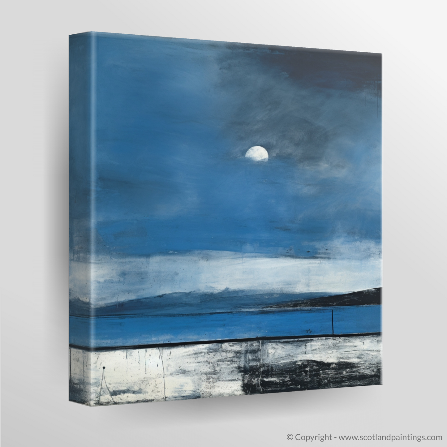 The horizon divides the composition into a powerful symphony of color and texture. Intense hues of deep azure clash with the paler slate tones of the sky, mimicking the dynamic dance of the stormy Scottish skies. Below, a contrasting strip of nocturnal black imbued with smudges and sweeps of white suggests a distant shoreline amidst the chaos of the elements.