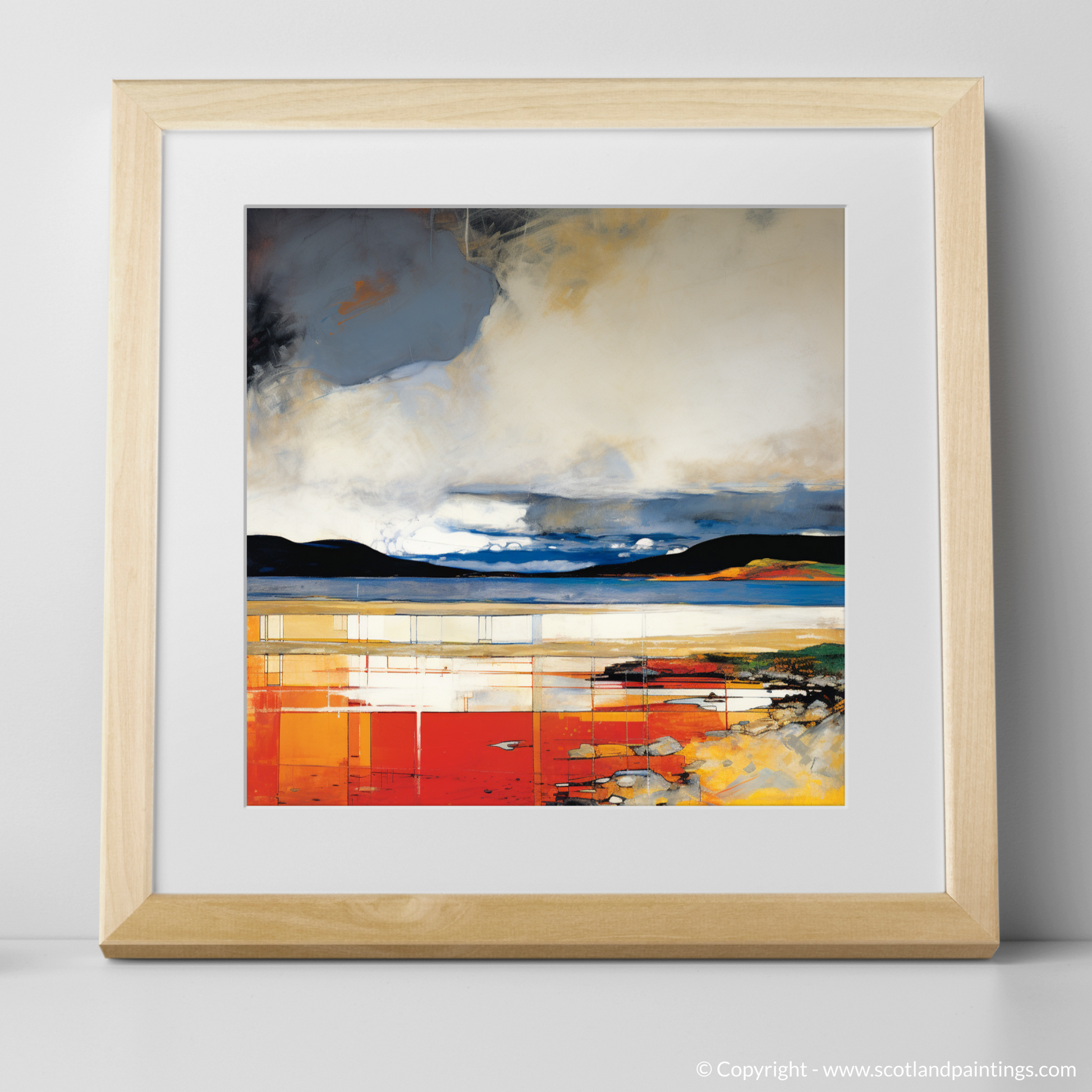 Awaken your senses with this evocative abstraction of Camusdarach Beach, capturing the wild soul of the Scottish shores. The print brings to life the tumultuous dance of the stormy sky above, where swirling greys and tranquil whites churn together in a dramatic overture. Under this brooding canopy, the horizon whispers of distant hills, painted in tranquil hues that promise the quiet respite of nature's untouched beauty.