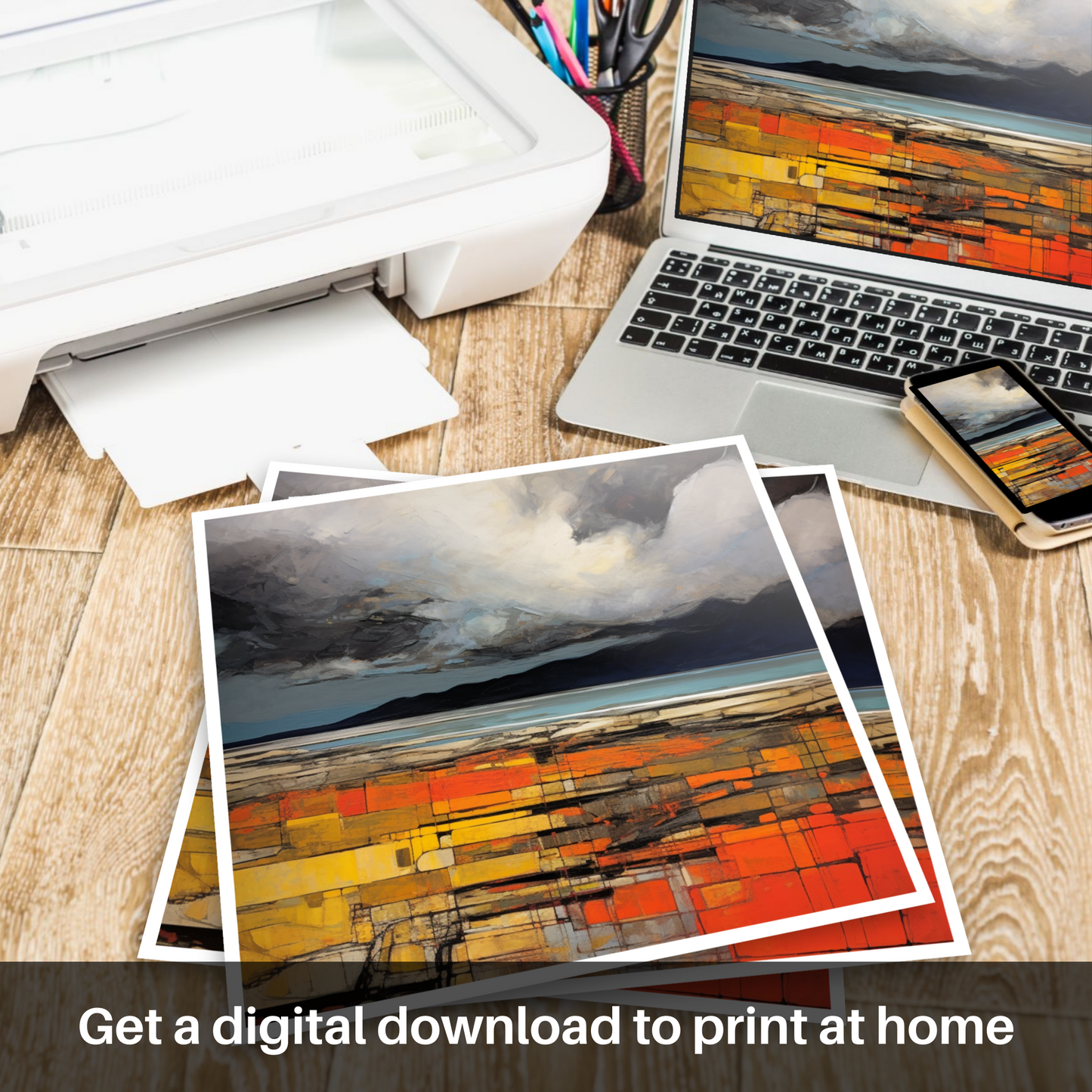 This piece transports the viewer to a place where the sky meets the sea, and the land is ablaze with colour. The dramatic interplay between the storm's fury and the beach's vibrancy echoes the wild spirit of the Scottish shores. Whether displayed in a living room, study, or office, this print is sure to add a dynamic visual interest and a touch of abstract elegance to any interior.