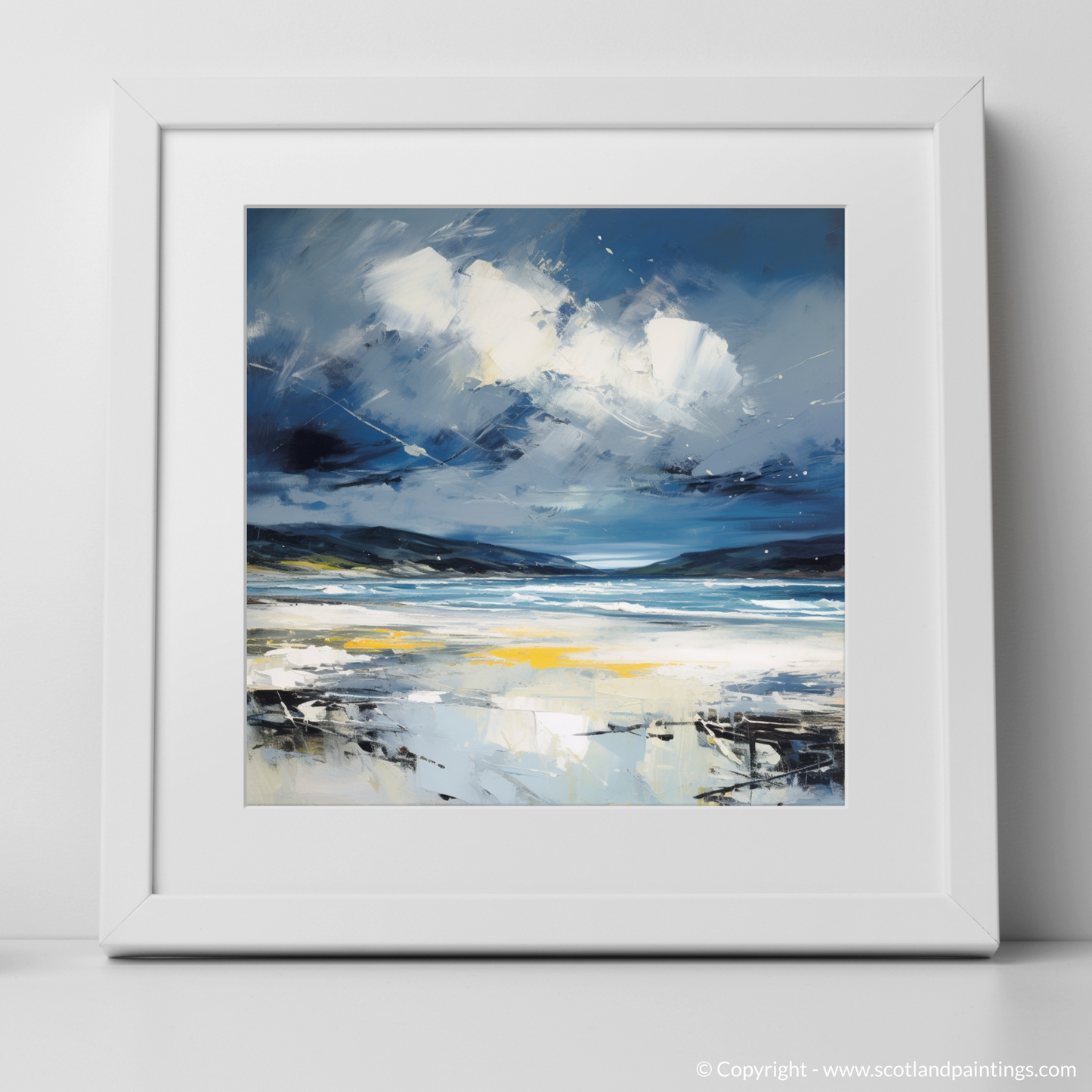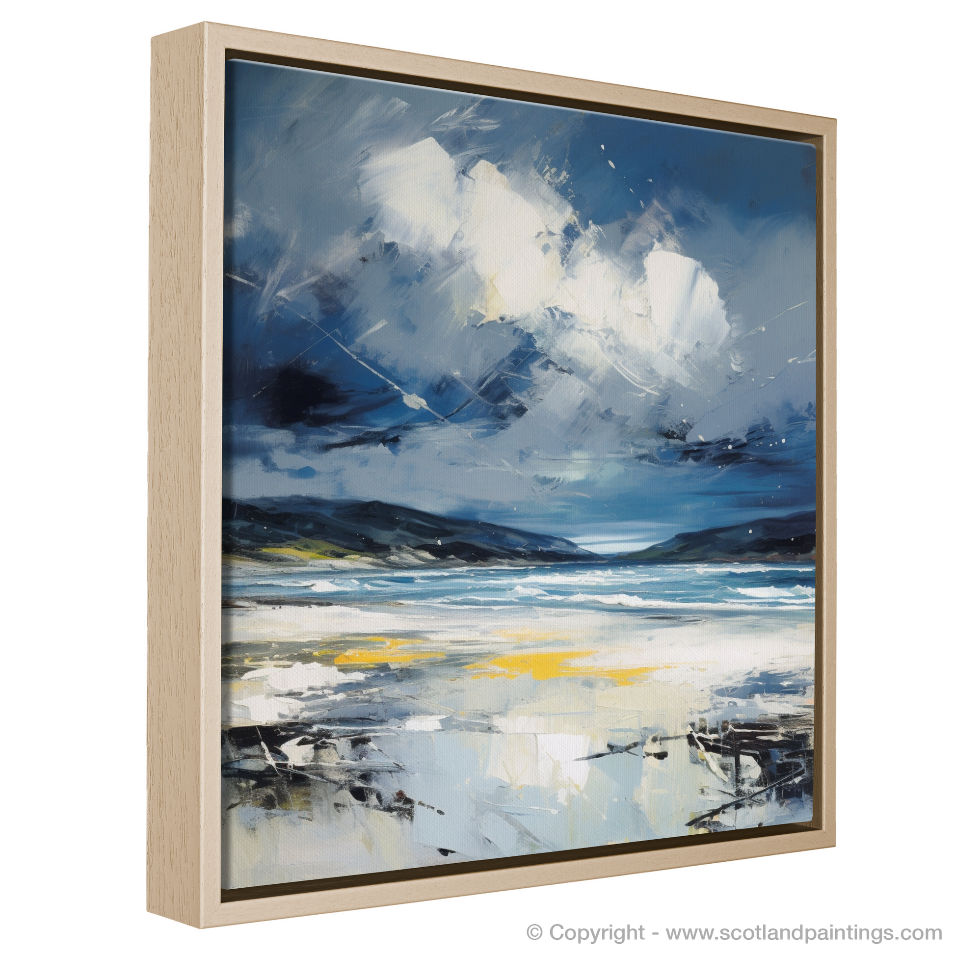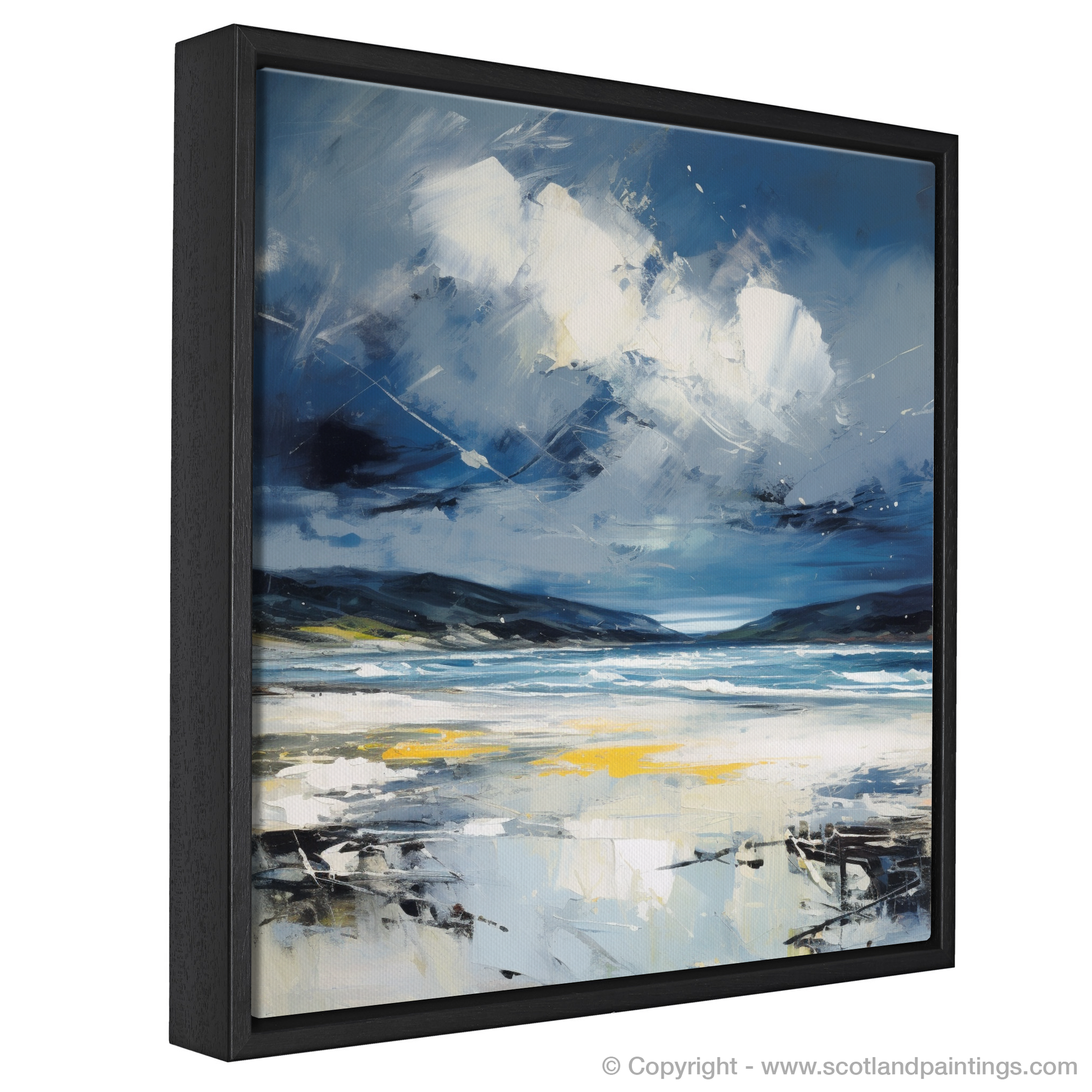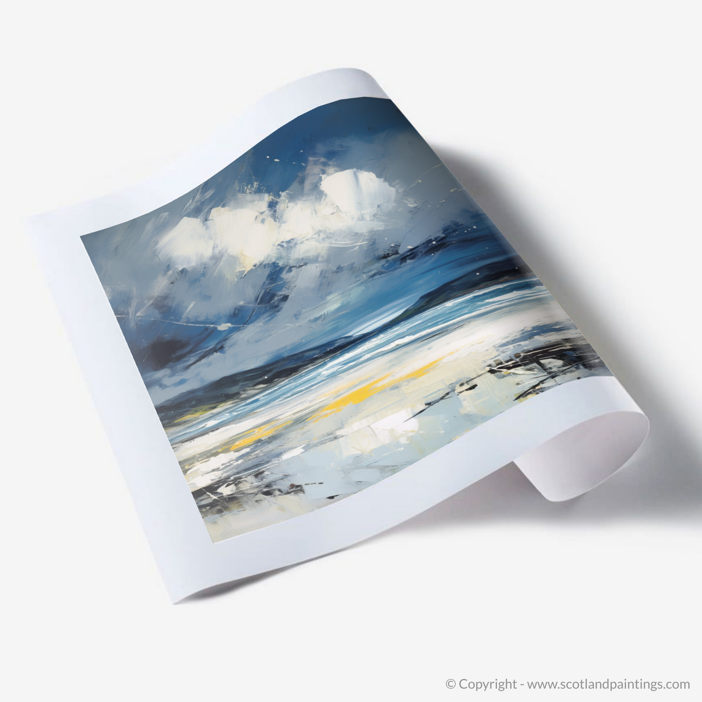 Evoke the rugged beauty of Scotland's coastlines with this evocative abstract expressionist print, capturing the tumultuous mood of Camusdarach Beach under a stormy sky. Awash with the dynamic movement of the elements, the artwork masterfully conveys the fierce dance between land and sea that is so characteristic of the Scottish terrain.