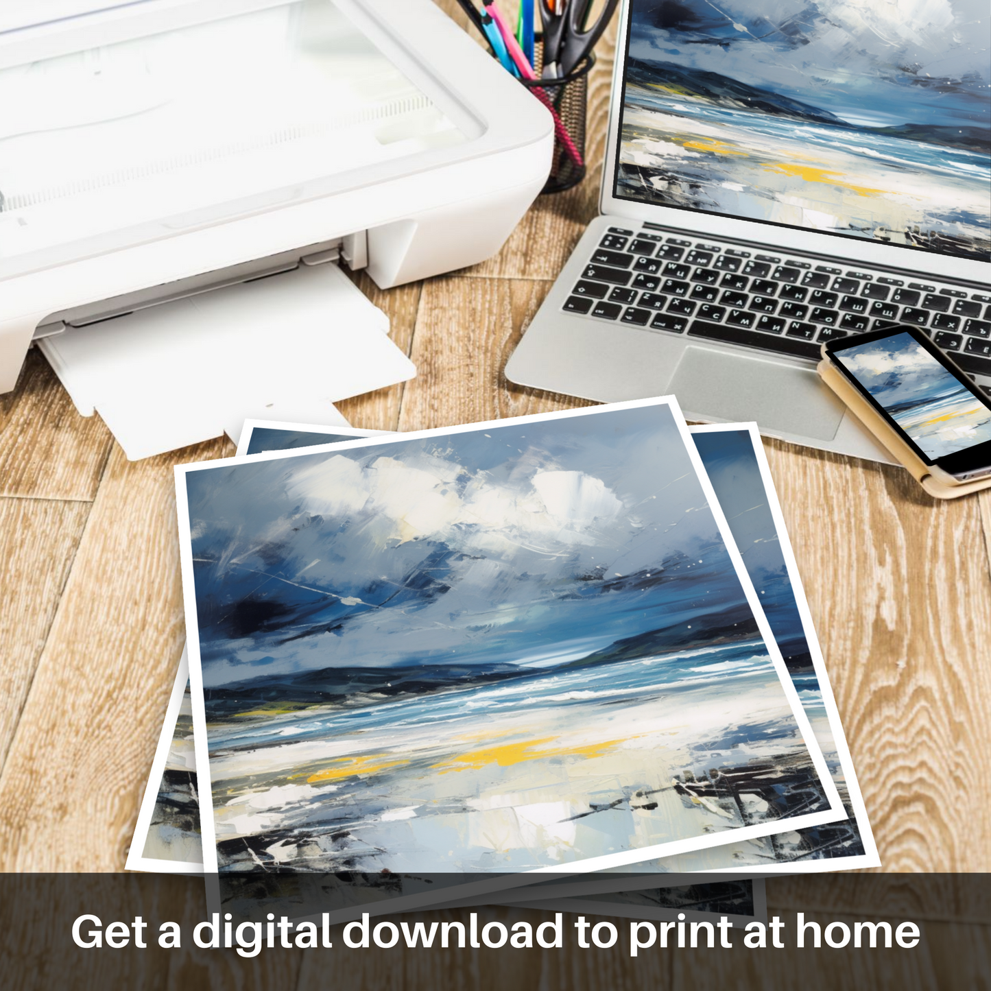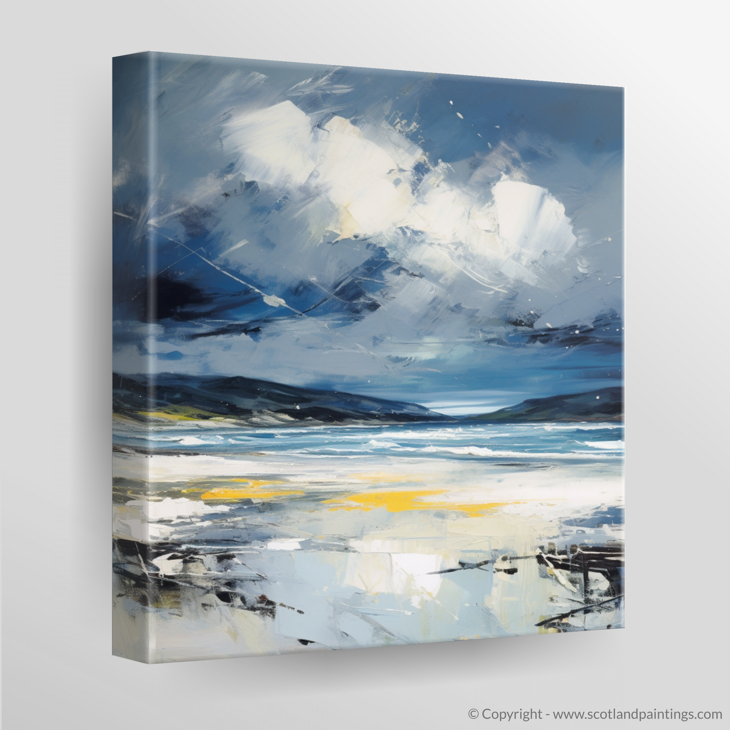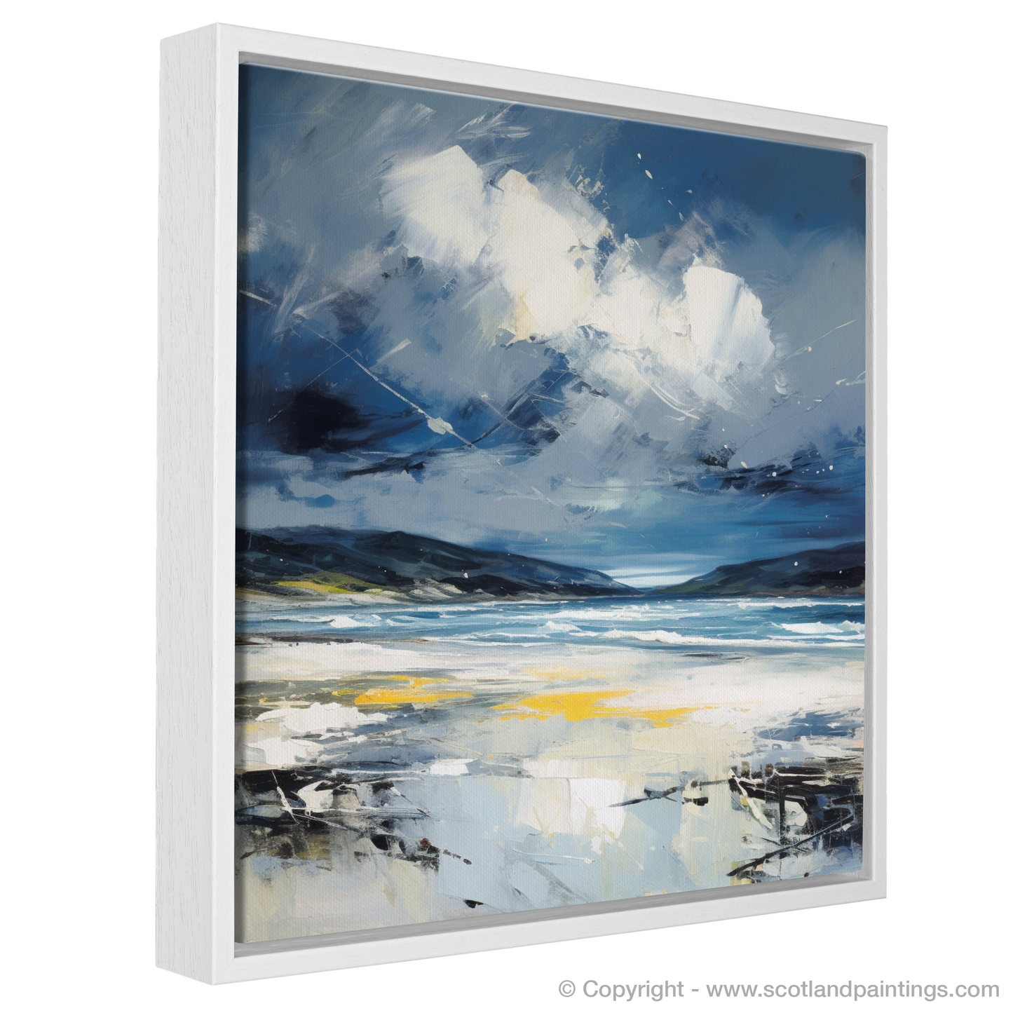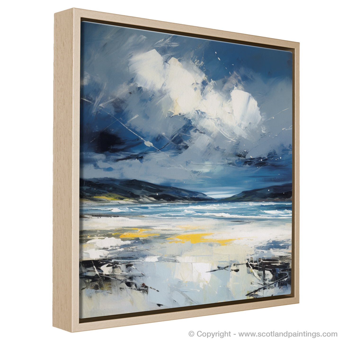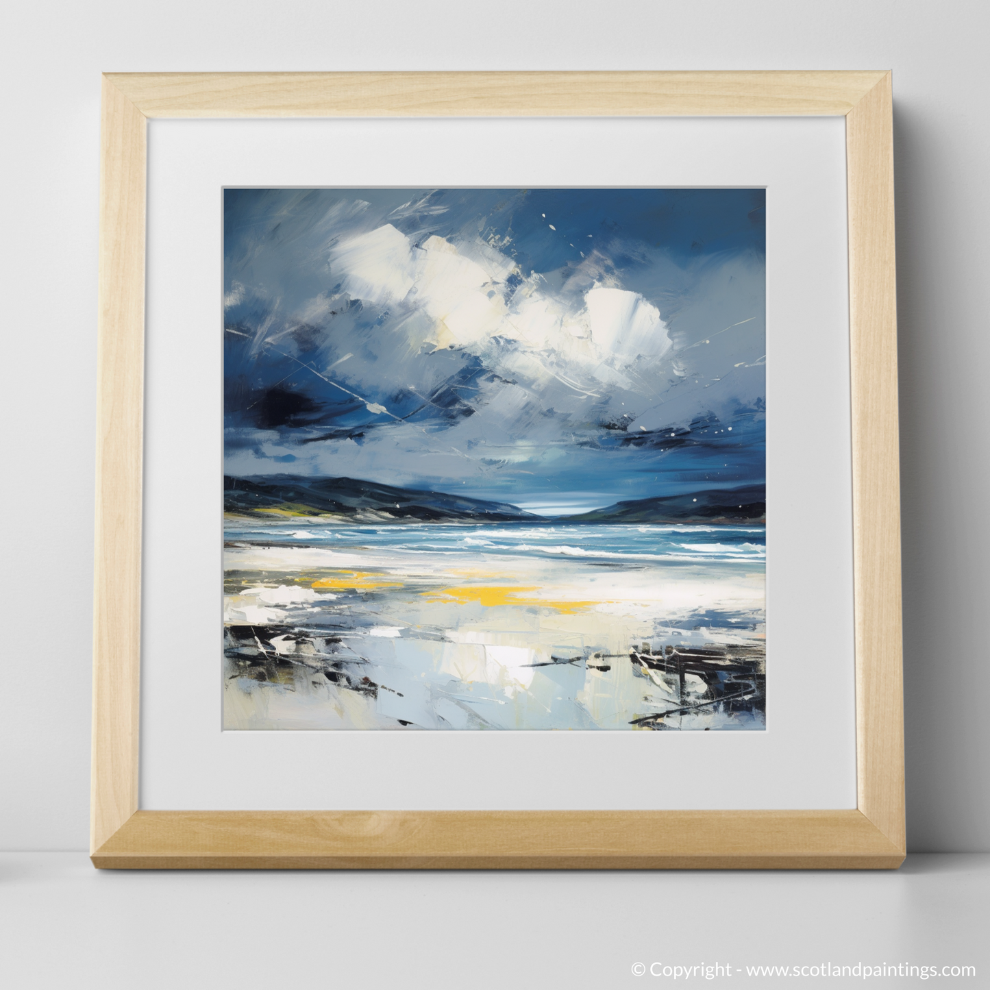 Evoke the rugged beauty of Scotland's coastlines with this evocative abstract expressionist print, capturing the tumultuous mood of Camusdarach Beach under a stormy sky. Awash with the dynamic movement of the elements, the artwork masterfully conveys the fierce dance between land and sea that is so characteristic of the Scottish terrain.