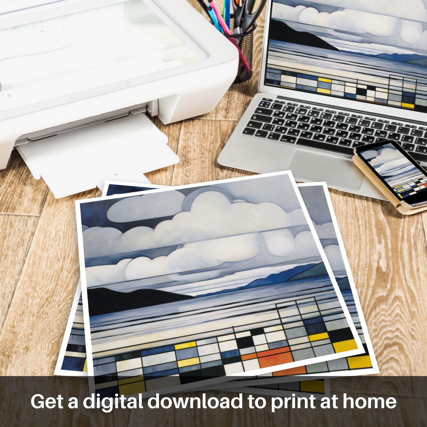 Beneath the storm, the horizon is a harmonious juxtaposition of tranquil blue and deep indigo, suggesting distant hills that recede into the embrace of the sea. Straddling the boundary between these natural elements, the waters below are captured in placid shades of blue and white, their horizontal stripes imbuing a calm stillness, contrasting sharply with the unsettled sky.