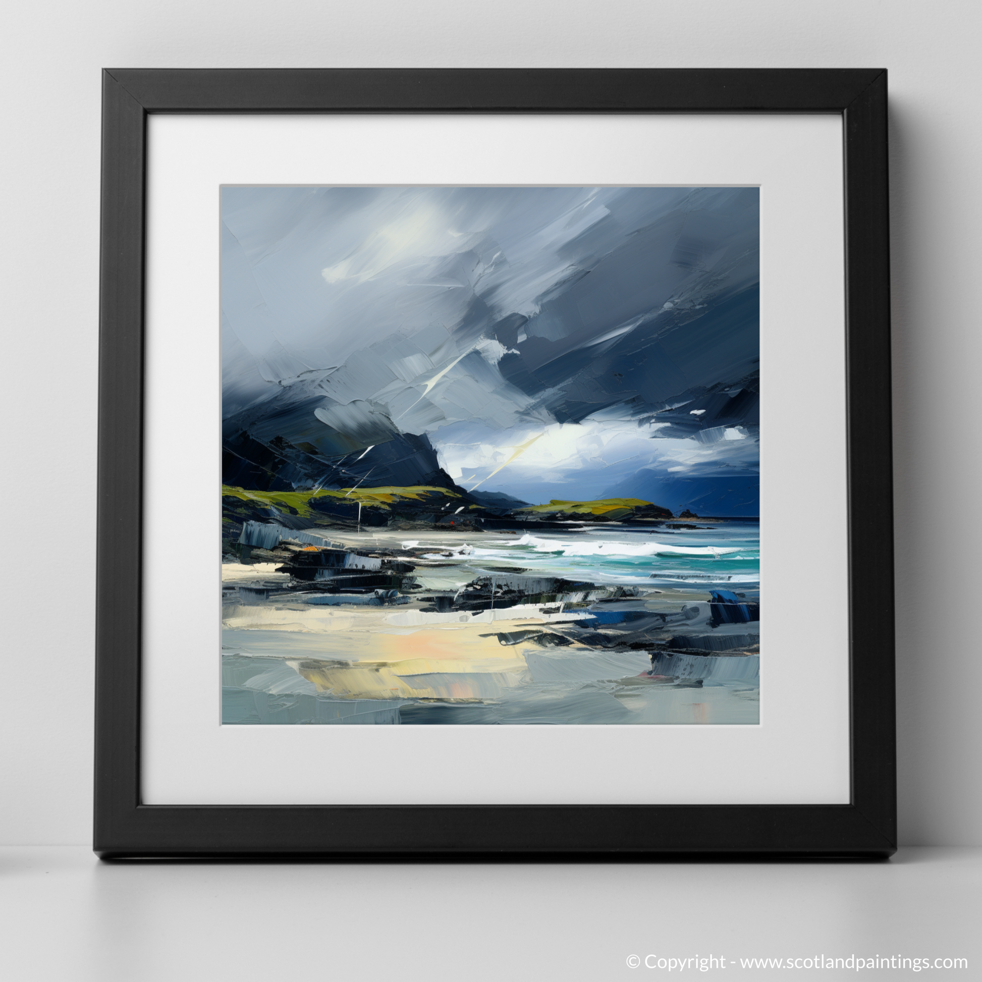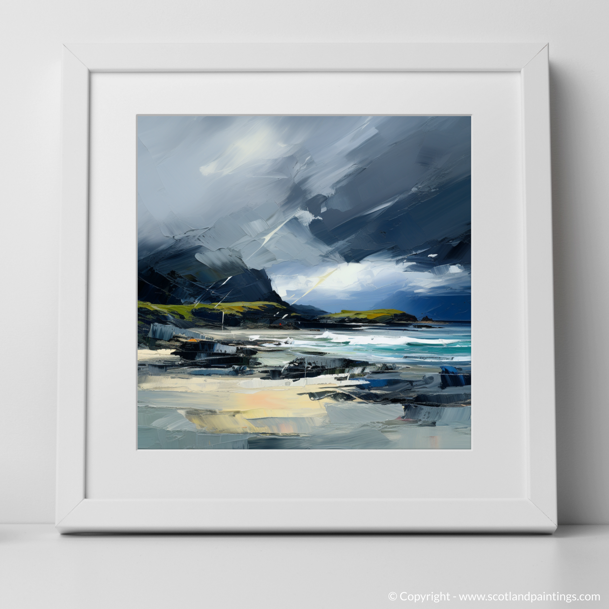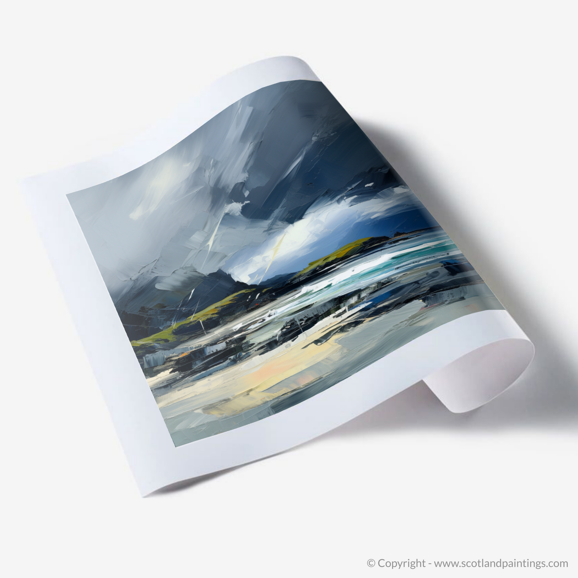 Immerse yourself in the wild, unbridled spirit of the Scottish coast with this evocative print. Capturing the essence of Camusdarach Beach beneath a tumultuous sky, the piece holds within it the ferocity and drama of nature's theatre. Swathes of heavy greys and whites clash above, a symphony of brushstrokes that capture the swirling tempest above. Touches of blue sky break through, hinting at the calm that can follow the storm, and infusing the composition with a dynamic contrast between serenity and chaos.