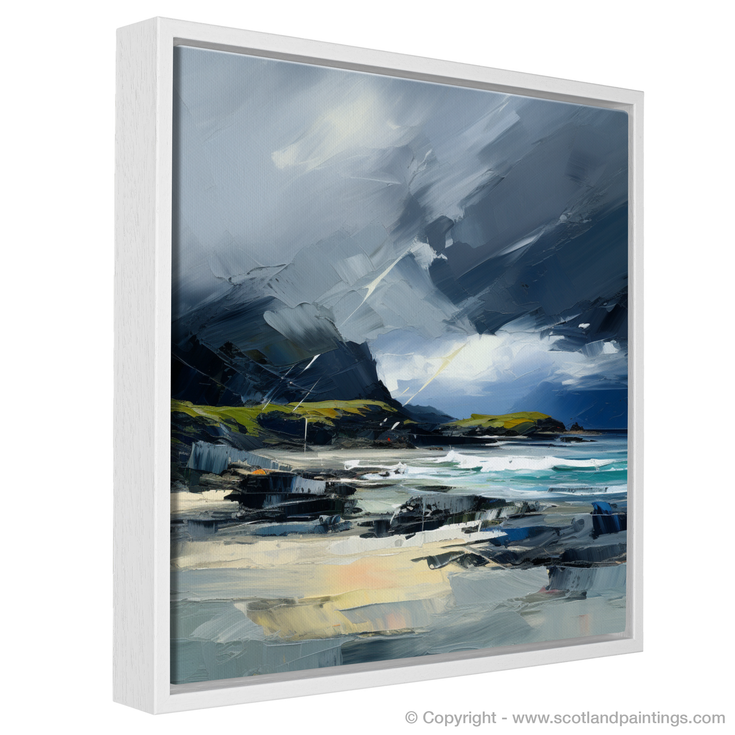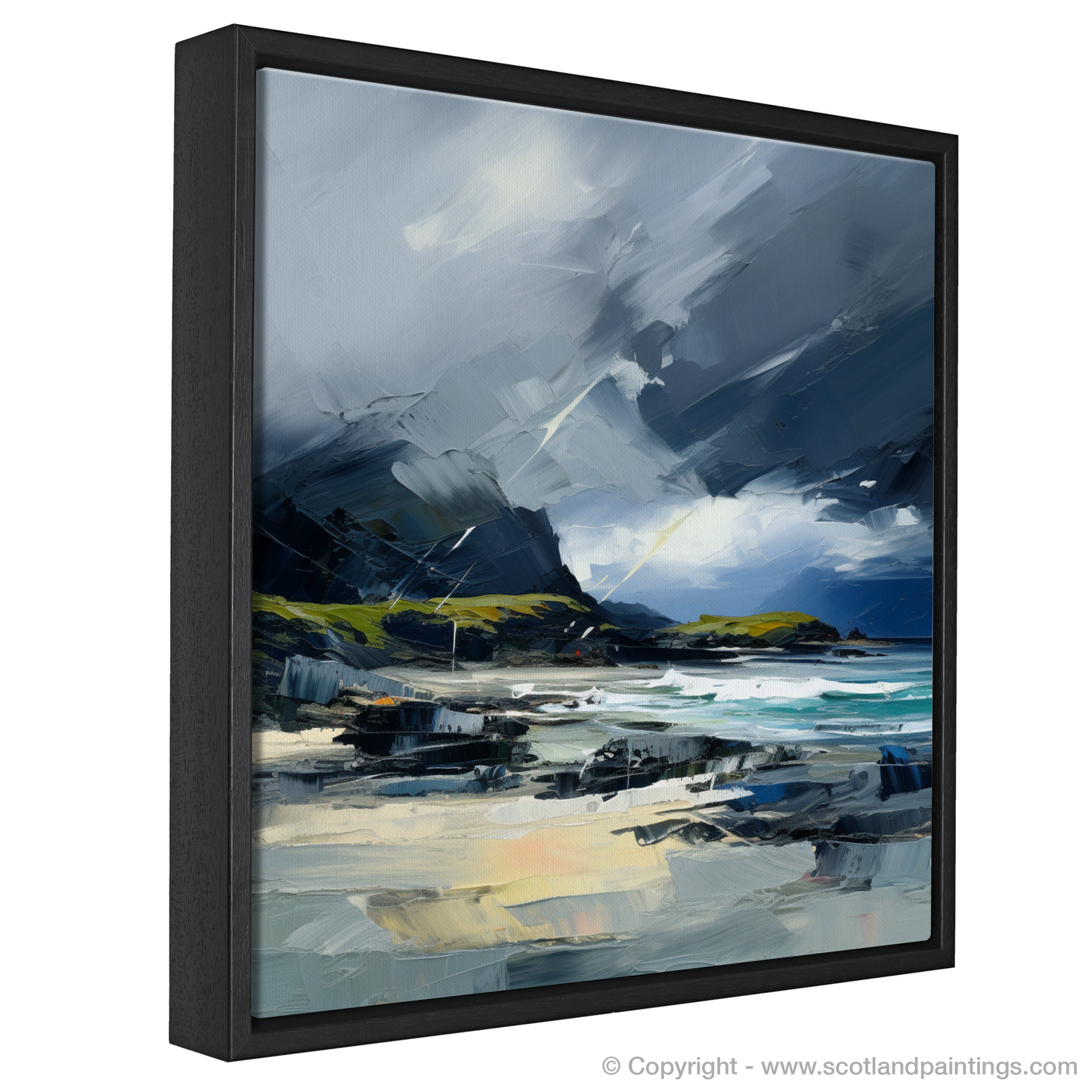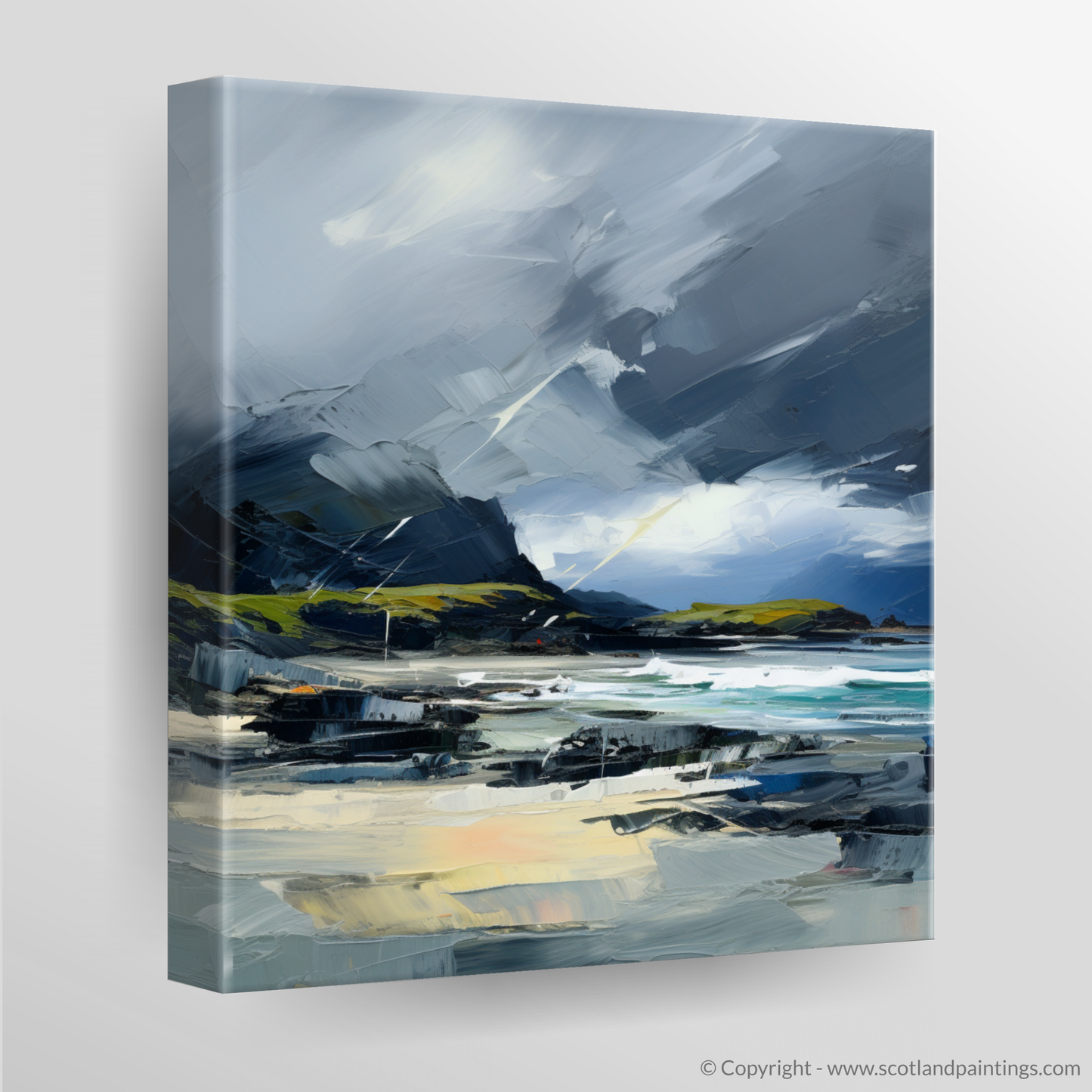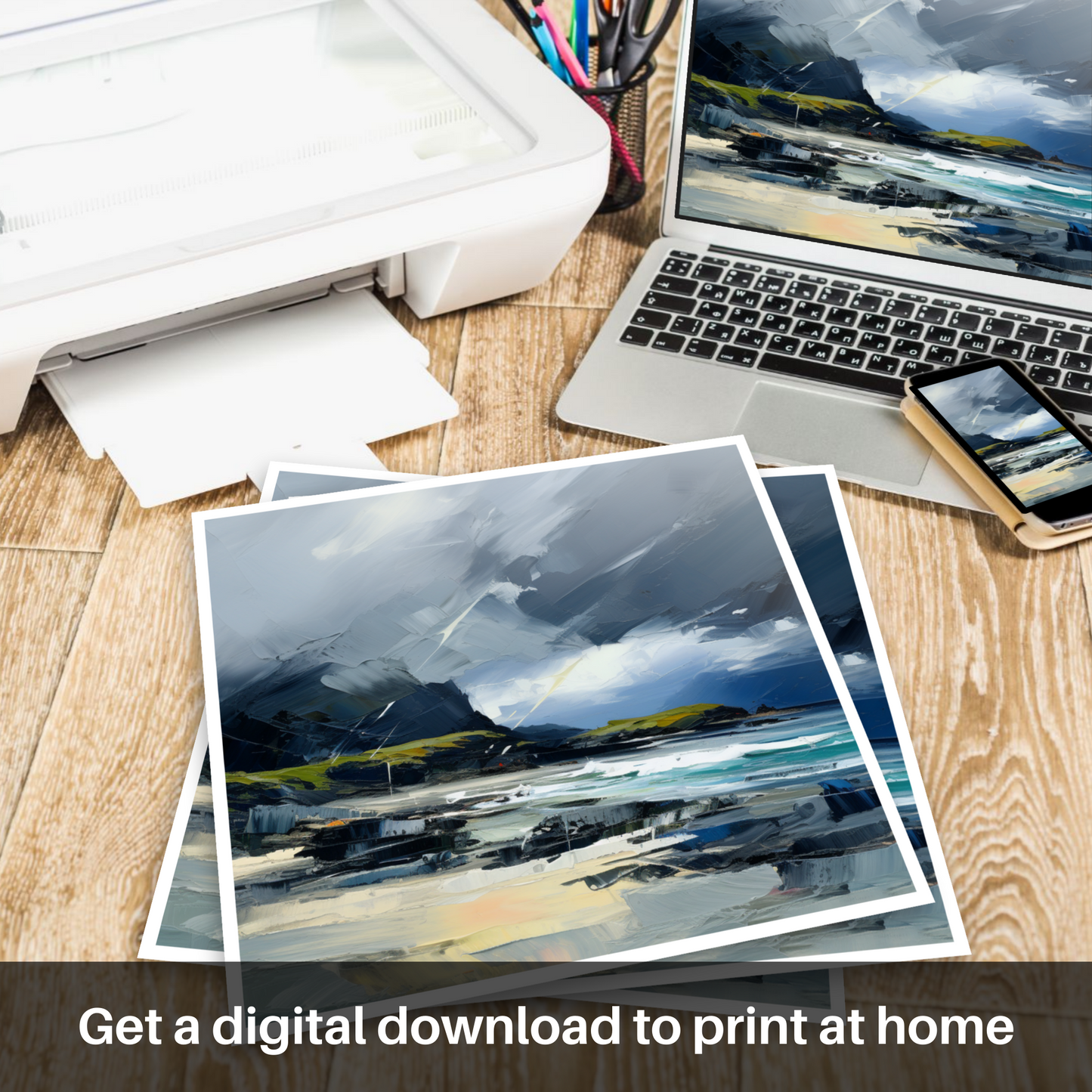 Immerse yourself in the wild, unbridled spirit of the Scottish coast with this evocative print. Capturing the essence of Camusdarach Beach beneath a tumultuous sky, the piece holds within it the ferocity and drama of nature's theatre. Swathes of heavy greys and whites clash above, a symphony of brushstrokes that capture the swirling tempest above. Touches of blue sky break through, hinting at the calm that can follow the storm, and infusing the composition with a dynamic contrast between serenity and chaos.