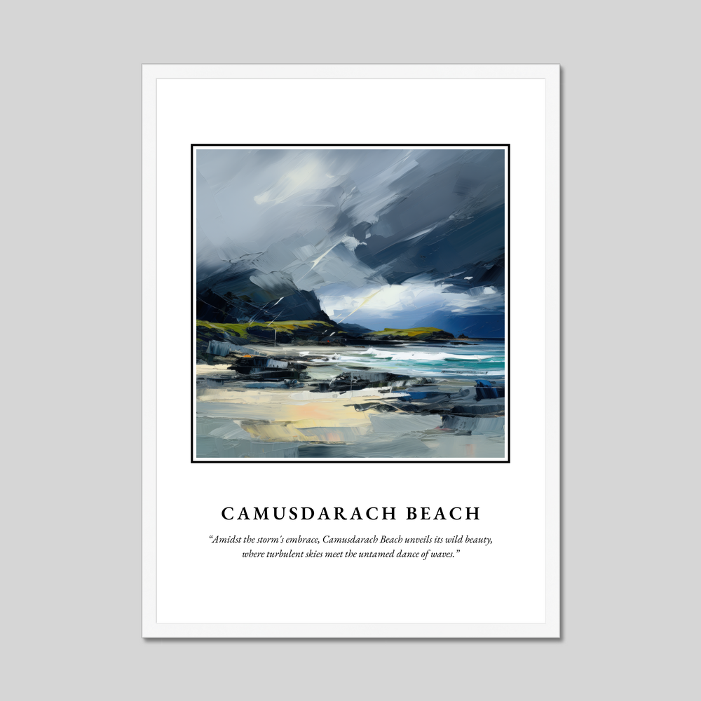 For those who have wandered this captivating stretch of coastline, this framed poster is more than just décor; it's a gateway back to the raw, untamed splendour of Camusdarach Beach — a striking reminder of nature’s fierce beauty and the tranquil moments found along Scotland’s shores.