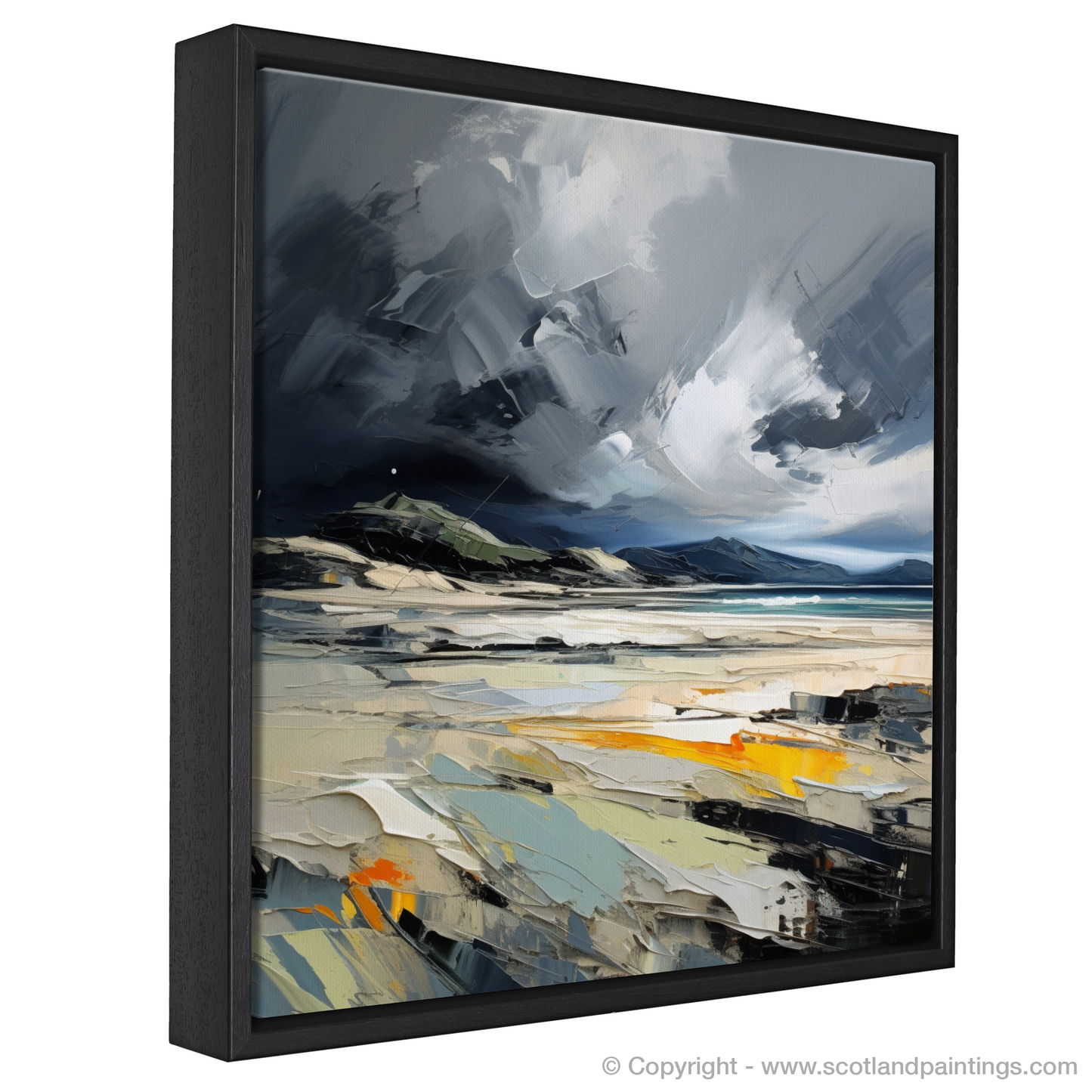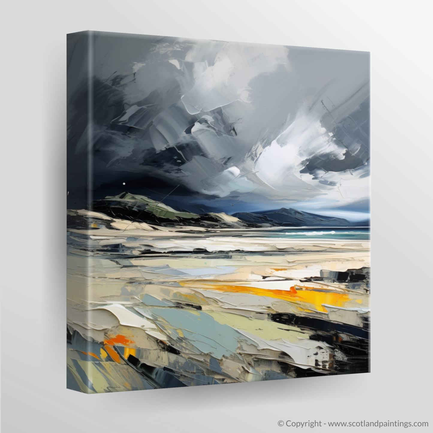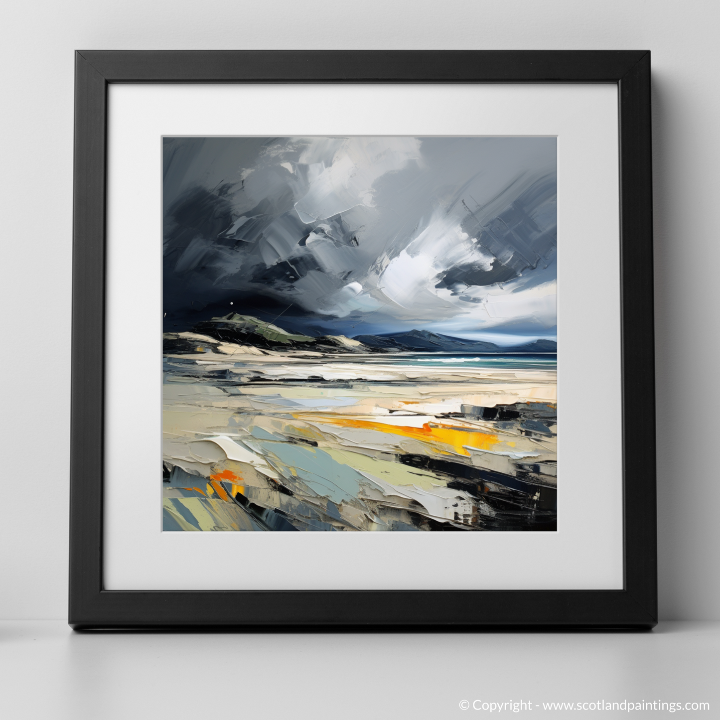 Streaks of ochre and splashes of white break through the sandy hues, mimicking the beach's raw charm as it clashes with the ebony-inked, rugged outcrops that stand like sentinels guarding the shore against the relentless waves. This piece is not just a print; it's a portal to the Highlands, a tactile expression that invites the viewer to feel the salt air and hear the symphony of the gales over the rough seas.