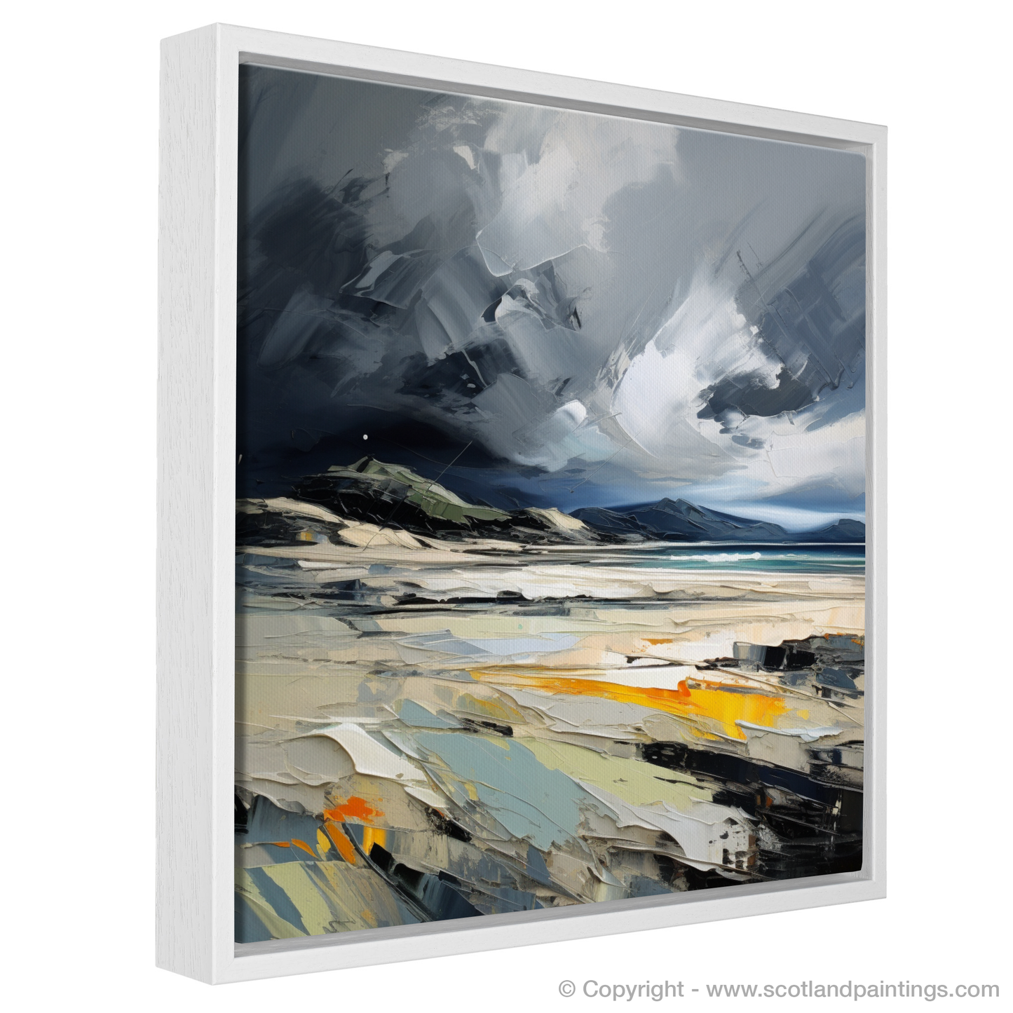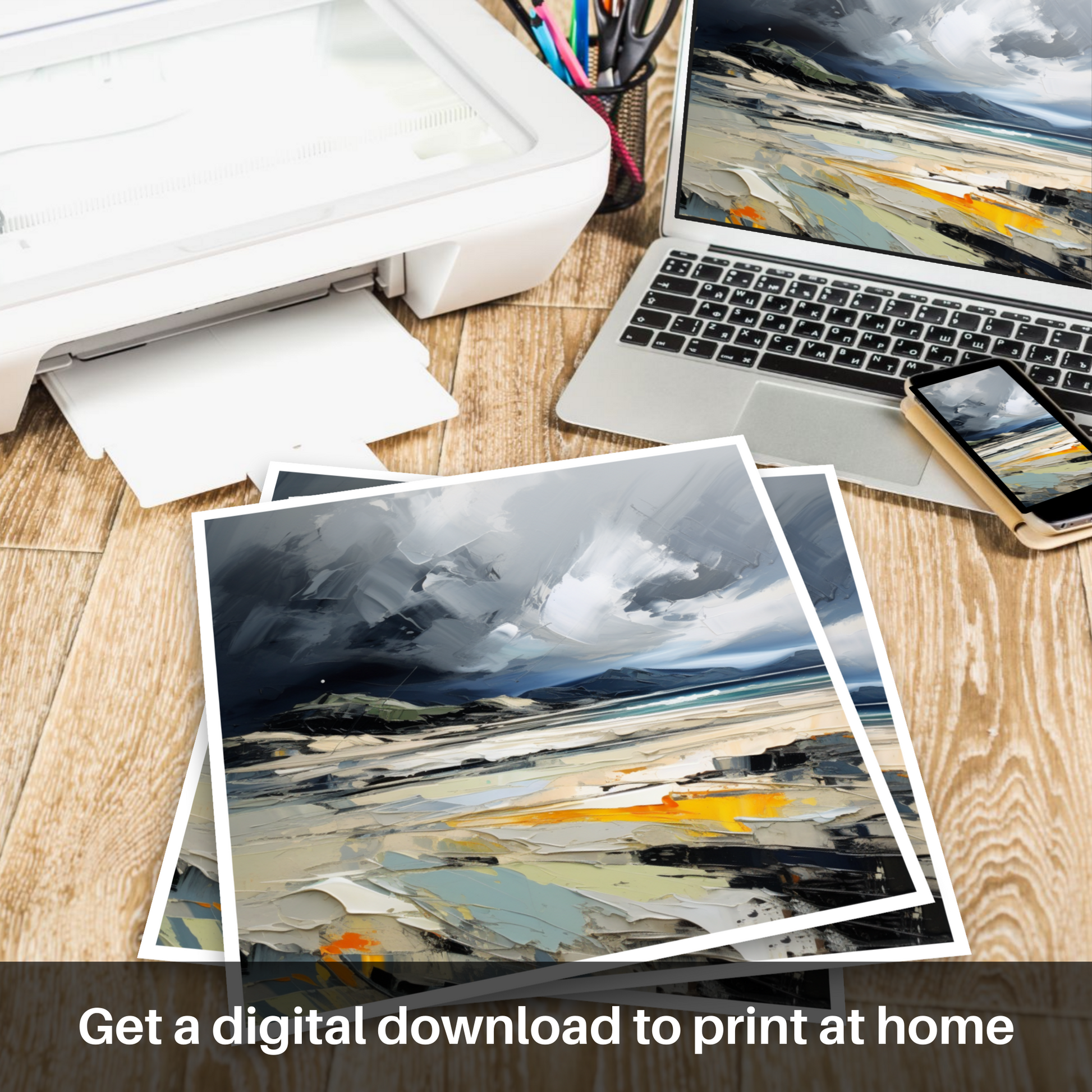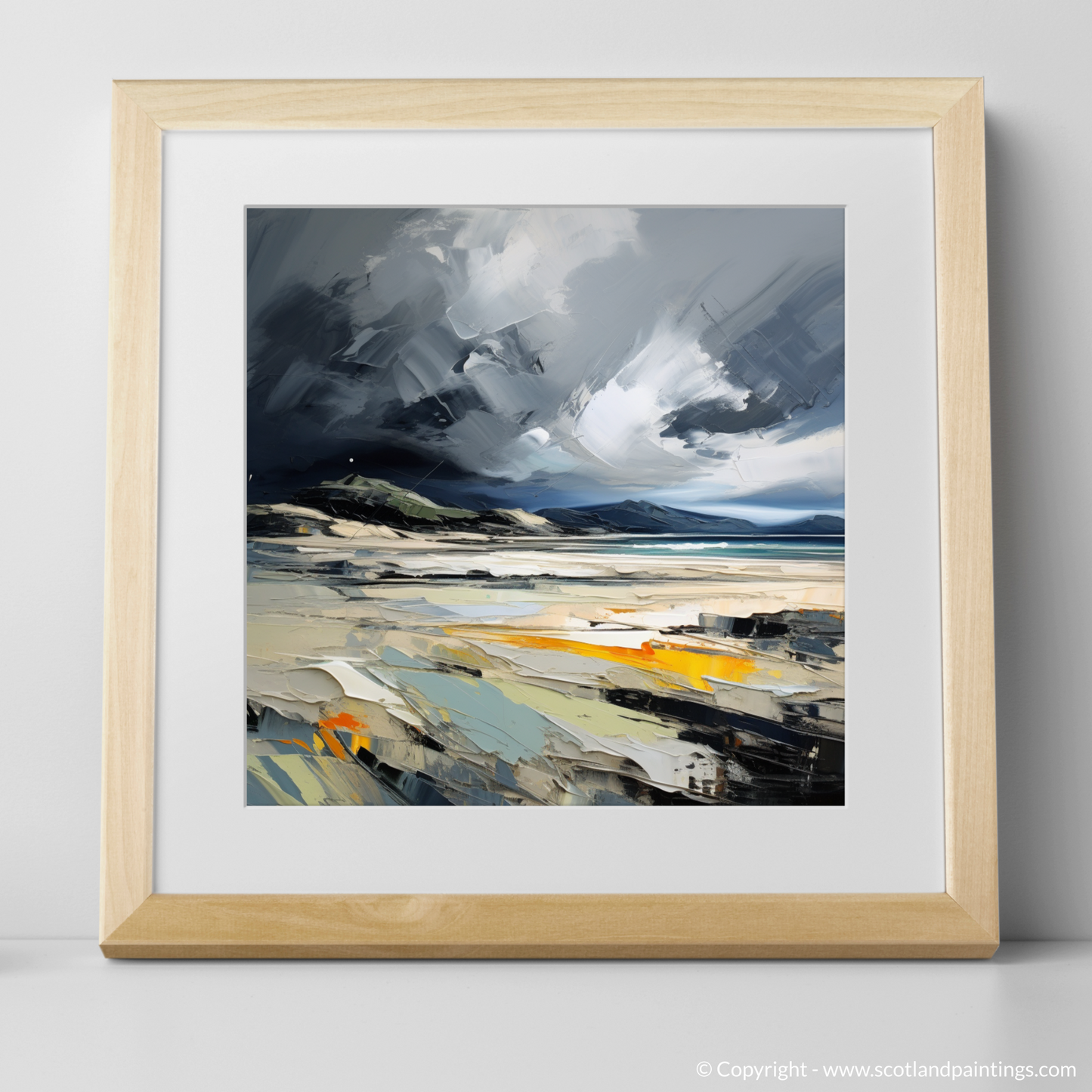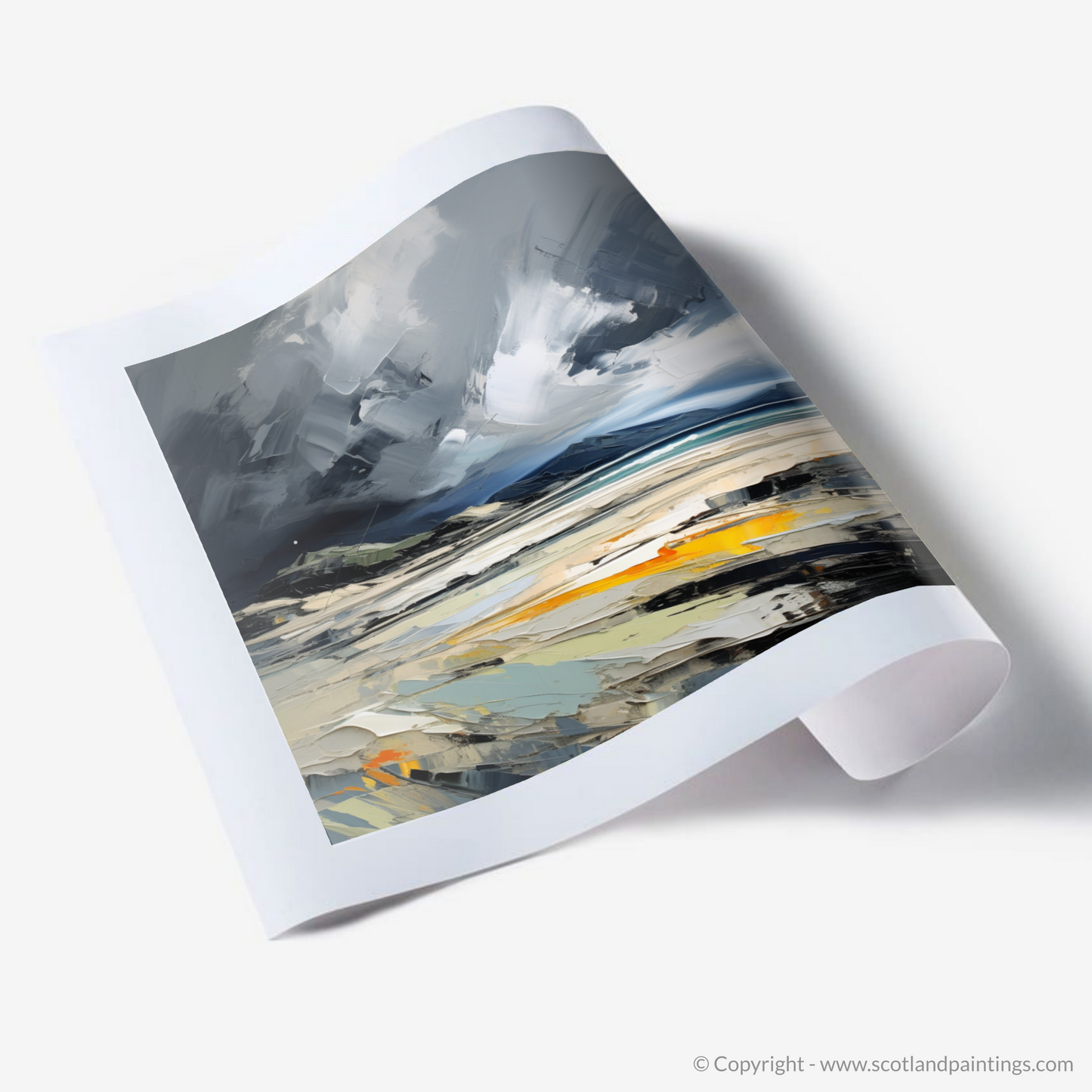 Experience the wild spirit of the Scottish coasts through this evocative print, capturing the raw beauty of Camusdarach Beach under the mood of an impending tempest. Bold strokes and a vivid palette converge to embody the tumultuous heavens, where shades of grey and white swirl together, forming a dynamic dance of clouds that seem to churn with the whispers of the oncoming storm.