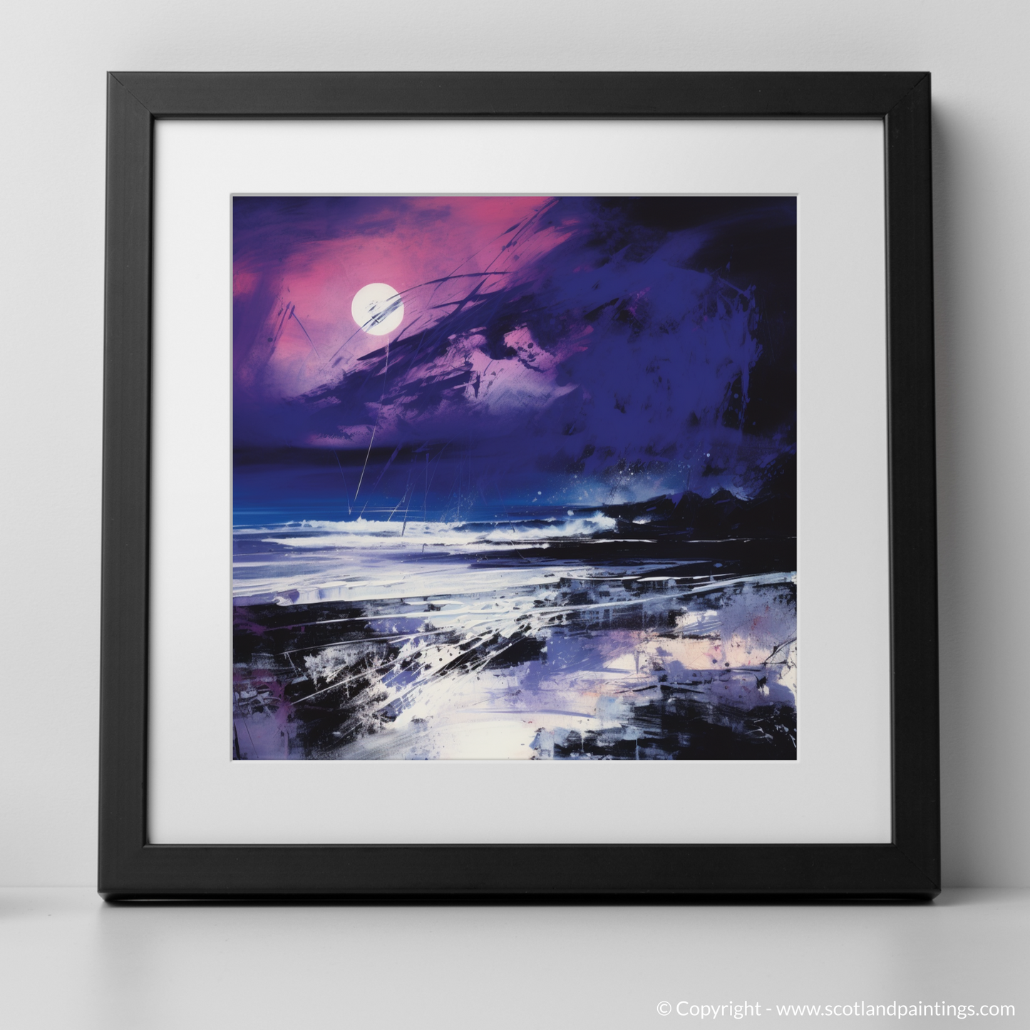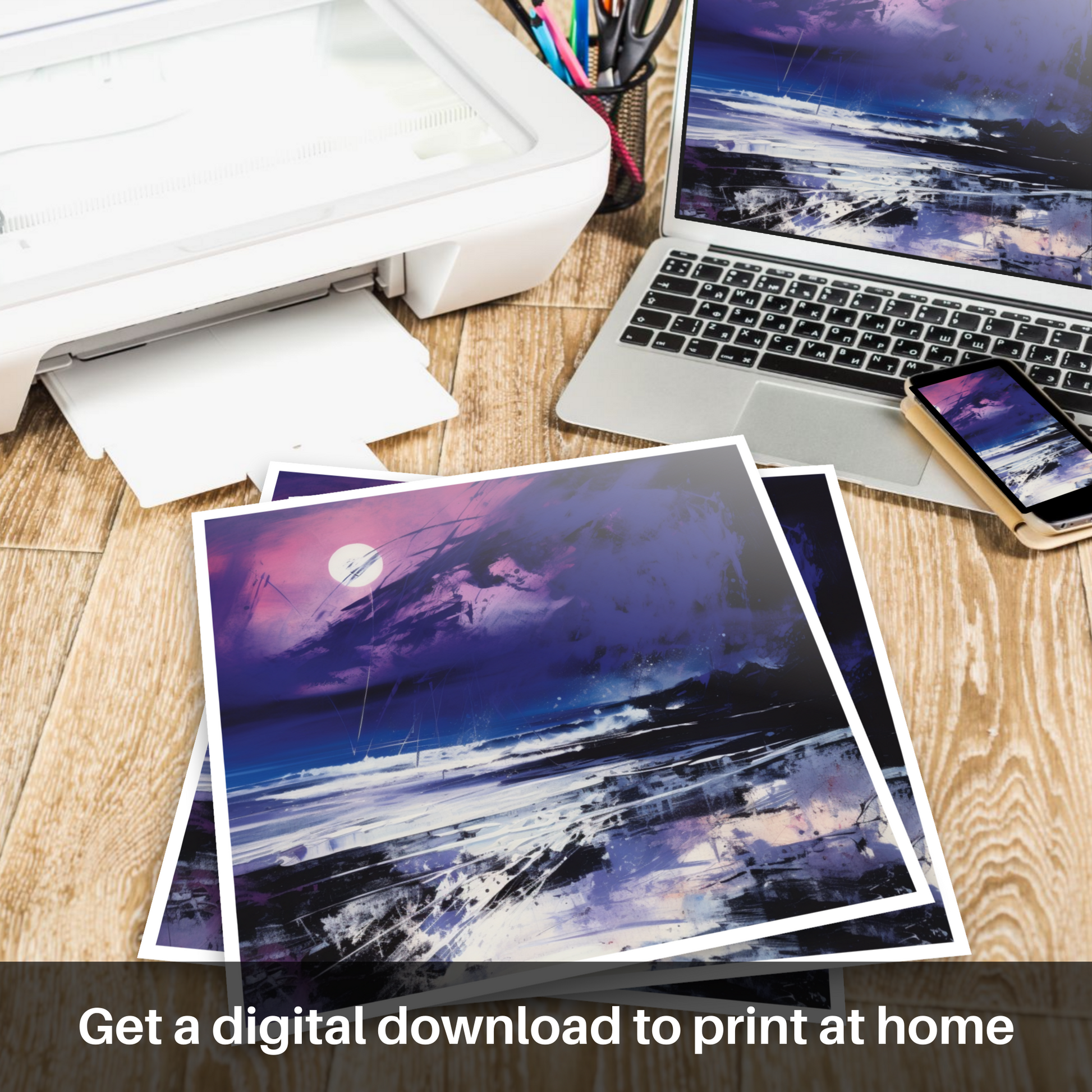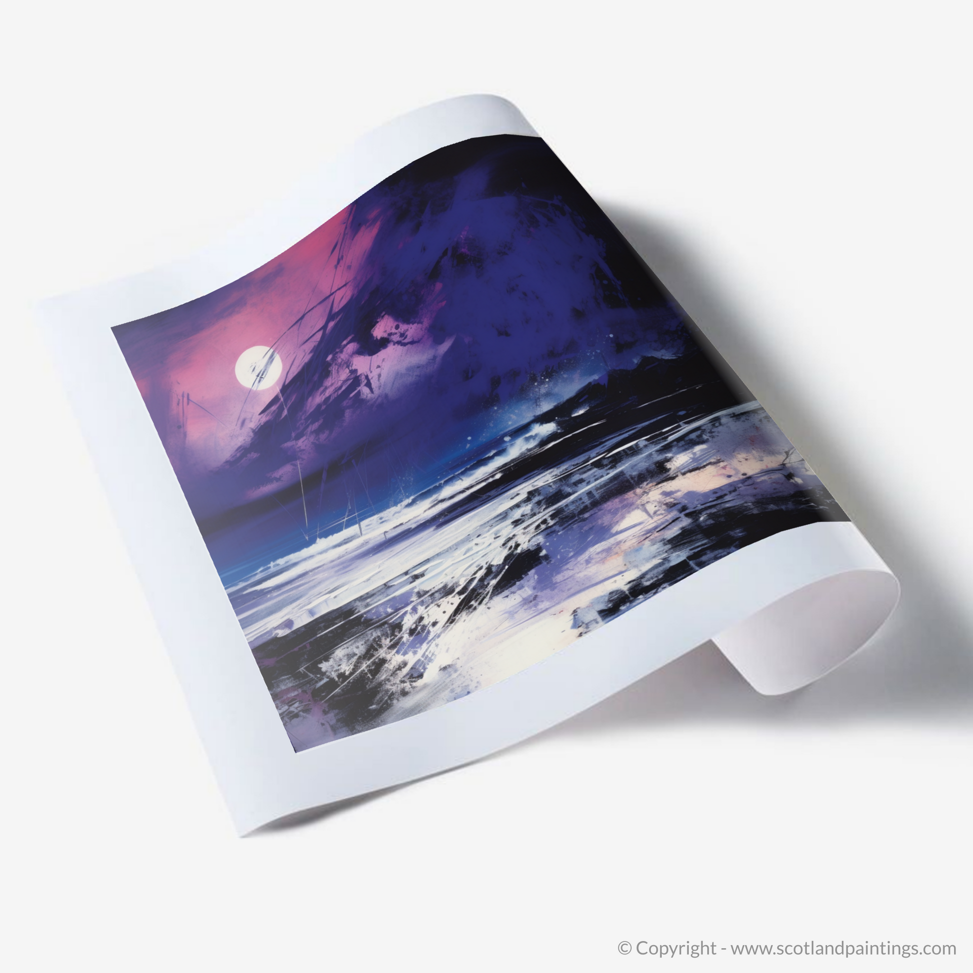 Swift brushstrokes and a tempestuous palette converge in this abstract representation of Camusdarach Beach, a vision where the wild Scottish coastline comes alive under a turbulent sky. This bold print captures the tumultuous energy of the Hebrides, with a stark contrast of deep, brooding purples and blues against stark whites, evoking the untamed power of nature.