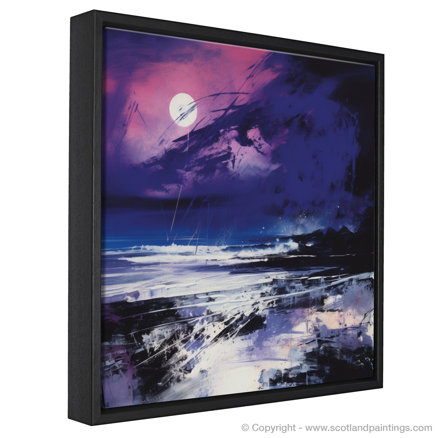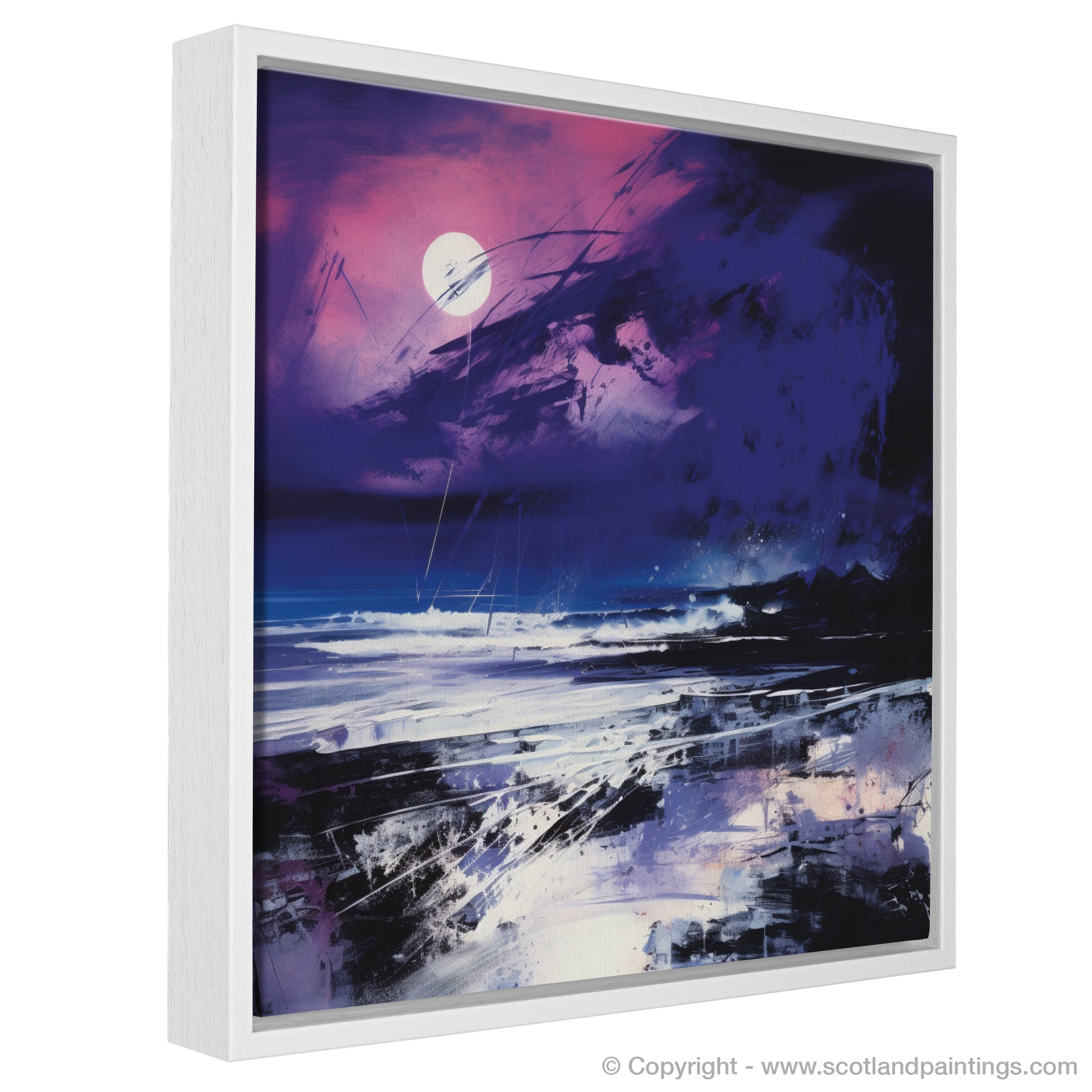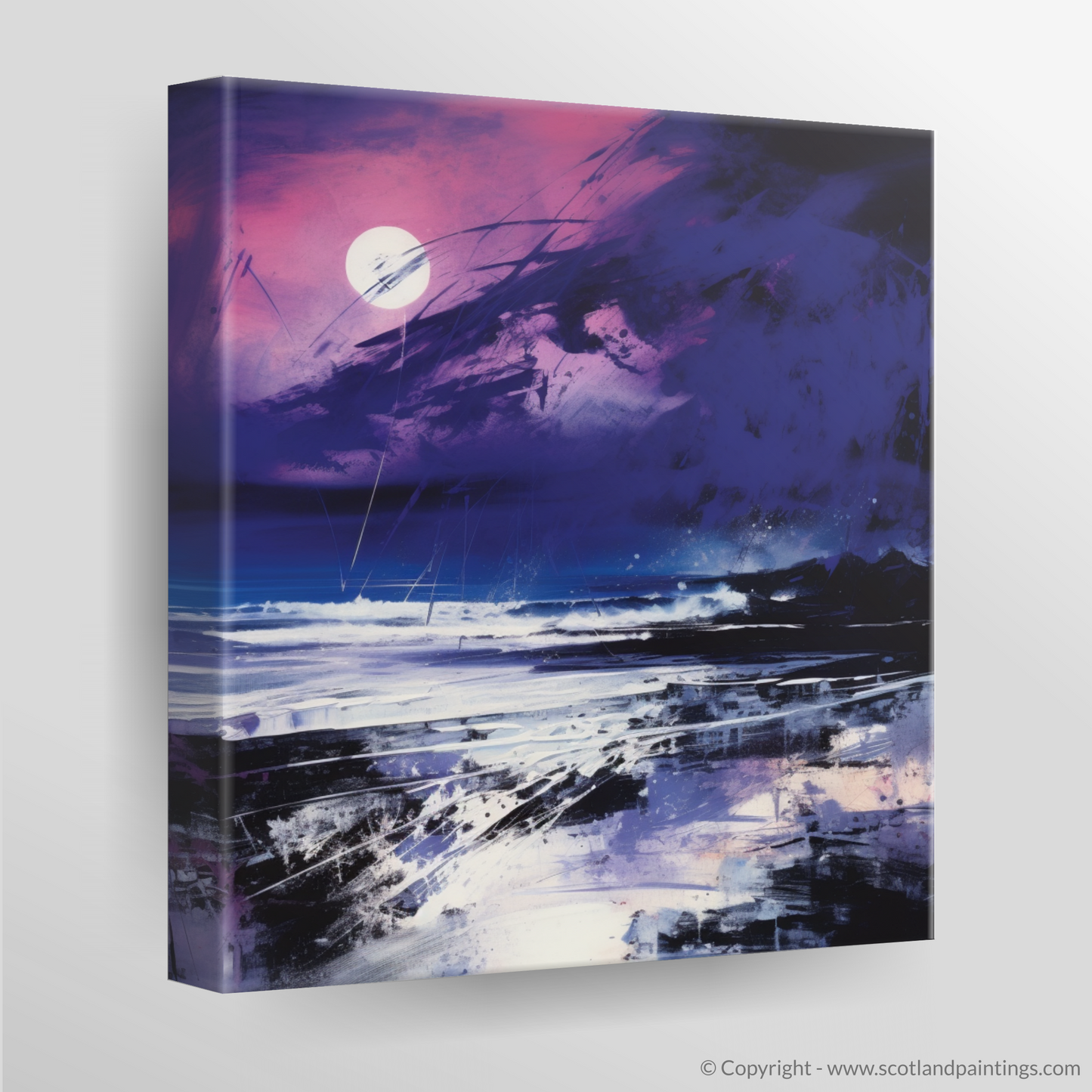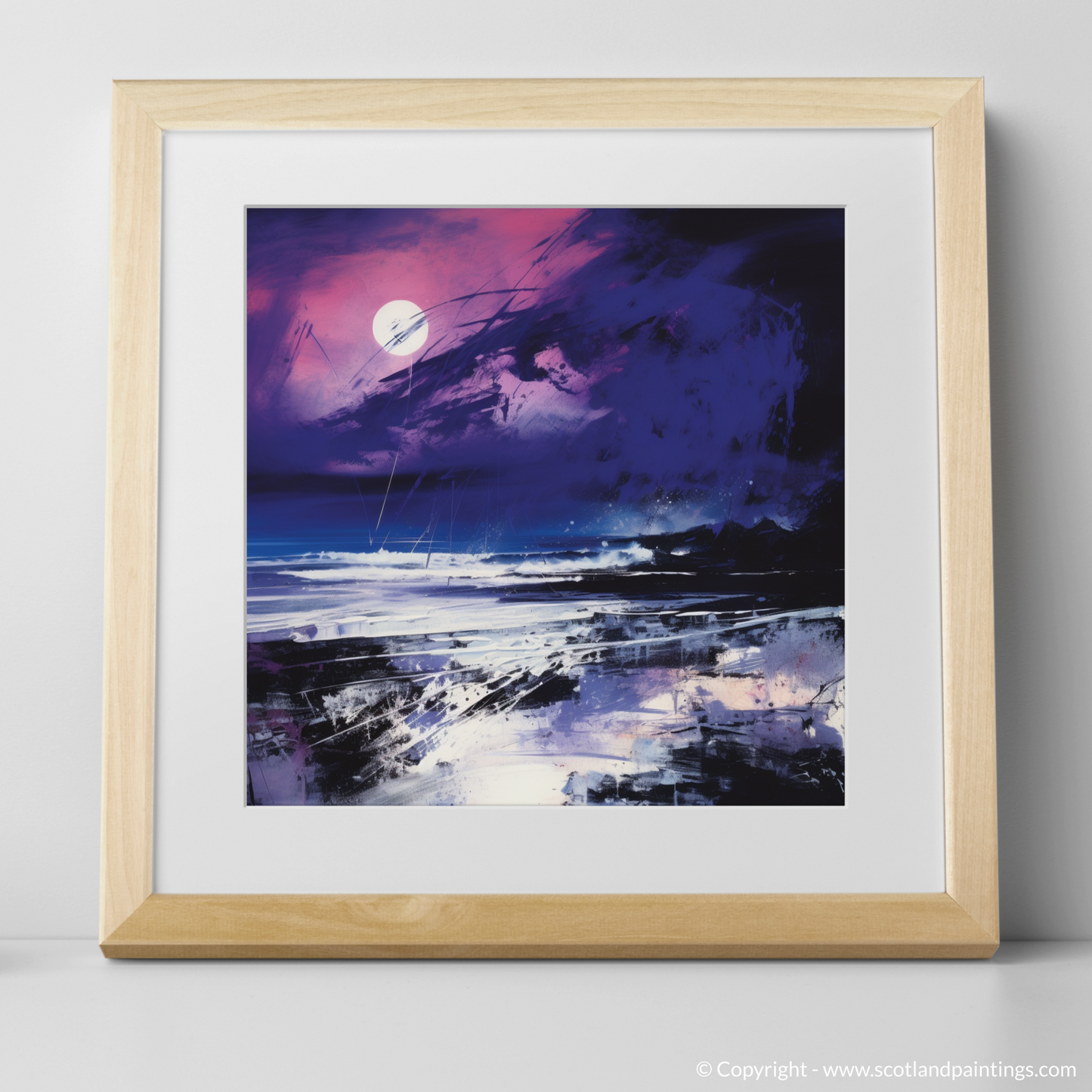 Swift brushstrokes and a tempestuous palette converge in this abstract representation of Camusdarach Beach, a vision where the wild Scottish coastline comes alive under a turbulent sky. This bold print captures the tumultuous energy of the Hebrides, with a stark contrast of deep, brooding purples and blues against stark whites, evoking the untamed power of nature.